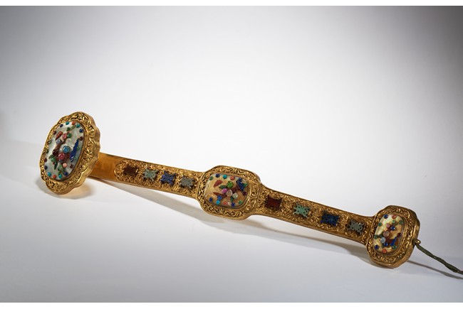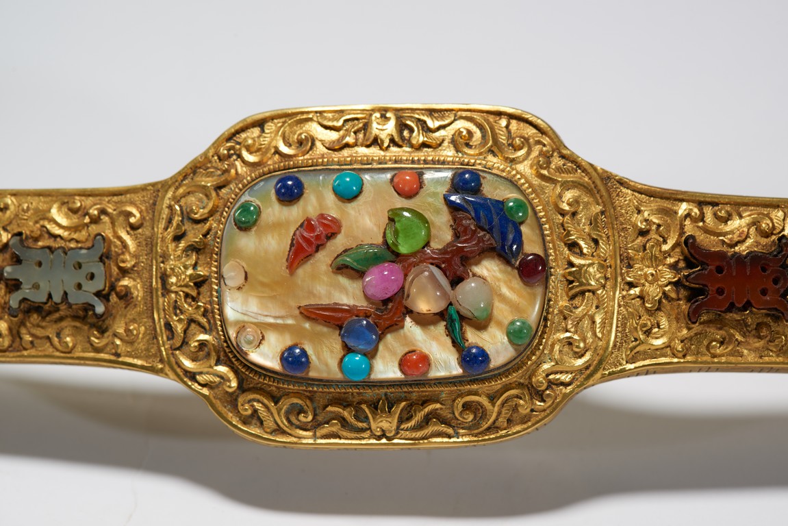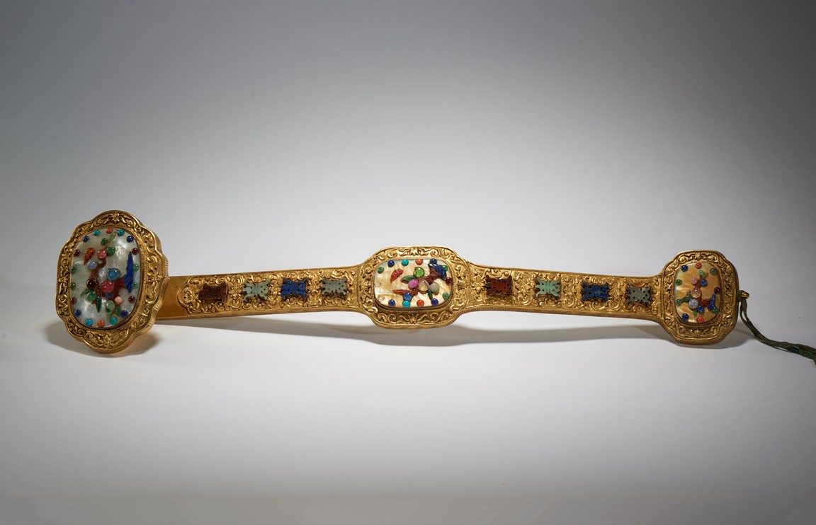 The head,center section,and tip inset with mother-of-pearl plaques,all inlaid with various jades and semi-precious gems including turquoise,jadeite,agate,lapis lazuli with scenes incorporating peach trees and auspicious bats,the shaft inlaid with stylized shou characters inlaid with similar gems against raised lotus floral scroll ground. Qing Dynasty period.