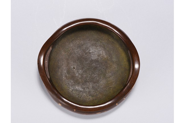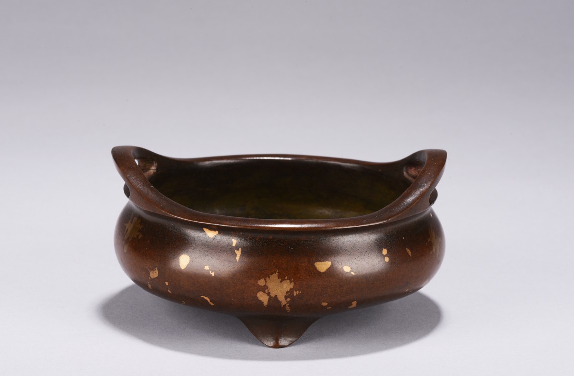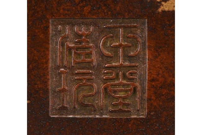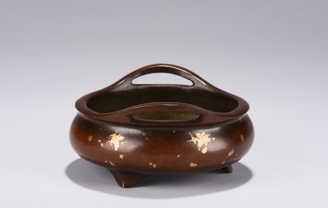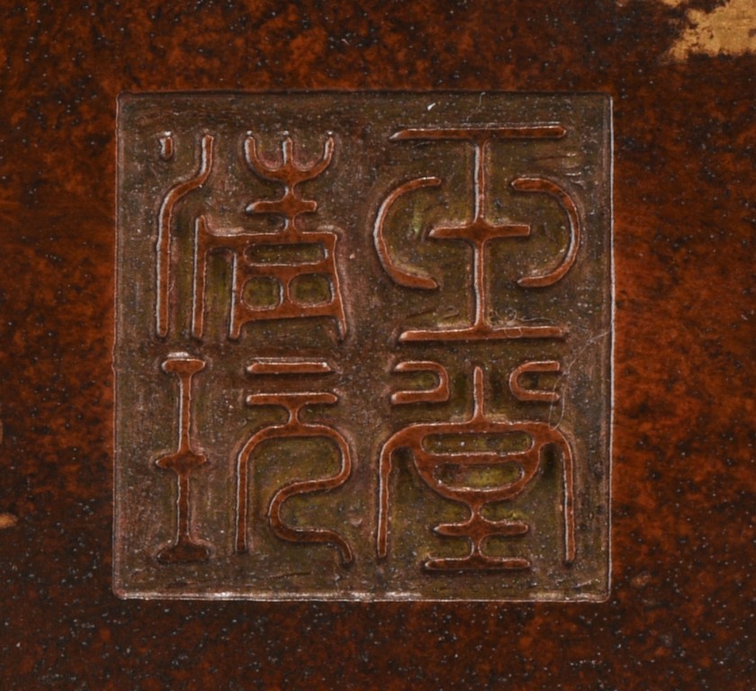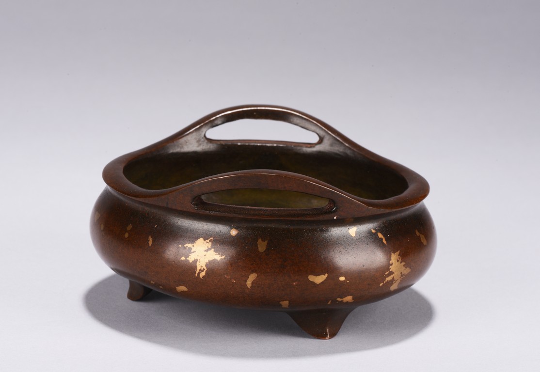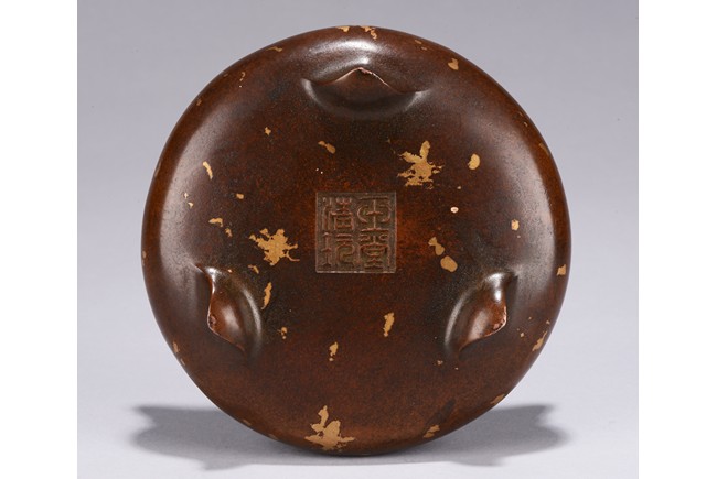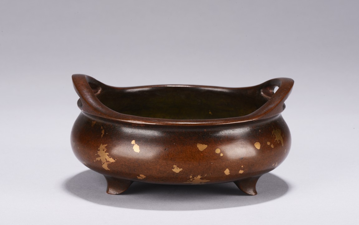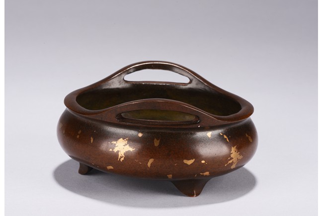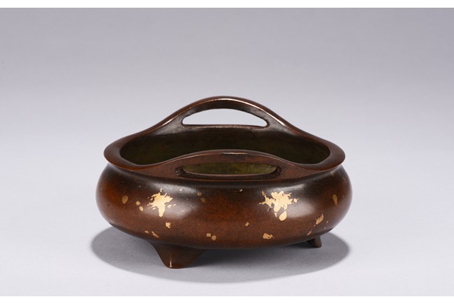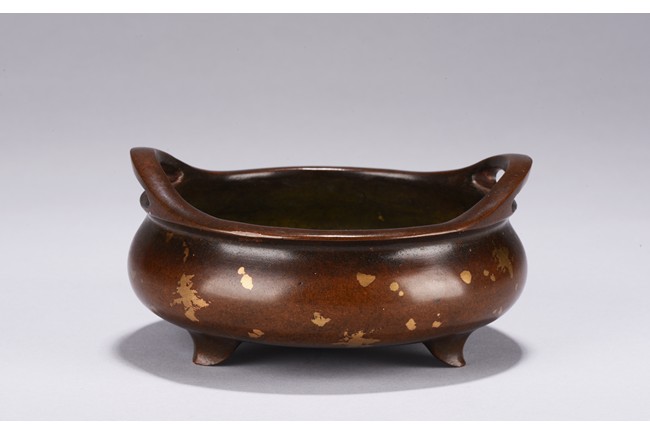 Of compressed globular body rising to a flared rim from a short foot,flanked by two angular handles. decorated overall a rich coppery-brown color with scattered gold splashed spots. The base with four character mark.Republic Period.