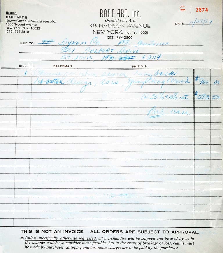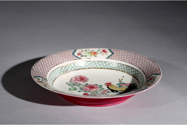 胭脂紅釉為雍正時期名貴品種,器內常以五彩、粉彩繪人物、花鳥、瑞果等圖案,繪山水者十分少見。拍品與英國大維德東方藝術基金會藏品紋飾布局、風格相類(參見《大維德東方藝術基金會藏中國瓷器》,第二冊,編號862),繪工精細,氣韻典雅,具有雍正時期粉彩的典型特征。折沿盤胎體輕薄堅致,外壁施胭脂紅釉,釉色勻凈純美,折沿內於花卉錦地紋上設三組開光,內繪荔枝、石榴、佛手三多果實及薔薇、牡丹、雛菊等花卉;盤心以粉彩繪雉雞牡丹,整圖繪畫的栩栩如生,描繪生動,層次分明,或以當時名家的山水畫作為粉本繪制。來源:原藏家1984年購於紐約Rare Art Inc 附發票 Provenance: Acquired from Rare Art Inc. in 1984