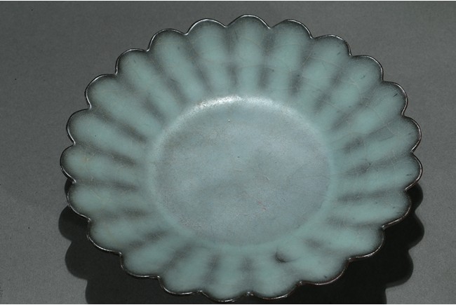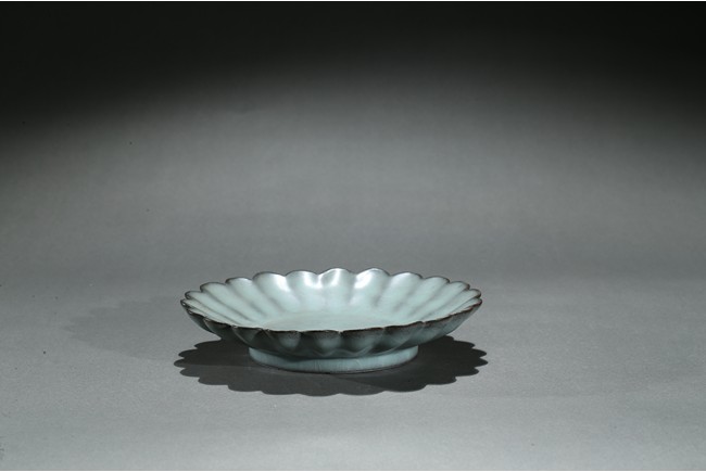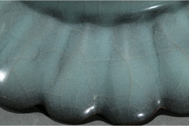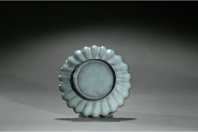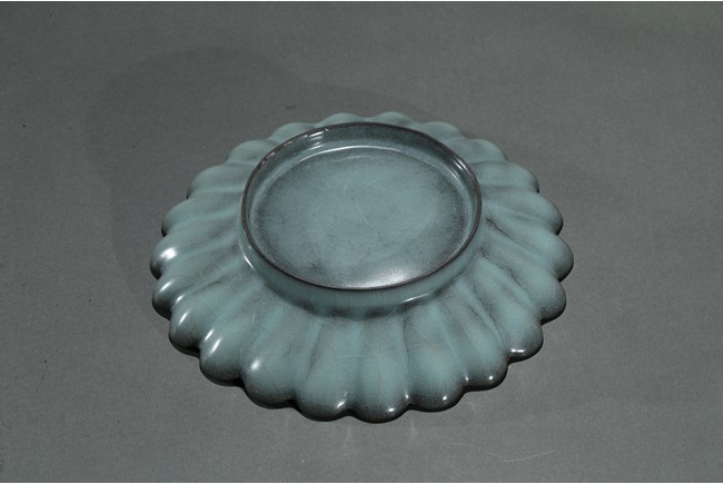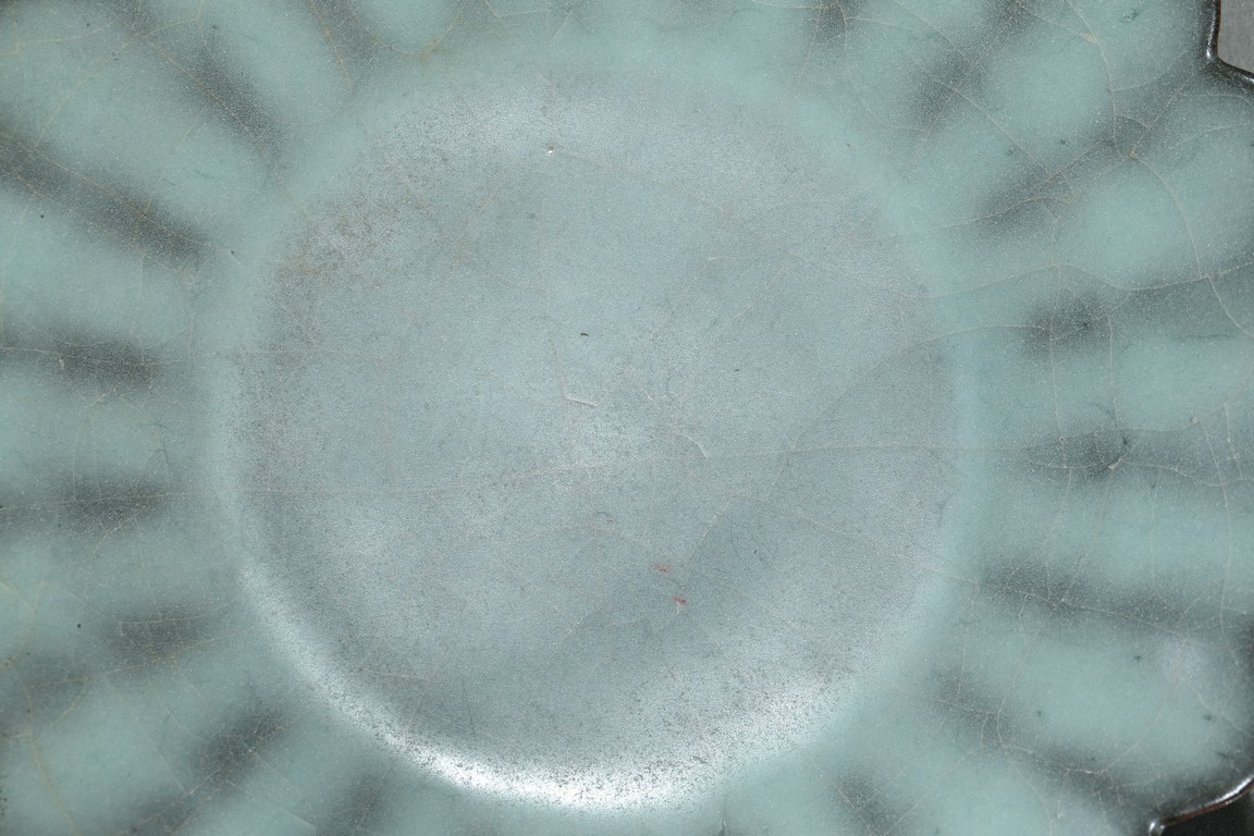Evenly potted with narrow sides and pointed tips resembling the petals of a chrysanthemum flower,radiating around a slightly recessed center,overall covered with bluish-green glaze. Qing Dynasty period.