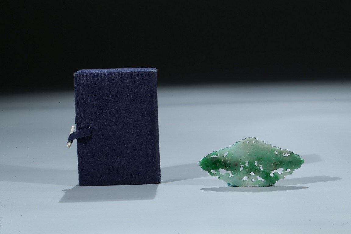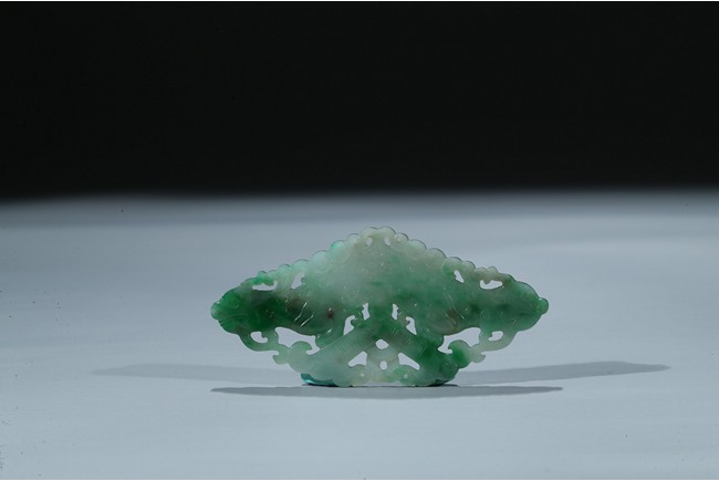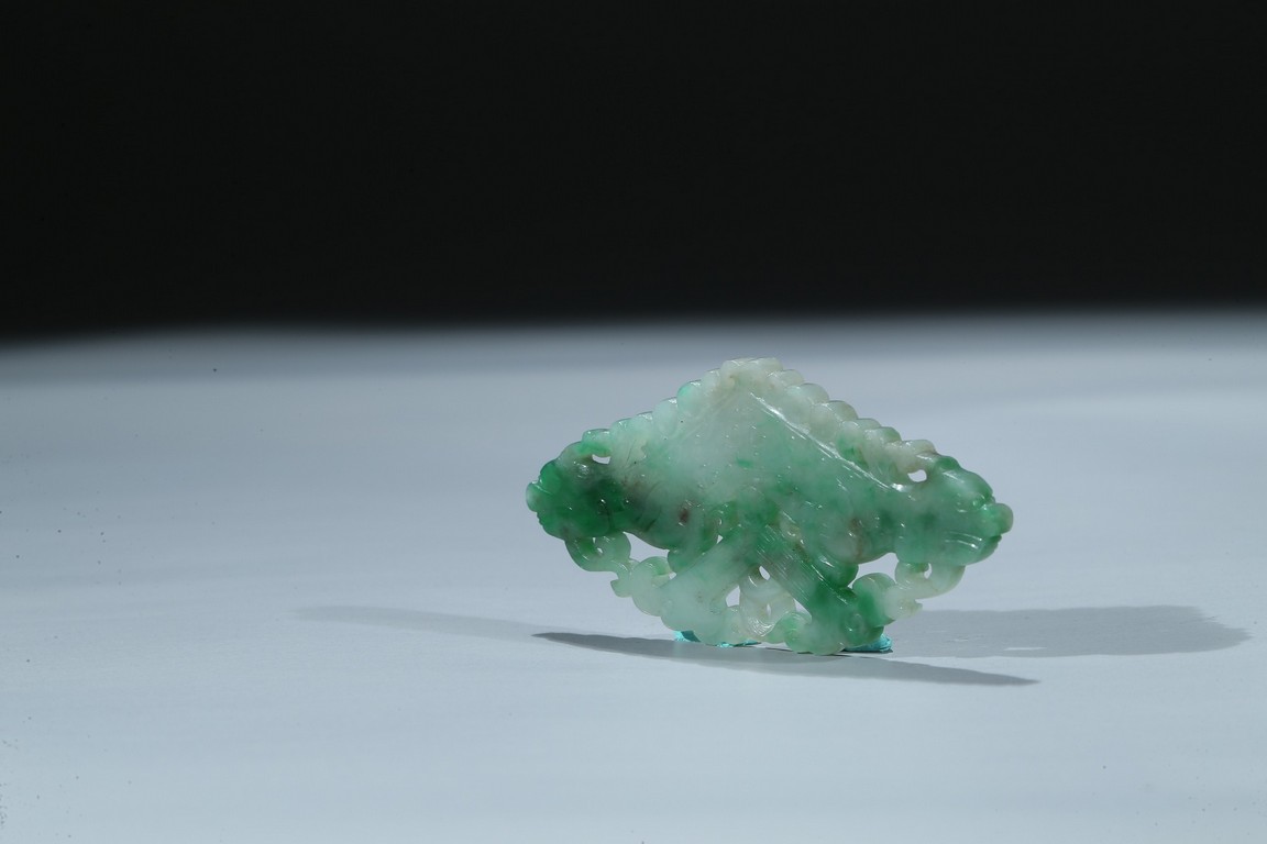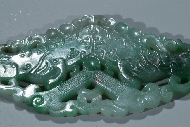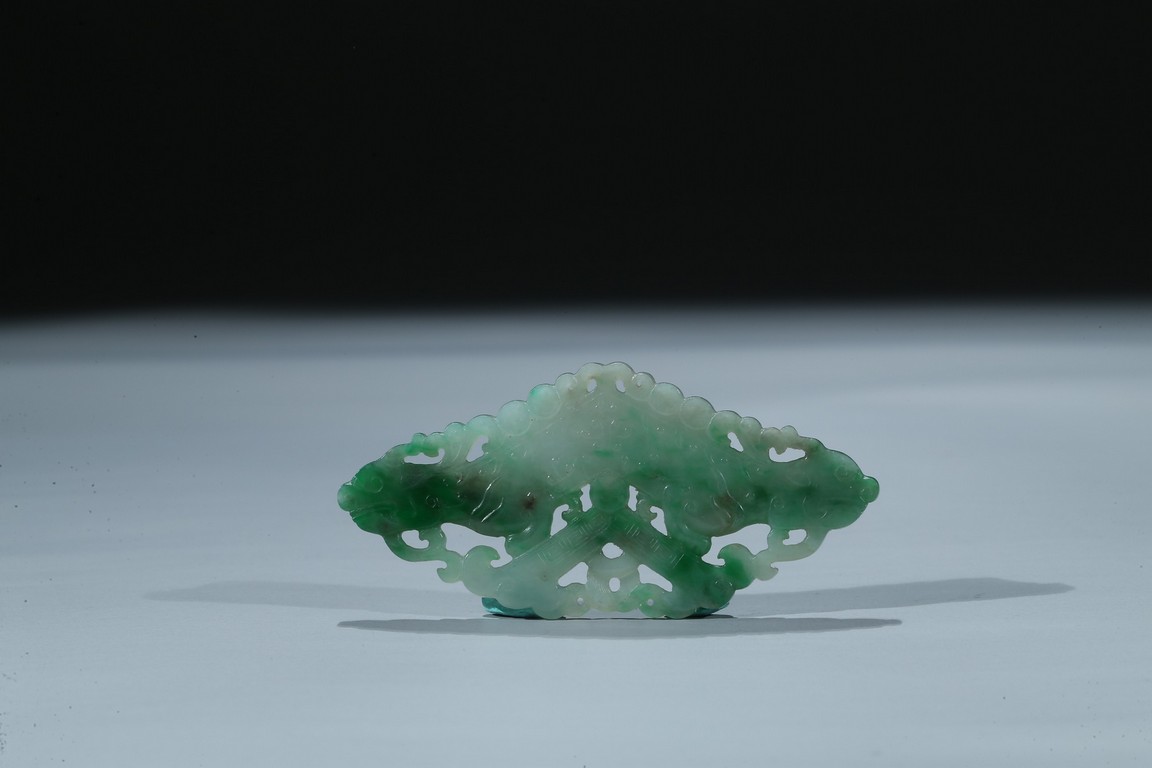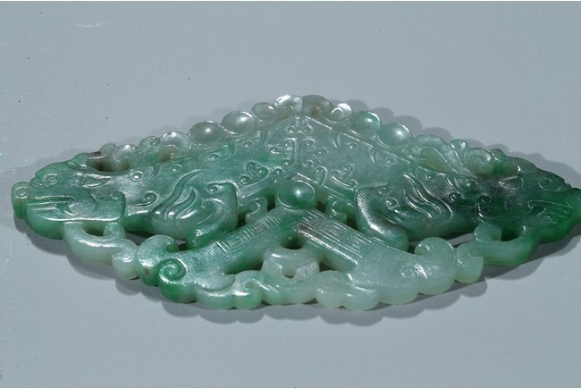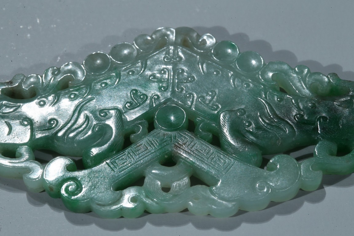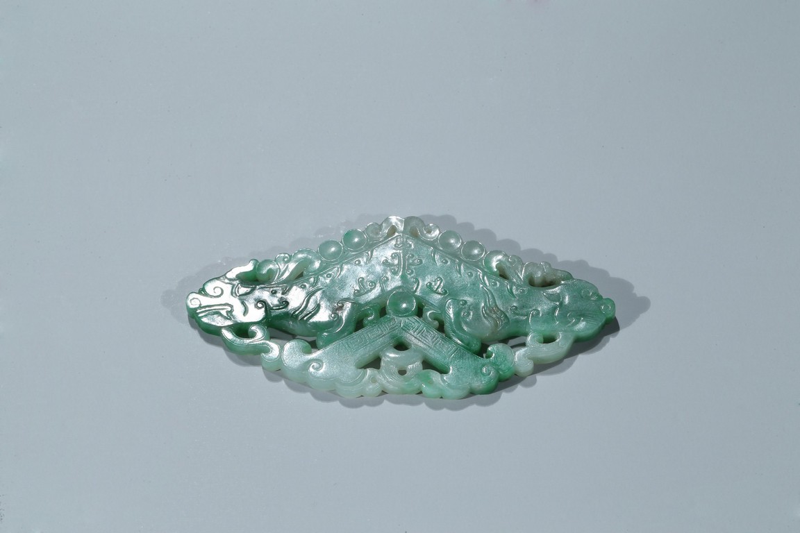 Of rhombus form, the pendant is carved and pierced to depict a two head qilin beast to both ends, the head, body, and feet are incised with vivid details, the stone is of translucent greenish white tone.