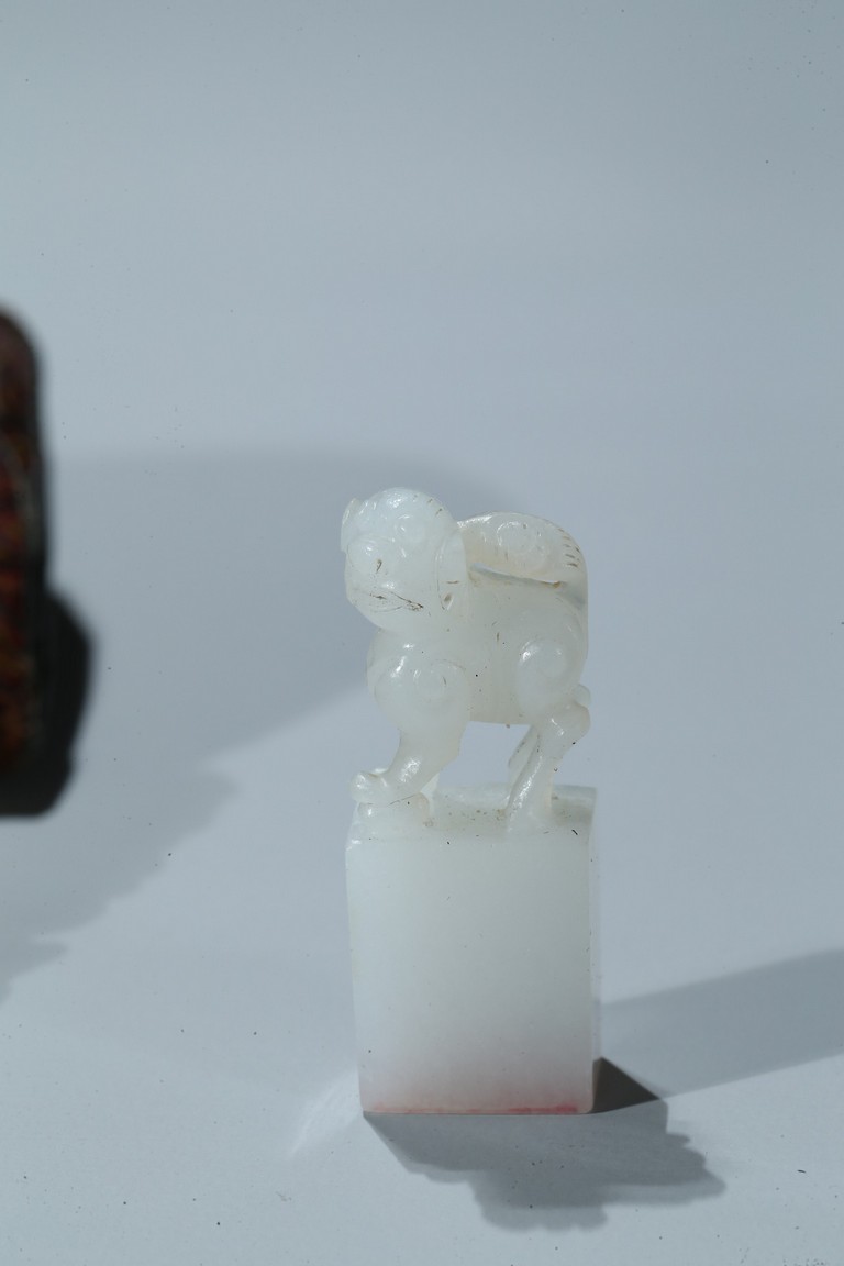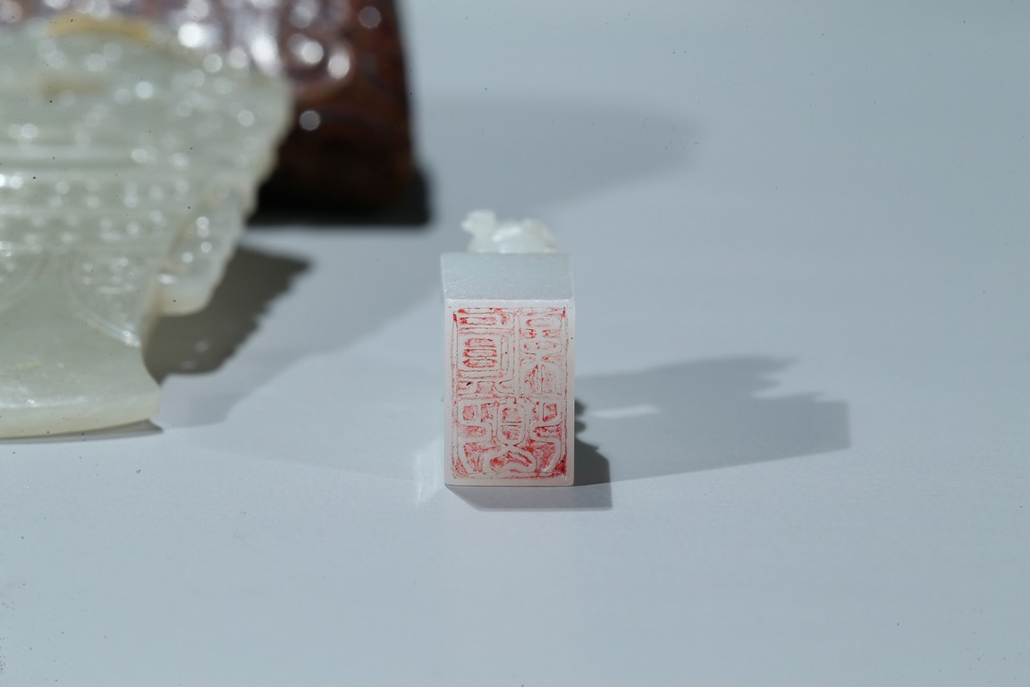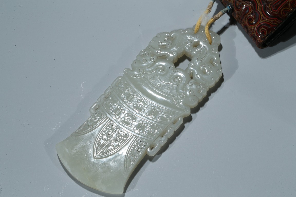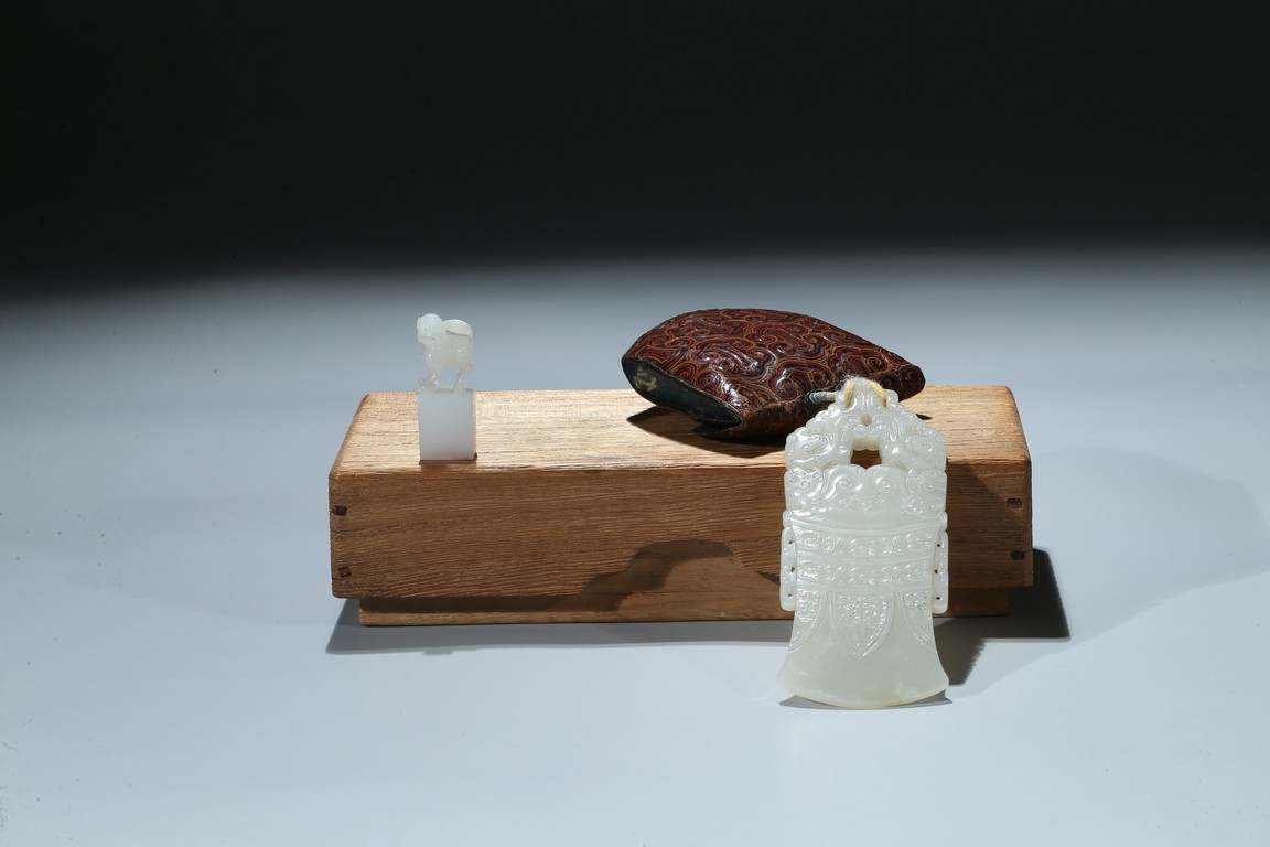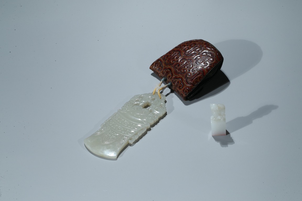 Comprising of a white jade seal surmounted with a standing lion, the seal face carved with two character inscription; a white jade carved axe blade with gently beveled edges and two apertures to the top carved in shallow relief with bands of ruyi scrolls and stiff lappets.