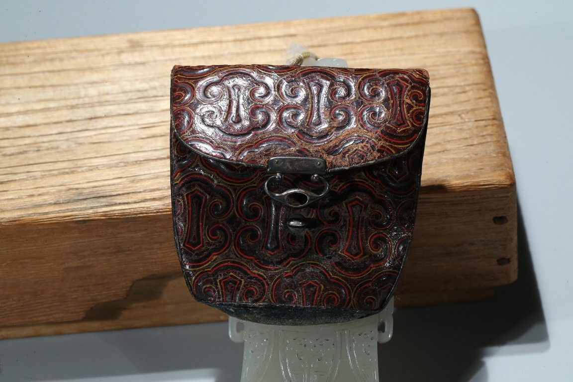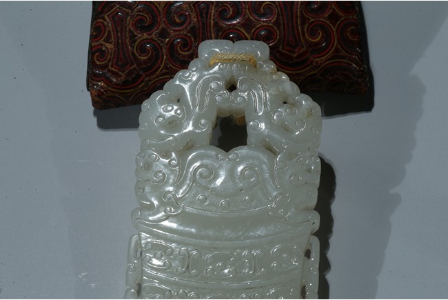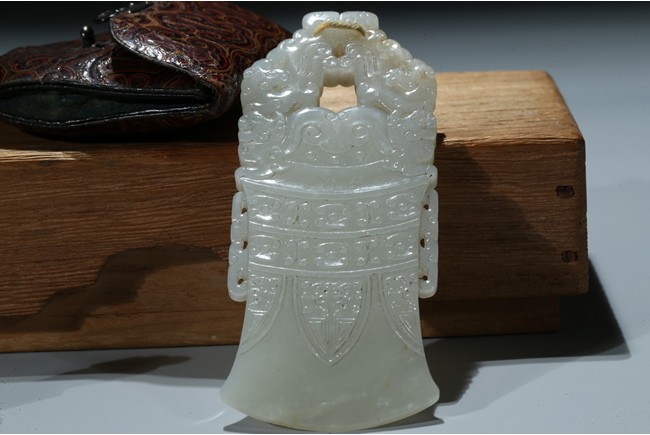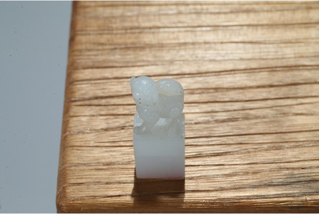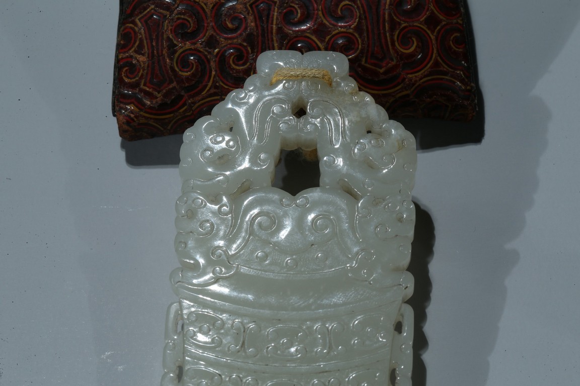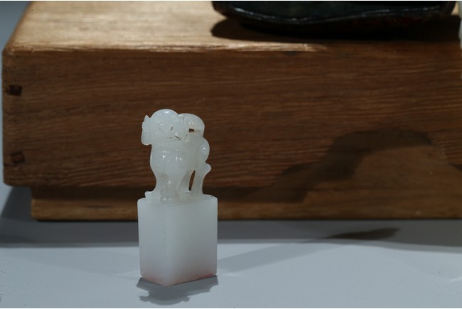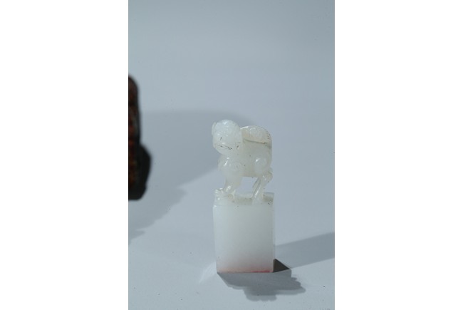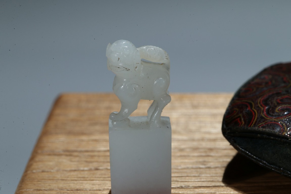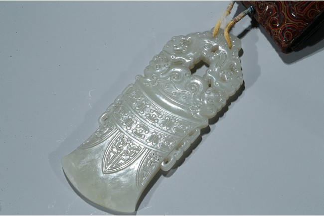 Comprising of a white jade seal surmounted with a standing lion, the seal face carved with two character inscription; a white jade carved axe blade with gently beveled edges and two apertures to the top carved in shallow relief with bands of ruyi scrolls and stiff lappets.