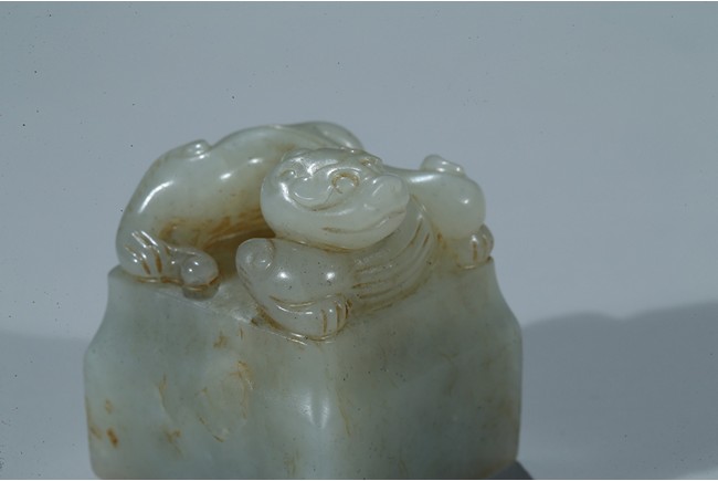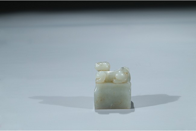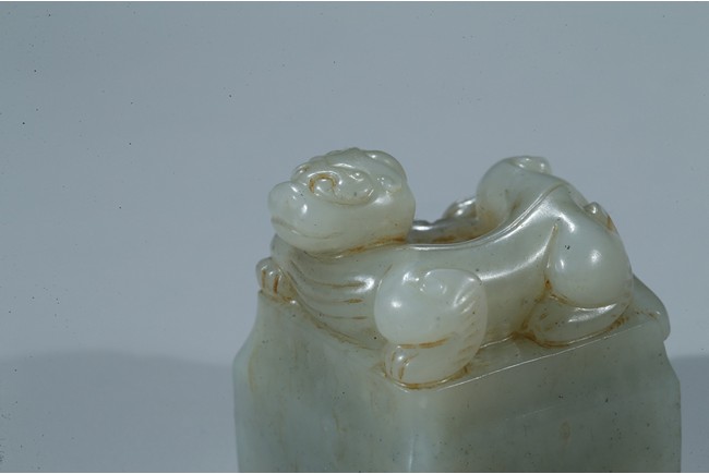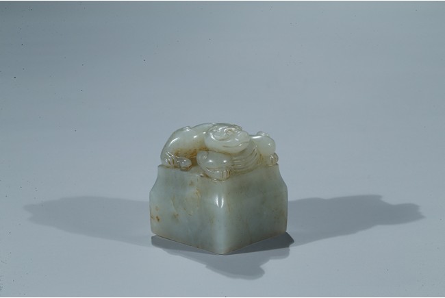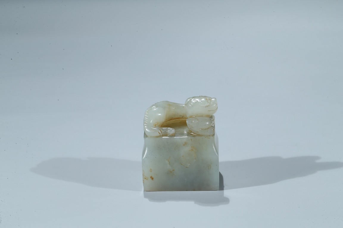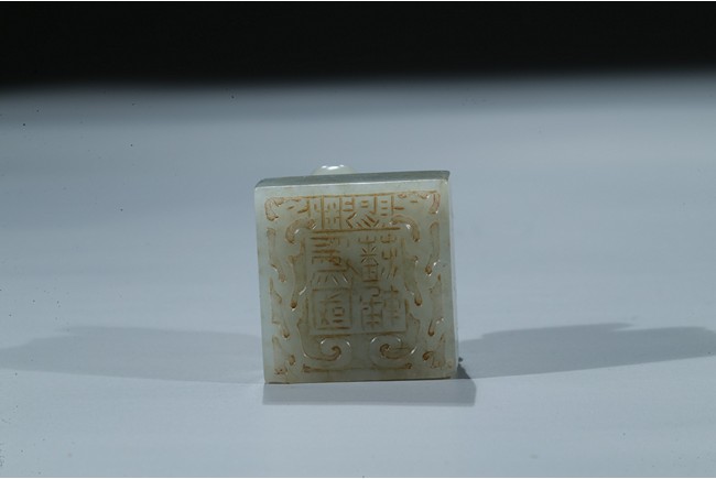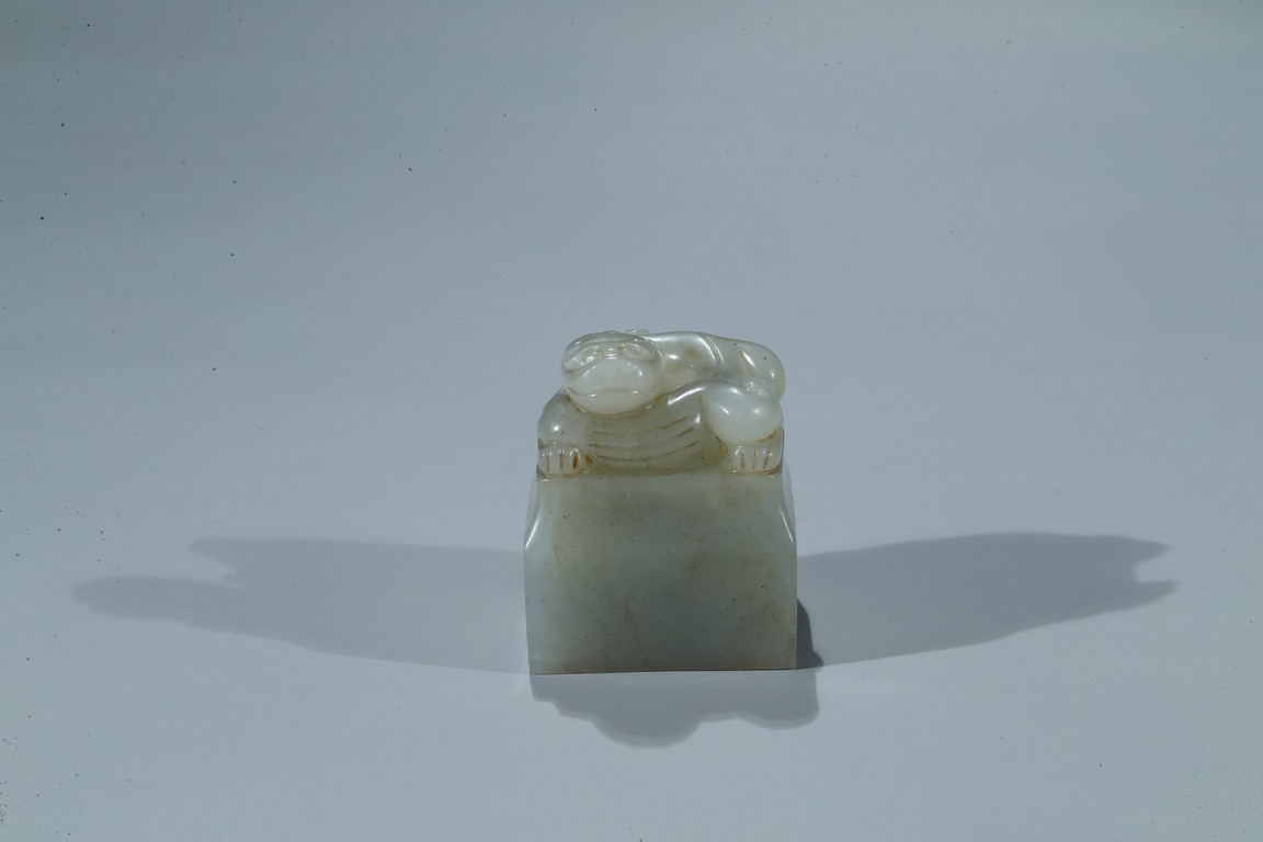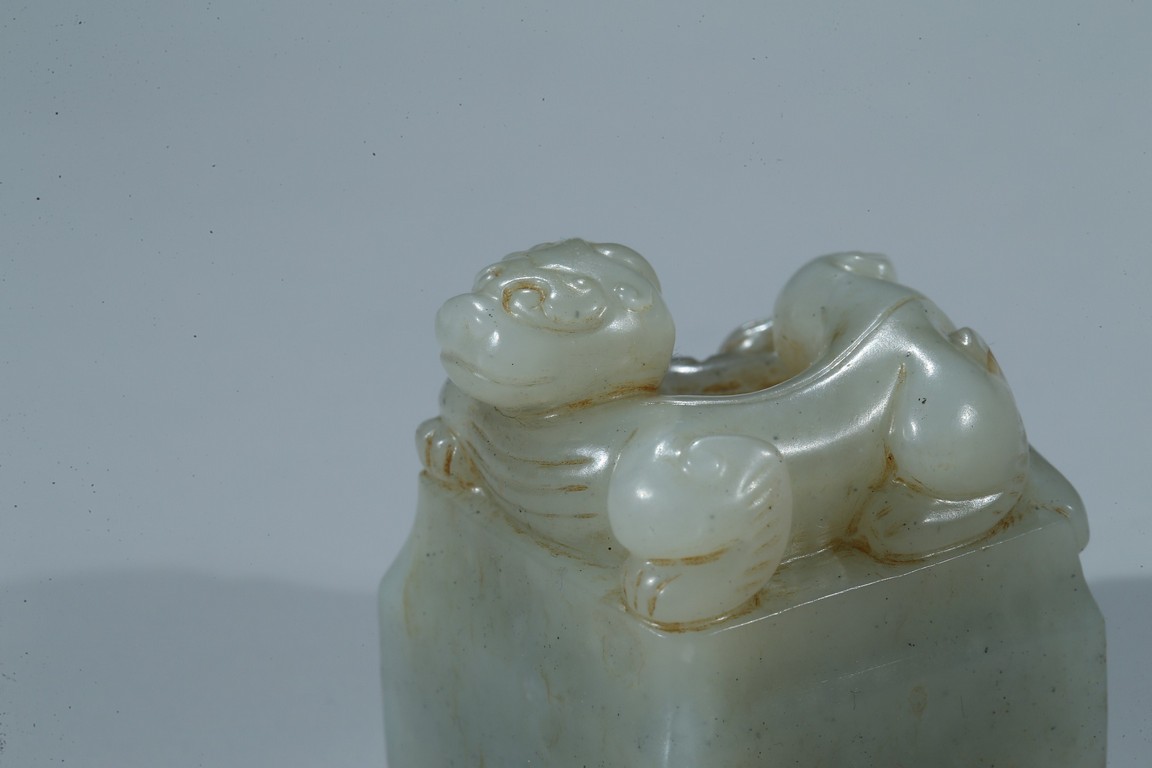 Of square section, top surmounted with a twisting chilong, seal face carved with four character inscription.