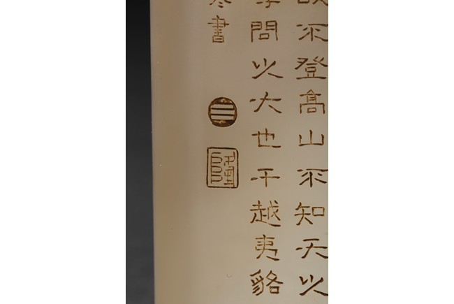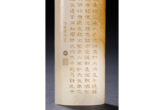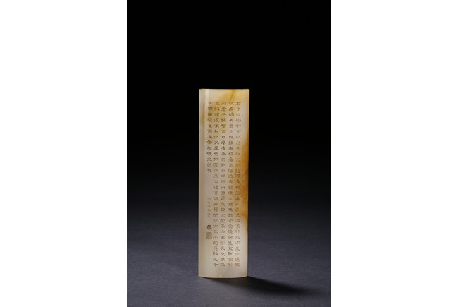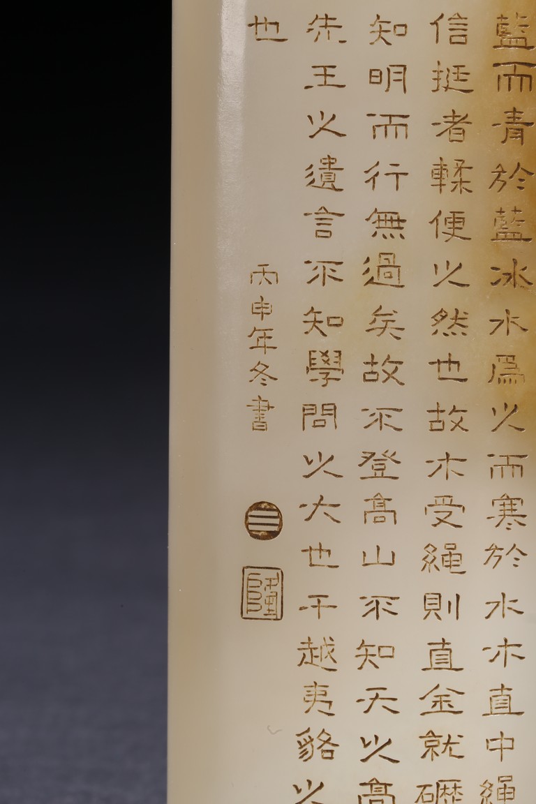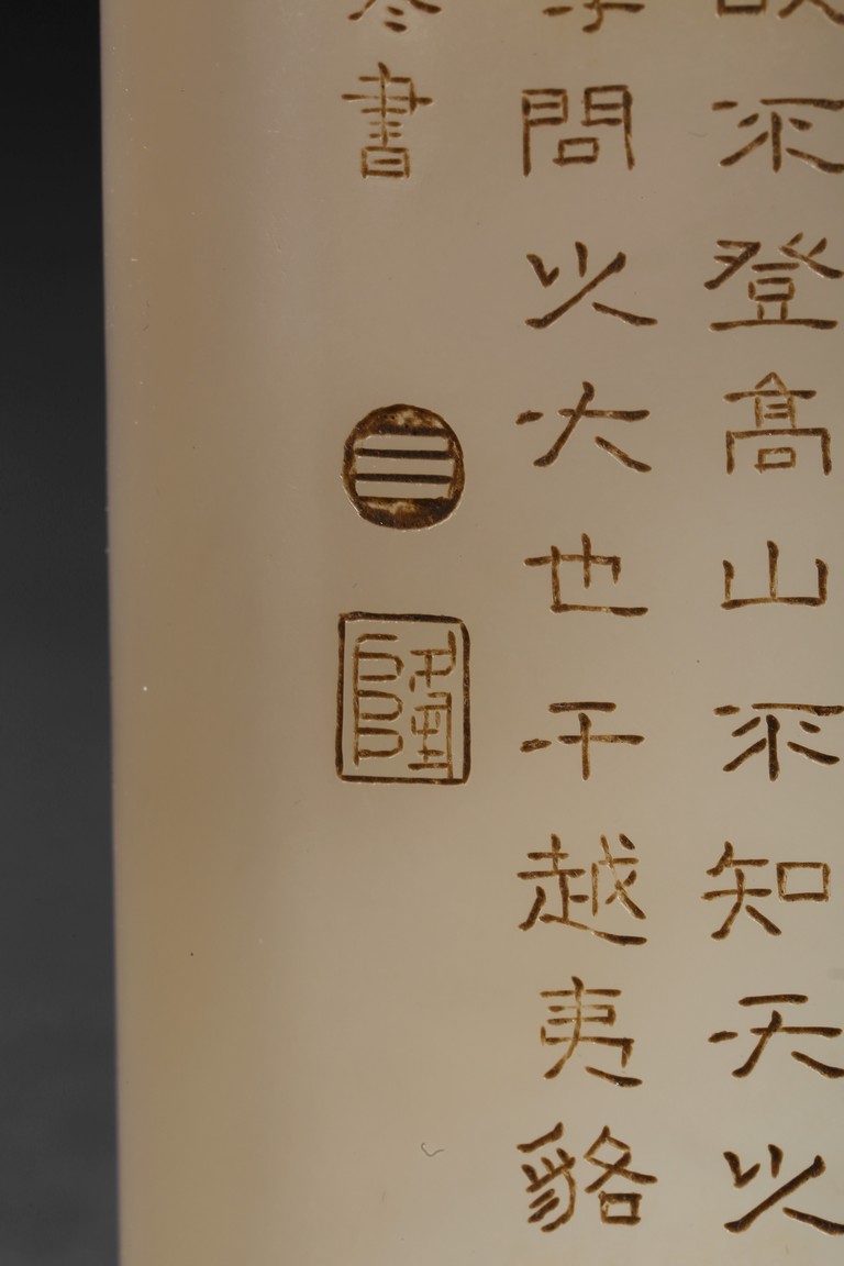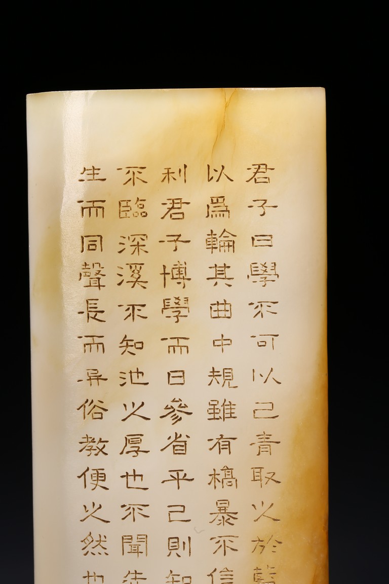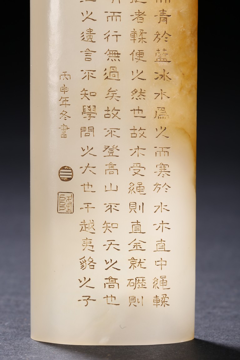 Of rectangular shape and slightly arched in form,the top carved with imperial poem and with two seal marks,the stone is of translucent white tone with yellow inclusions. Qing Dynasty period.