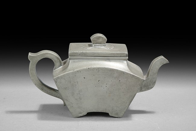 Pewter exterior,the teapot’s body is of fan shape,with sharp rectangular openings,bridge-arc-like base,and brown-red zisha interior. Bottom bears four characters mark. Qing Dynasty period.