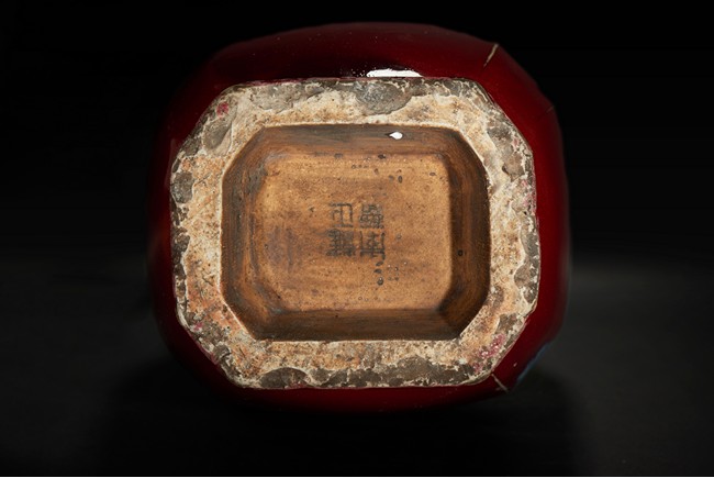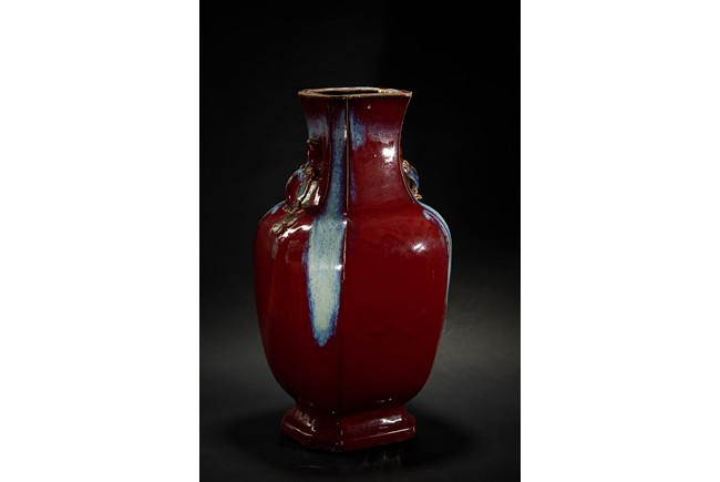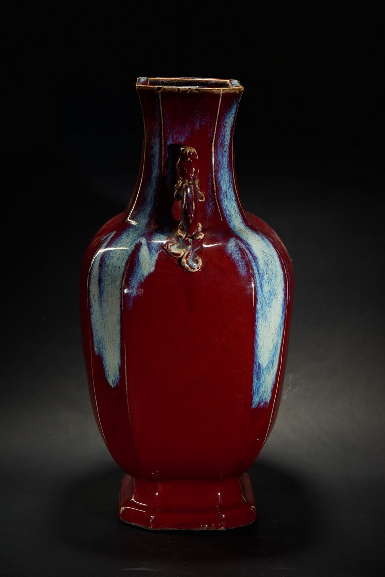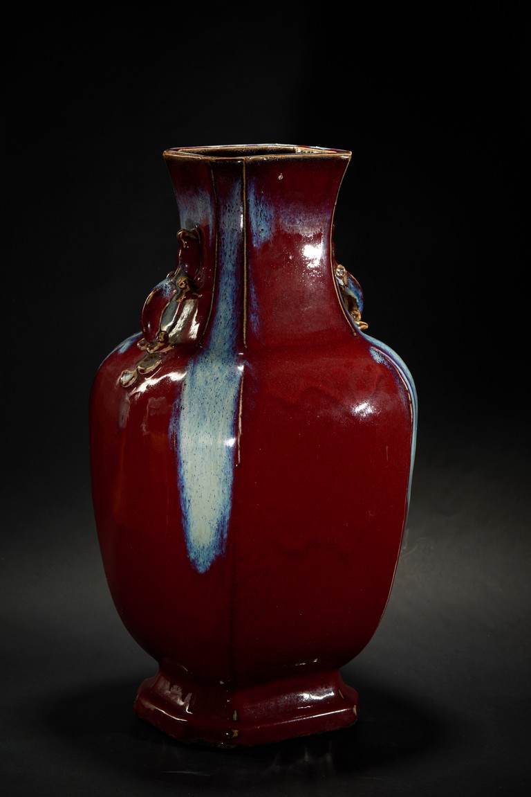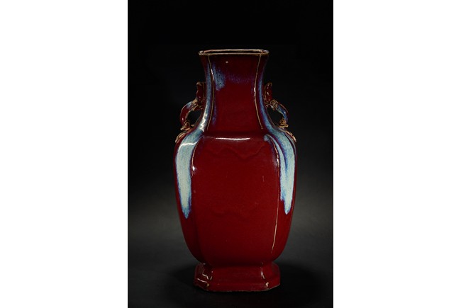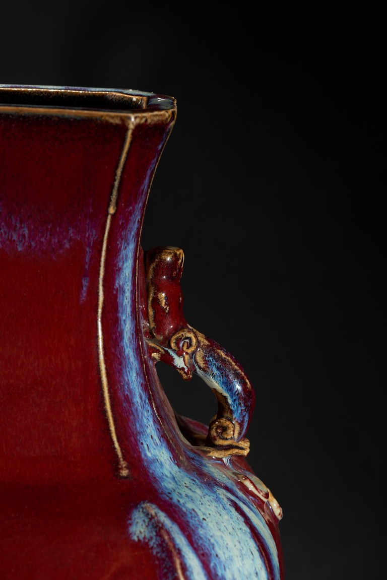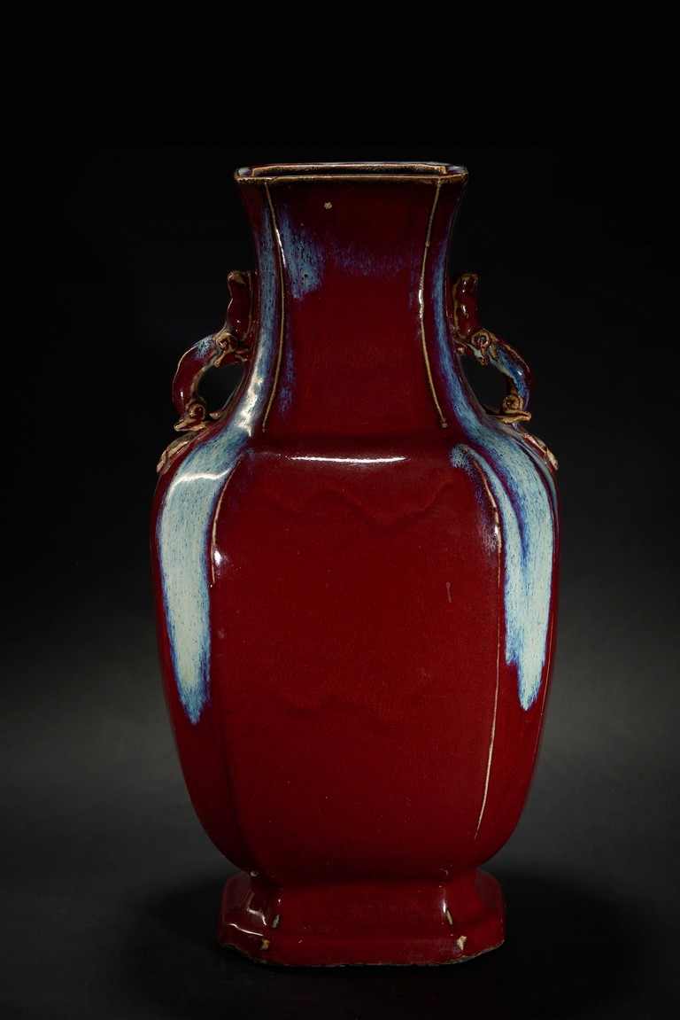 The vase is overall suffused to the exterior with opaque red glaze streaked with sky blue from neck to the body,the neck flanked by a pair of chilong handles,the base incised with four character Yongzheng mark. Qing Dynasty period.