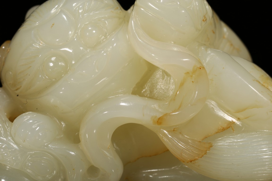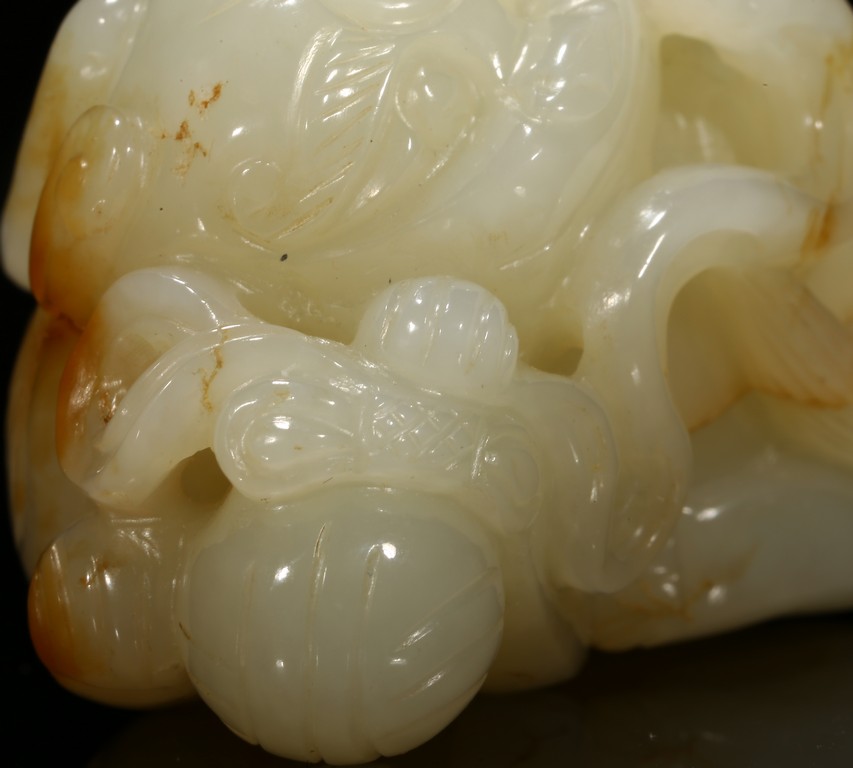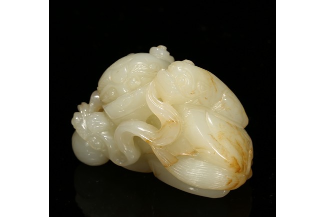 The buddhist lion finely carved lying with its front paw resting on a brocade ball and its cub on its back,the stone of a well polished white tone suffused with slight russet inclusions. Qing Dynasty period.
