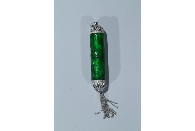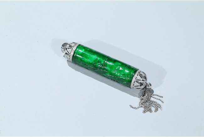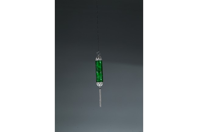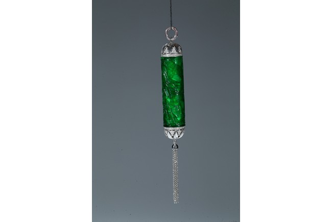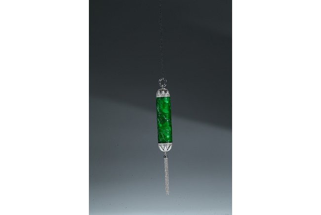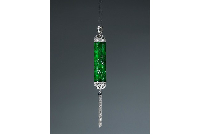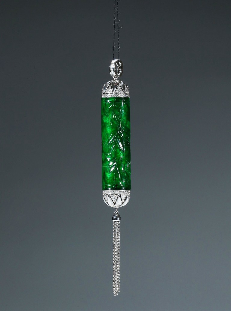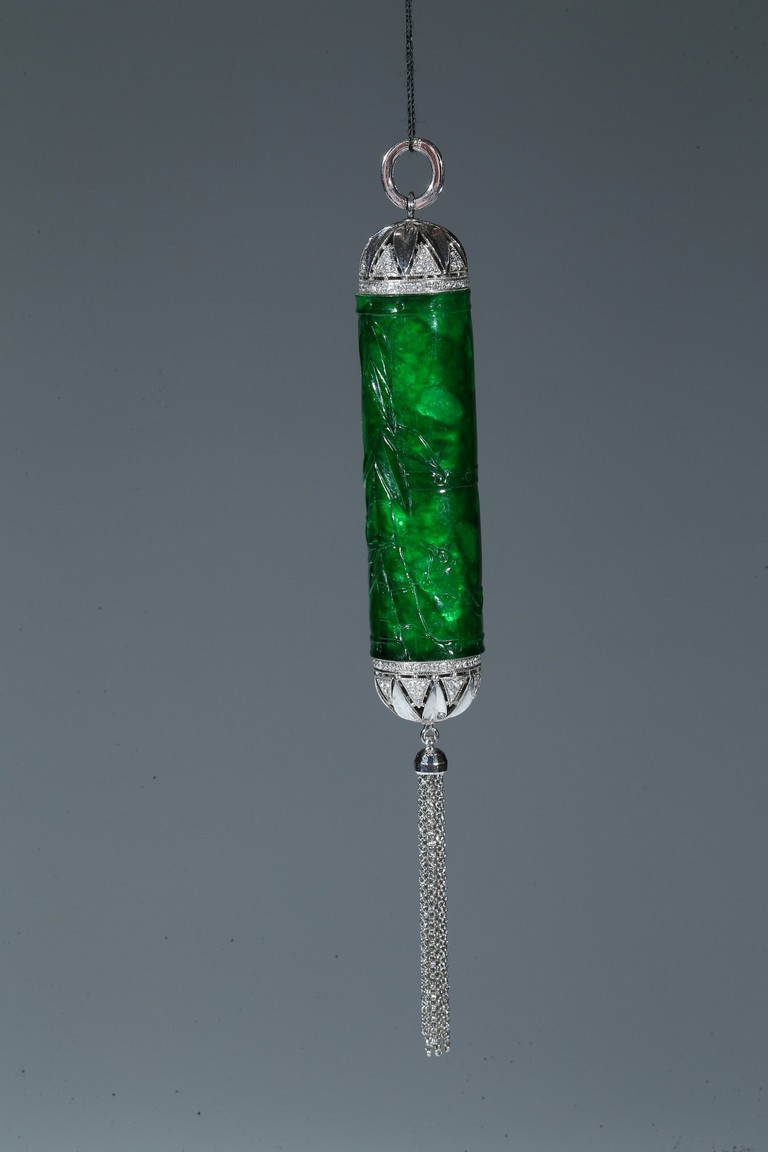 Set with a jadeite with high translucency and bright green color with bamboo design, set to both sides with diamond and white gold.