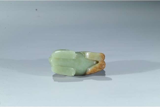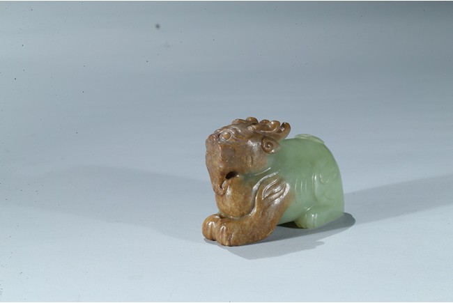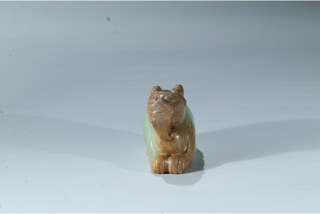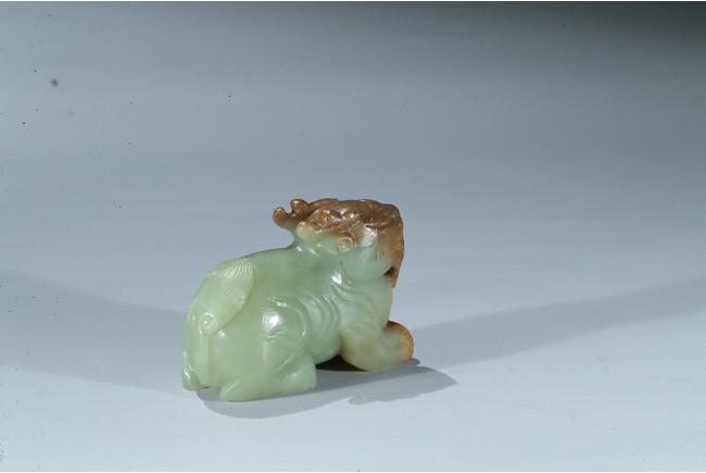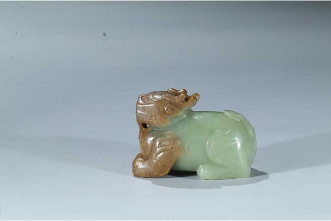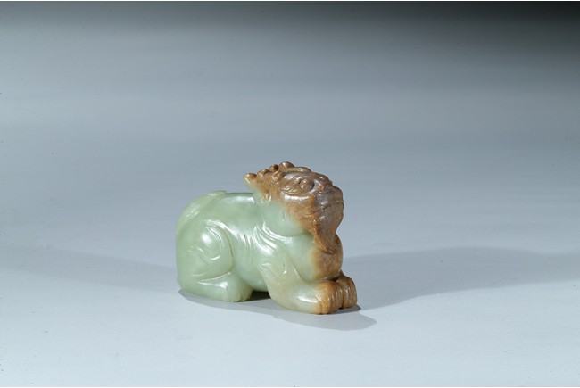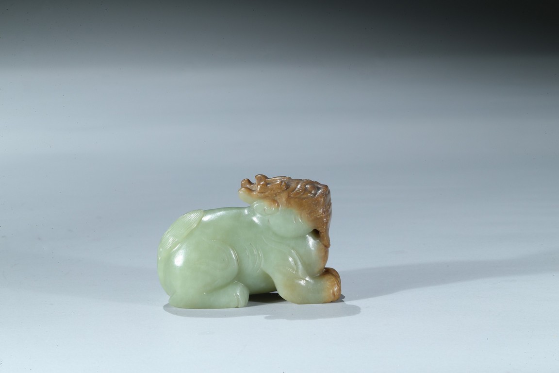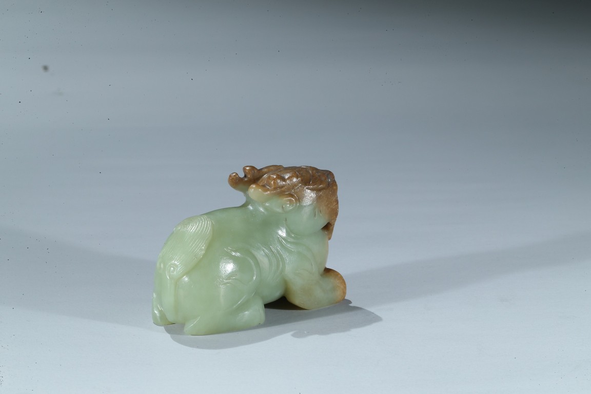 Carved as a recumbent mythical beast facing forward, with bulging eyes, broad mouth, and characteristic horns, its tail finely carved with incised lines, the stone is of celadon tone with russet inclusions. Qing Dynasty period.