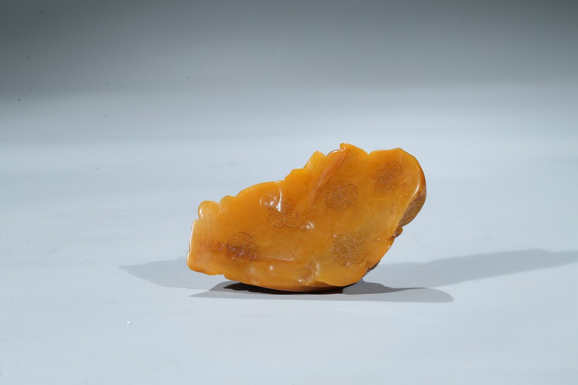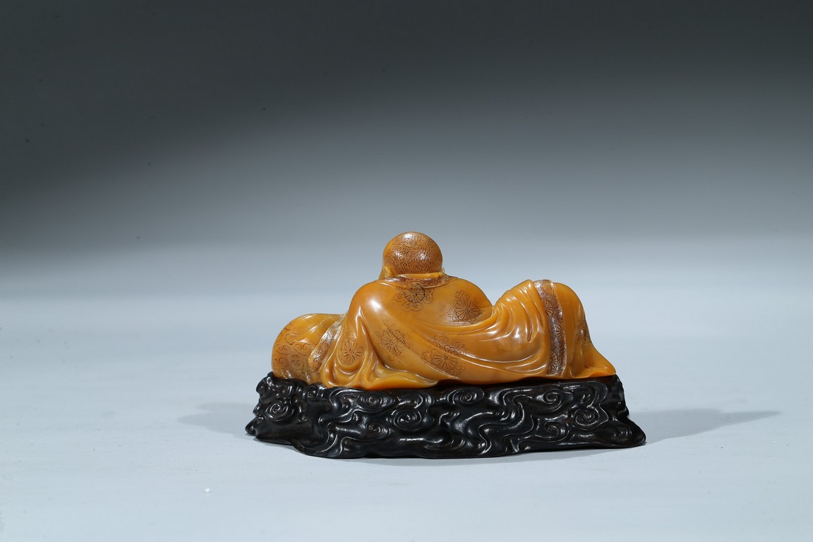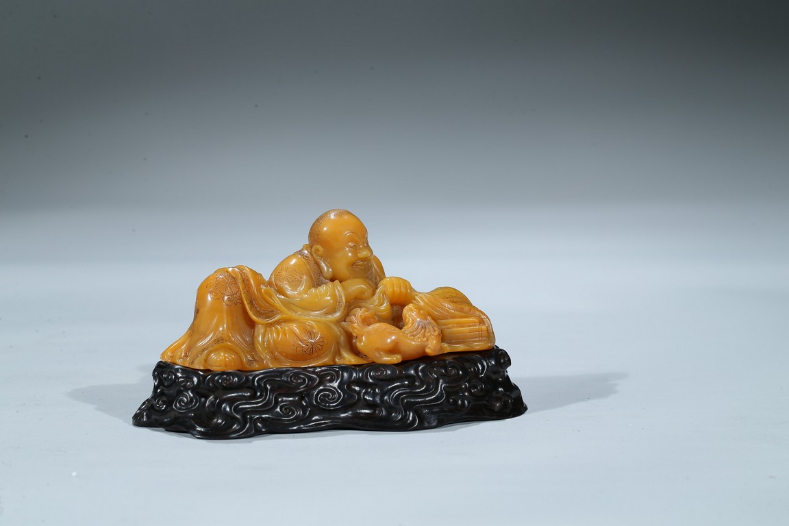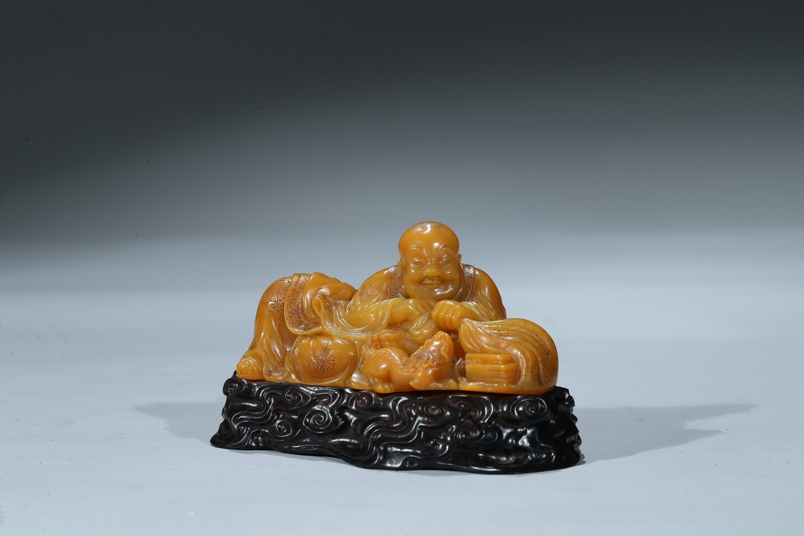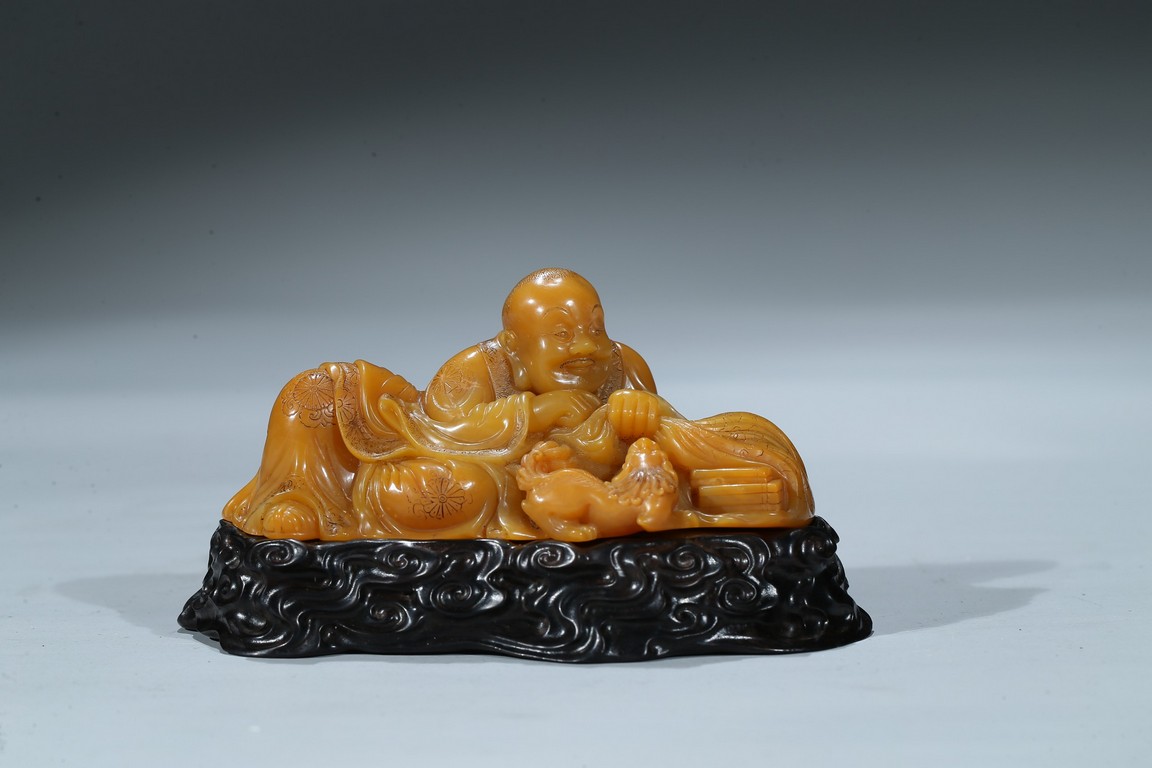 這尊羅漢像選取上等田黃石雕琢而成,石材通身嬌黃瑩潤,色澤統一而質感凝結油潤,瑩潤若脂玉,醇厚自然。羅漢神形並茂,極見制者功力。作者在雕刻的處理上,依型而雕,羅漢側臥而坐,寬鼻大眼,慈眉善目,大耳垂肩,耳環飽滿,羅漢怡然自得,寬衣當風,一只小螭虎則趴在羅漢身前,溫順可愛,頗具閑情雅趣的凡人之韻,將神仙世俗化,更能貼近人意。整件造像運刀流暢犀利,衣帶飄逸極富動感,在色彩上給於了嬌嫩鮮黃的田黃一絲色彩的調皮和變化,十分自然。這件作品即要將碩大的田黃雕刻出韻味和意境來,又要竟可能少的去損耗因雕刻而減少的重量,無論在選材,選料,構思,色彩上無比展現雕刻大師的常年積累的深厚底蘊,極為難得。田黃石稀罕珍貴,然此伏虎羅漢毫不吝材,以求造型之美態,實令人嘆為觀止。此田黃石呈純正的黃色,表面一層古樸的包漿,內裏蘿蔔絲紋隱現,石質致密通靈,溫潤細膩,如脂似玉,質感絕佳,彌足珍貴。來源:洛杉磯家族遞藏,1990年前購於香港 Provenance: Private collection. Los Angeles. Purchased in Hong Kong before 1990