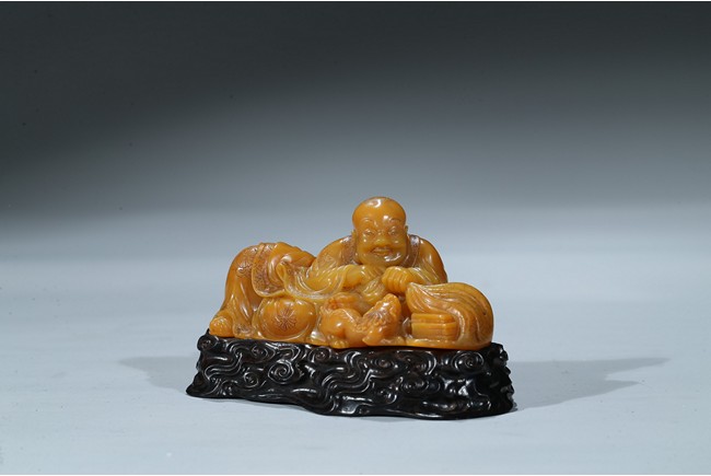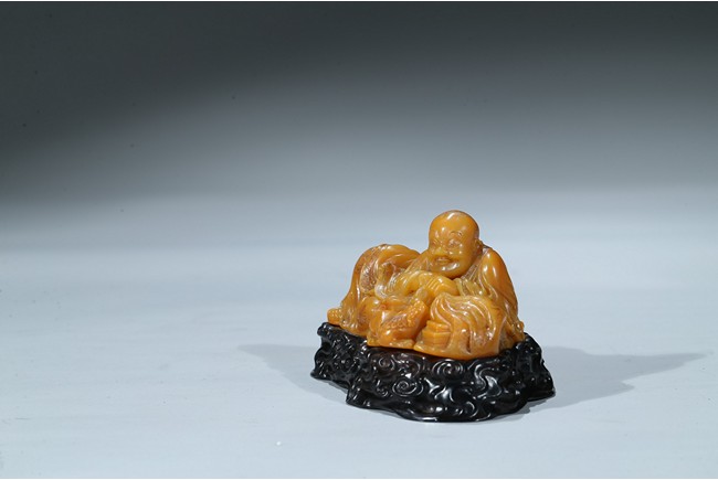 The tiger-taming luohan, finely carved and portrayed with curly hair, and pendulous earlobes with loop earrings, wearing a long flowing robe with incised decoration, right next to a small tiger cub. The luminous stone is of warm, creamy honey color, all supported on a hardwood stand. Qing Dynasty period.