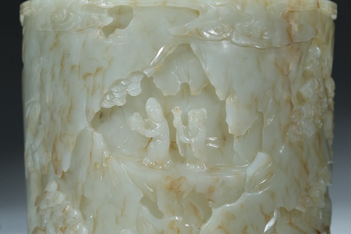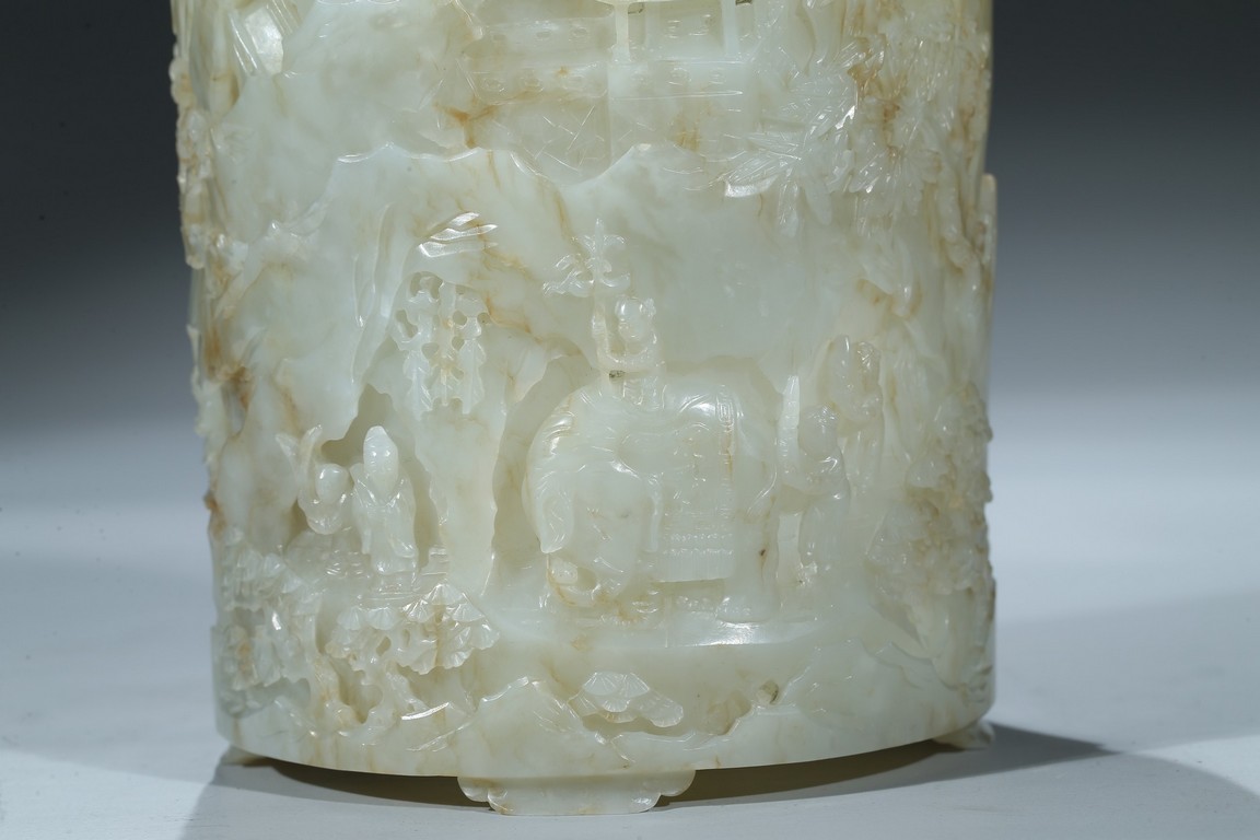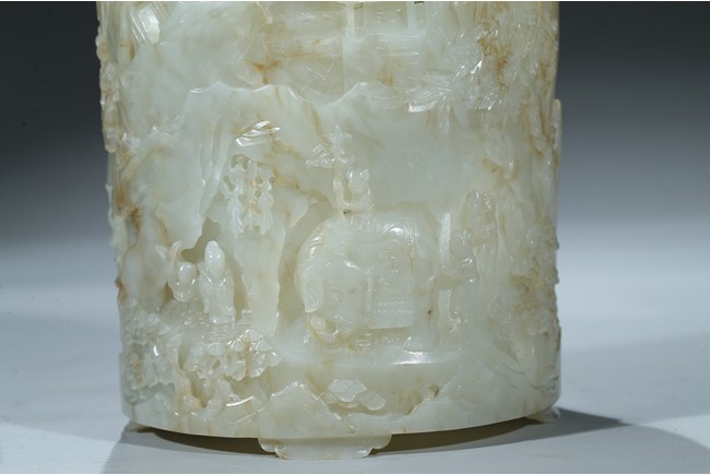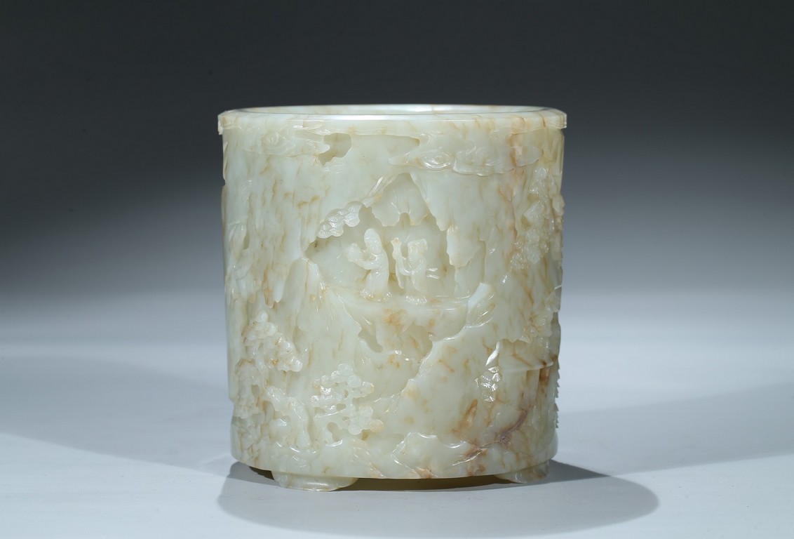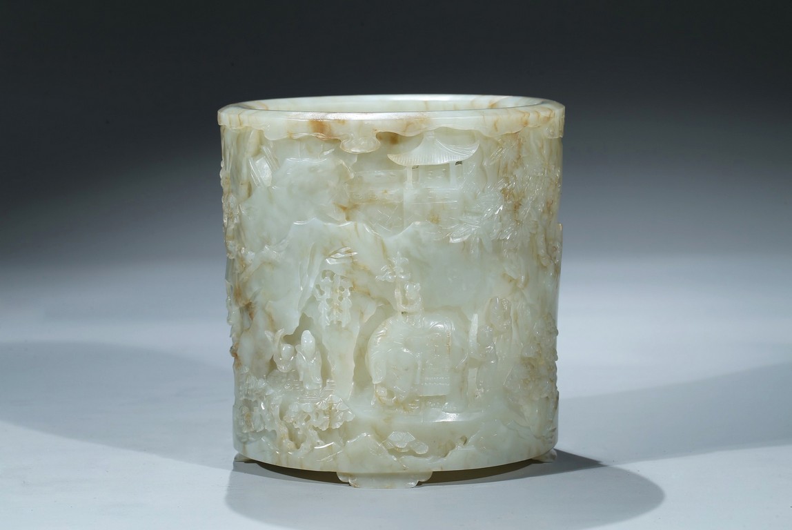 本拍品呈圓筒形,以整塊優質白玉掏膛整挖,中空以納筆,其下垂如意狀四足。所用白玉質地細膩,色澤勻凈。筒身做工精美,以高浮雕描繪山水人物圖景,只見溪山高隱,松幹曲折盤繞,松樹茂盛,亭臺掩映,廬舍清幽,山間小道上仙翁拄杖顧盼,童子圍繞在大象身旁。整幅構圖洋溢出一股如書畫般清新、優雅賞心悅目的畫面,加上高超的雕工,實令人愛不釋手。此類通景畫雕琢的風格是由康熙時期青花瓷筆筒得到啟示,在清十八世紀乾隆時期最為流行。整體觀來,其圖案神形兼備,兼之雕工流暢,打磨精細,可自其中感受到濃濃的畫意和文人趣味。 Compare a similar white jade carved brushpot, sold in Christie’s Hong Kong, November 2011, Lot 2891, sold for HKD 6980000