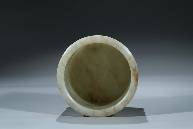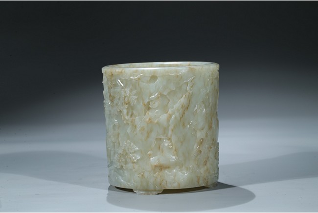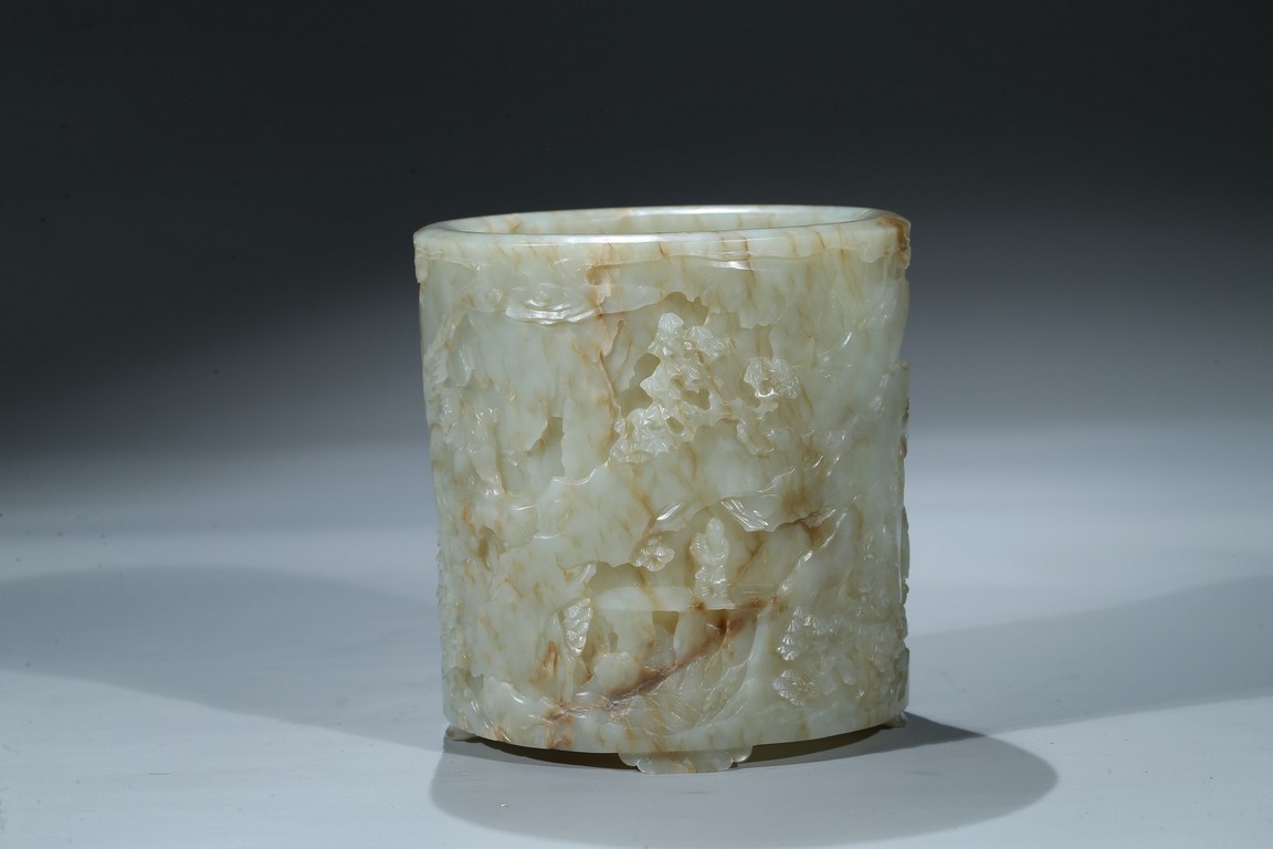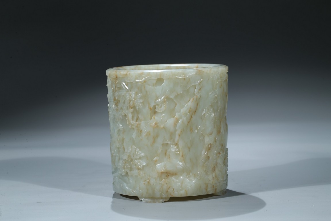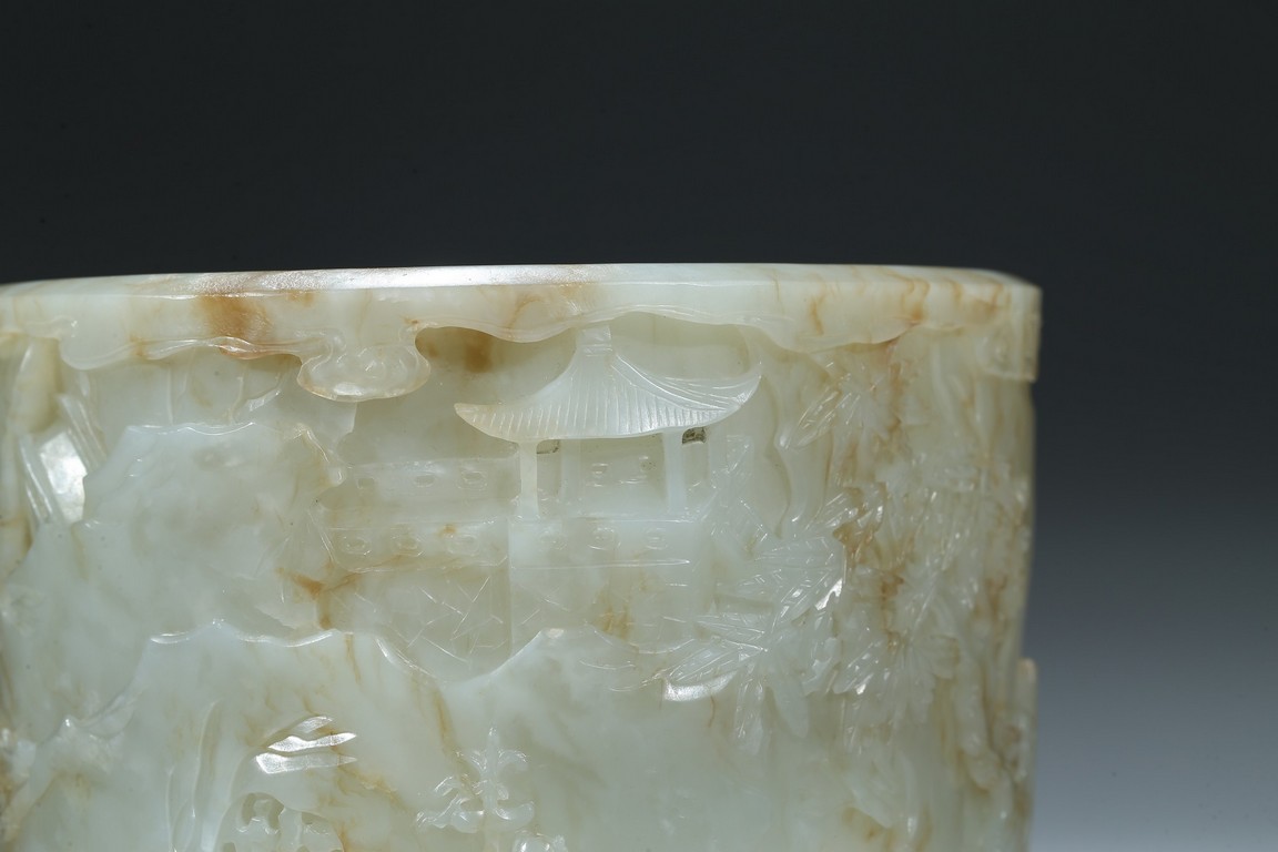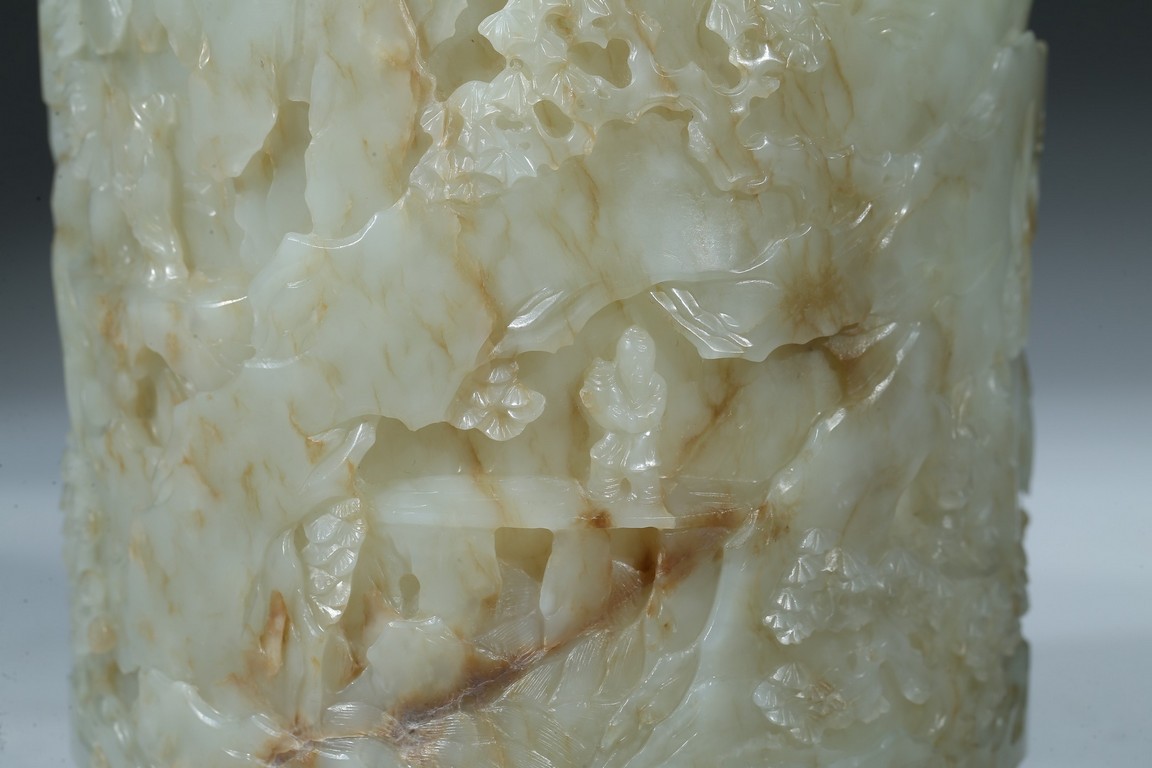 本拍品呈圓筒形,以整塊優質白玉掏膛整挖,中空以納筆,其下垂如意狀四足。所用白玉質地細膩,色澤勻凈。筒身做工精美,以高浮雕描繪山水人物圖景,只見溪山高隱,松幹曲折盤繞,松樹茂盛,亭臺掩映,廬舍清幽,山間小道上仙翁拄杖顧盼,童子圍繞在大象身旁。整幅構圖洋溢出一股如書畫般清新、優雅賞心悅目的畫面,加上高超的雕工,實令人愛不釋手。此類通景畫雕琢的風格是由康熙時期青花瓷筆筒得到啟示,在清十八世紀乾隆時期最為流行。整體觀來,其圖案神形兼備,兼之雕工流暢,打磨精細,可自其中感受到濃濃的畫意和文人趣味。 Compare a similar white jade carved brushpot, sold in Christie’s Hong Kong, November 2011, Lot 2891, sold for HKD 6980000