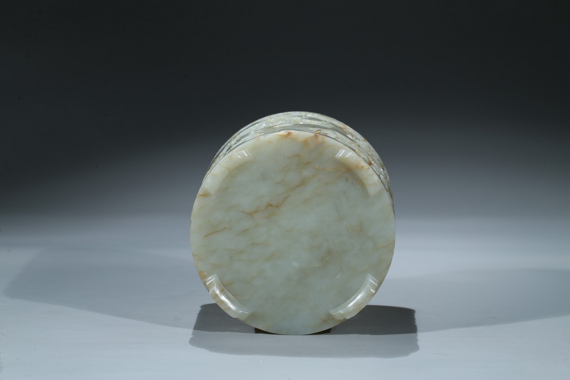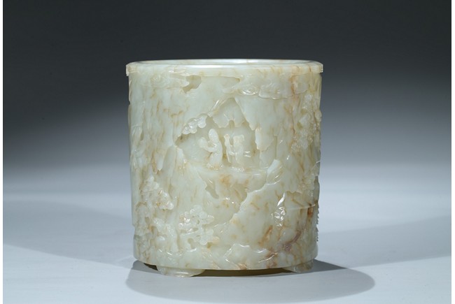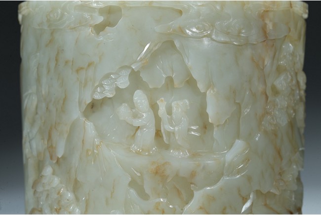 Of cylindrical form supported on four evenly spaced ruyi-form feet, the exterior skillfully carved and undercut in deep relief with a continuous scene of a child sitting upon an elephant accompanied by two attendants in a mountain landscape, the other side further carved with two figures amidst a dense bamboo grove surrounded by gnarled leafy pine and rockworks, the stone of a smoothly polished white tone with some russet veins. Qing Dynasty Qianlong period
