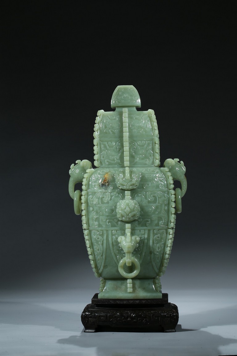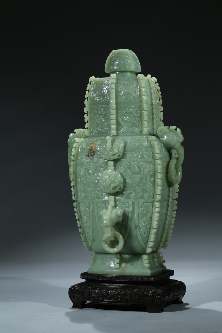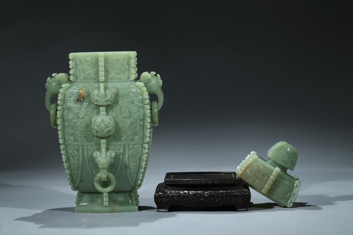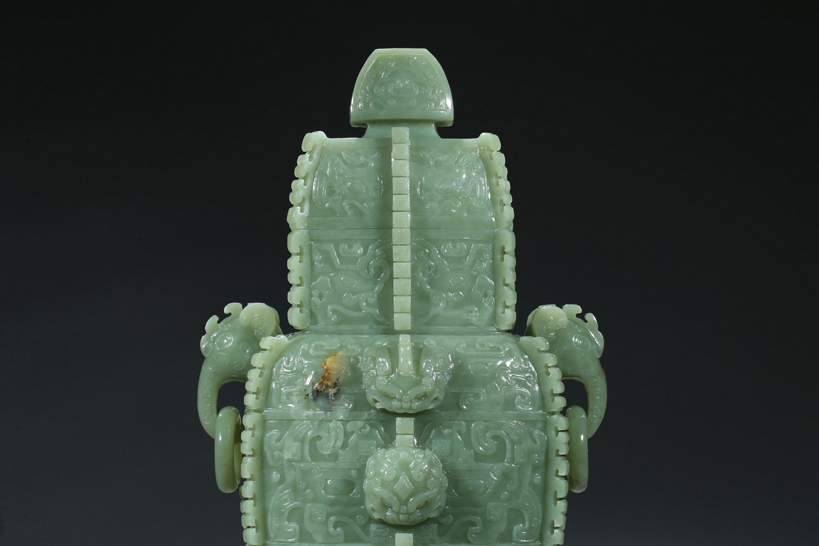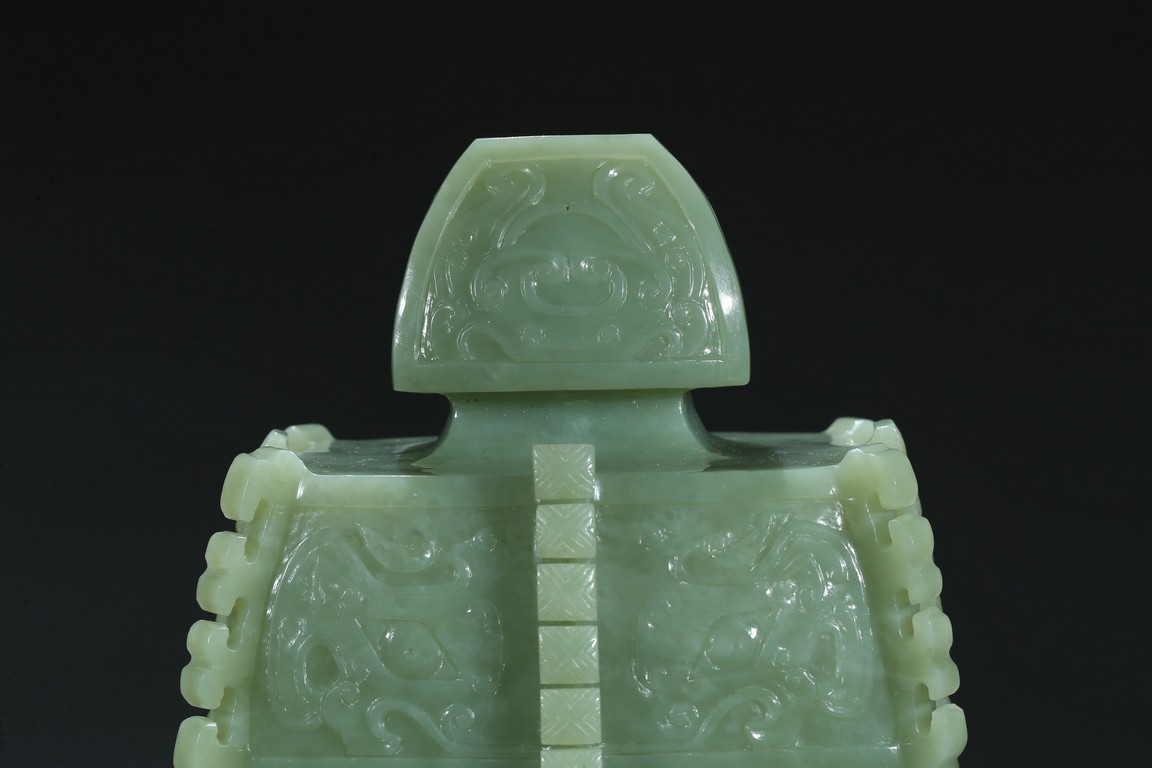 The decoration on each of the four sides of the high-shouldered, tapering body is arranged in horizontal registers divided by vertical flange.The four upper registers are carved in relief with large taotie masks, three of those are centered by an animal mask. The rounded shoulder is carved with pairs of elephant head suspend loose ring, fitted with a high domed cover carved with four stylized taotie masks surmounted by a quadrangular knop, the underside inscribed with three character mark 'Mao Qin Dian'. Qing Dynasty Qianlong period.
