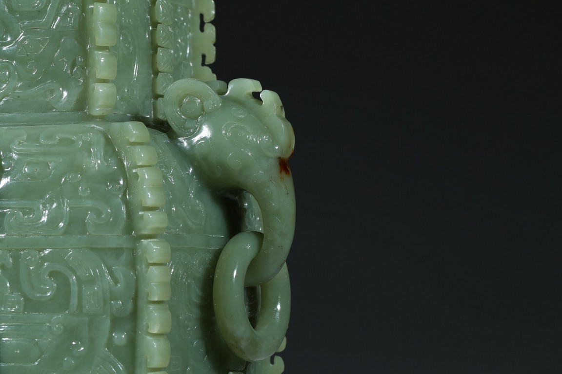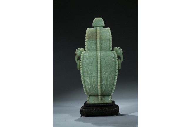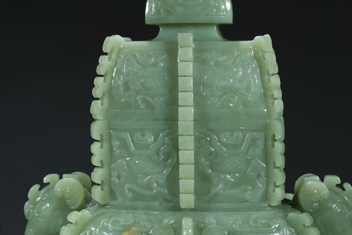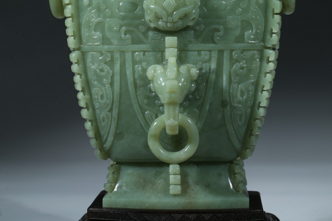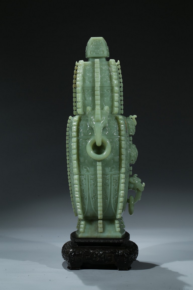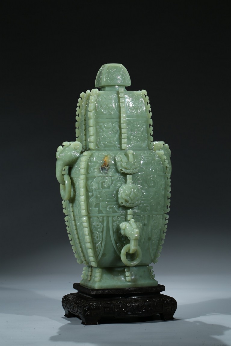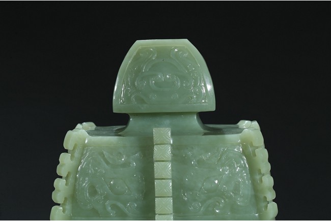 The decoration on each of the four sides of the high-shouldered, tapering body is arranged in horizontal registers divided by vertical flange.The four upper registers are carved in relief with large taotie masks, three of those are centered by an animal mask. The rounded shoulder is carved with pairs of elephant head suspend loose ring, fitted with a high domed cover carved with four stylized taotie masks surmounted by a quadrangular knop, the underside inscribed with three character mark 'Mao Qin Dian'. Qing Dynasty Qianlong period.