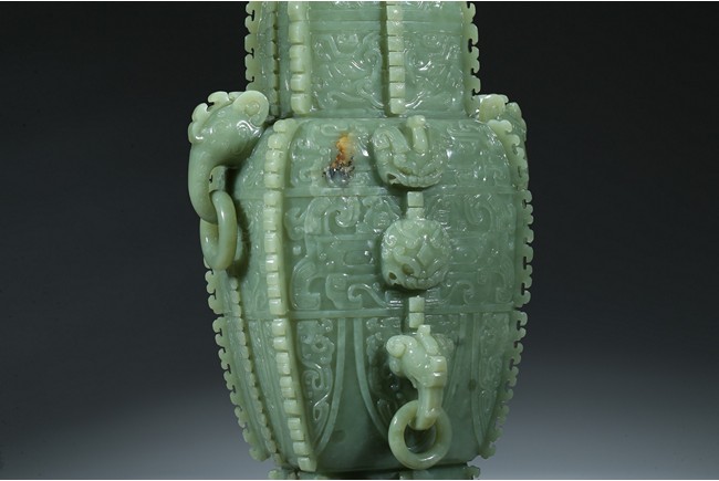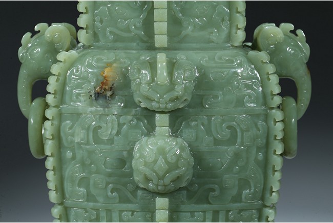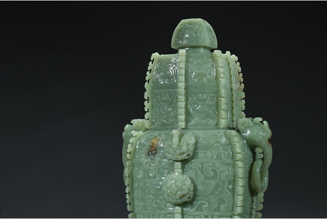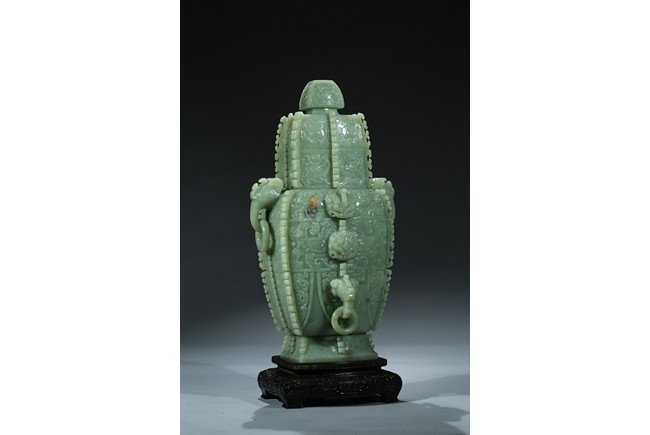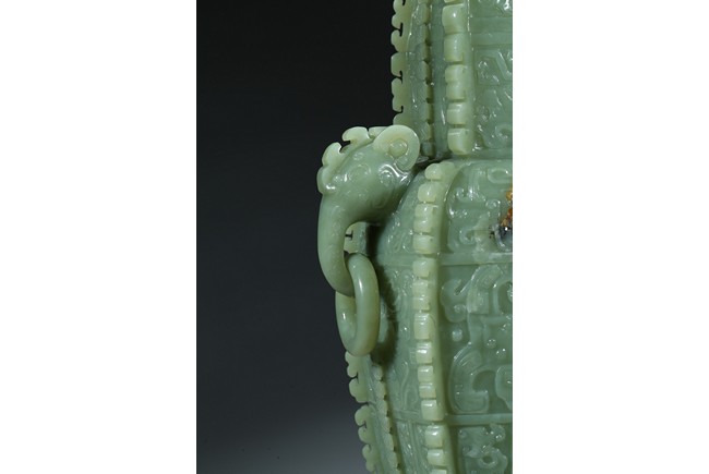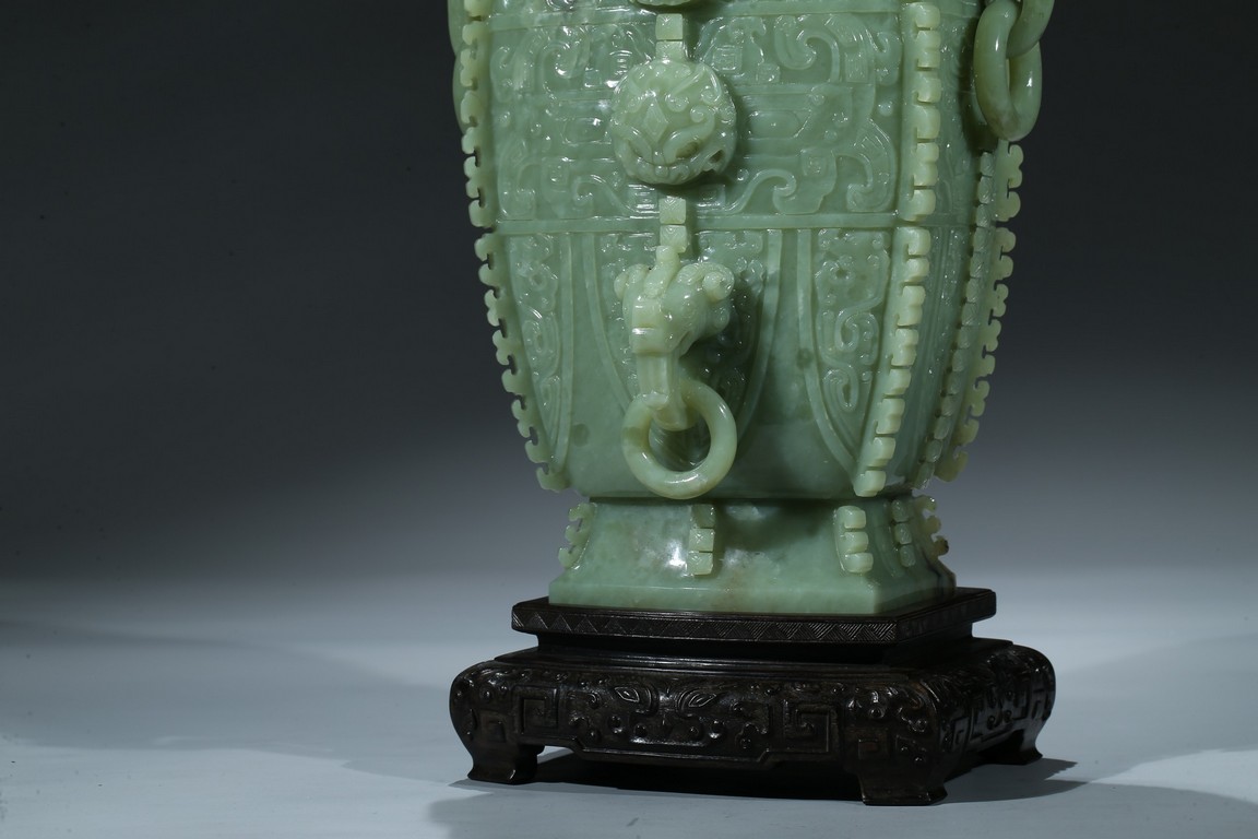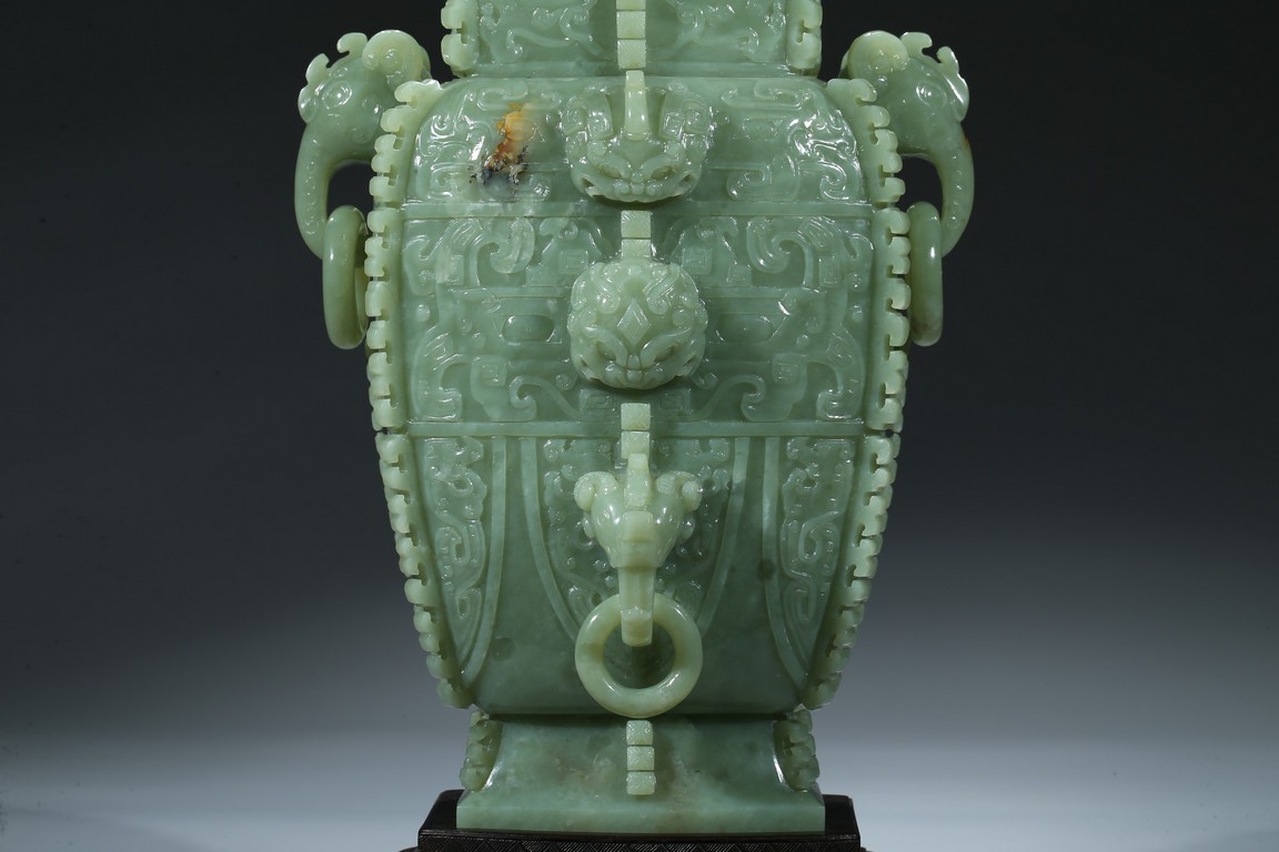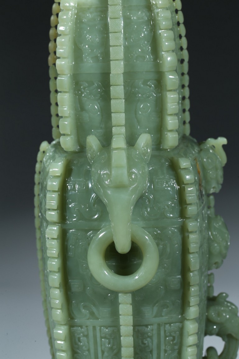 The decoration on each of the four sides of the high-shouldered, tapering body is arranged in horizontal registers divided by vertical flange.The four upper registers are carved in relief with large taotie masks, three of those are centered by an animal mask. The rounded shoulder is carved with pairs of elephant head suspend loose ring, fitted with a high domed cover carved with four stylized taotie masks surmounted by a quadrangular knop, the underside inscribed with three character mark 'Mao Qin Dian'. Qing Dynasty Qianlong period.