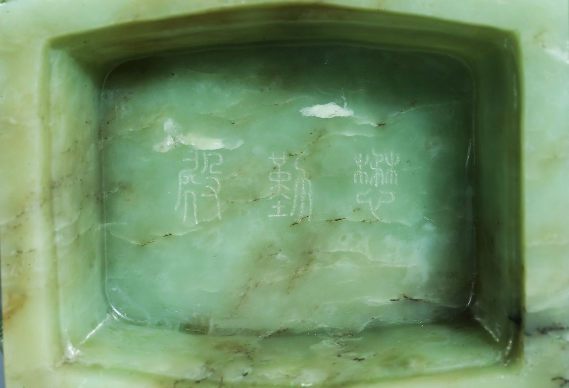 乾隆皇帝有詩雲:“懋勤筆硯例恒隨”、“凡文房四事,由各處呈進備用。頒賜各件,皆存懋勤殿庫”。懋勤殿兼本房太監數額、職掌如下:七品首領一,執守侍。八品首領一,侍監。太監十。專司承值禦筆並收掌文房書籍、登載內起居註及禦前坐更等事。在各種儀式中涉及文房器用者,均由懋勤殿太監負責。紫光閣武試儀,“懋勤殿太監陳列朱筆暖硯於案”;每歲十二月初一日,賞賜福字儀,“懋勤殿首領太監陳龍箋、大筆、墨海於重華宮祗候,皇帝以‘賜福蒼生筆’書‘福’字十余幅貼各宮”;秋讞勾到儀,“懋勤殿太監設寶座,案東向,陳筆硯文具”;恭遇每歲新正,特召內廷大學士、翰林於重華宮茶宴聯句,“宮殿監豫請所司具茶果,承應宴戲,懋勤殿首領太監等具筆墨紙硯”。此拍品取大塊黃玉為料,玉質細膩溫和,光滑瑩透。器呈方尊造型,長方口略外鼓,上置帶鈕頂蓋,四面中心和四角皆有出戟,從蓋面一直延伸至足邊。折肩兩側置雙獸耳帶環,鼻長如象,耳圓似熊,展現出一種凡間未有的異獸樣貌。尊體一側從上到下分置制端、狻猊、瑞羊首,其中羊首銜環,在一個畫面中同時展露三種瑞獸的形象,氣勢磅礴浩大。玉尊遍體通過犀利的運刀鐫出大小不一、姿態各異的饕餮獸面紋樣,而這些紋樣處處都表現得線條誇張,目光兇猛,結合黃玉清透鐫麗的質感,充滿神秘威嚴、不可侵犯的氣勢。足內底部鐫有“懋勤殿”三字篆書款。懋勤殿位於北京故宮西南角,與端凝店相對,原為皇帝讀書、批閱奏本、鑒賞書畫的地方。“懋勤”二字取自“懋學勤政”,呈現出頗為儒雅的文化氛圍,存放著皇帝禦用的圖書瀚海、文房四寶,而此黃玉方尊作為當時極為受到推崇的仿古器之一,可想也曾被置於此房案頭,體現出清宮中流行的文雅風尚,而碩大厚重的器體,也應令其在眾多器物中處於極為醒目的位置。來源:北加州重要藏家提供 Provenance: Property from an important private collection, Northern California