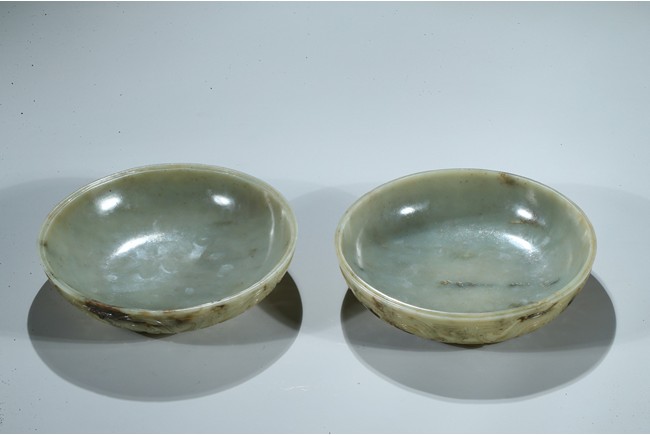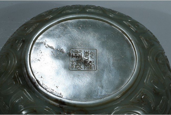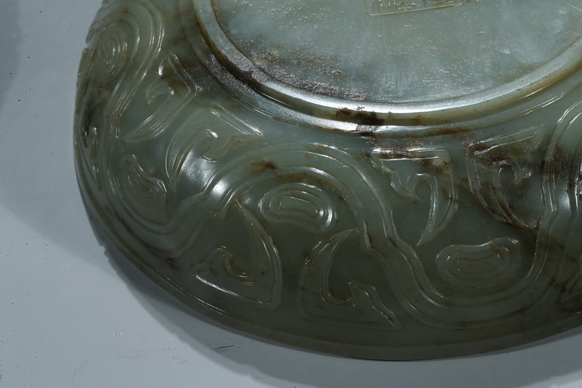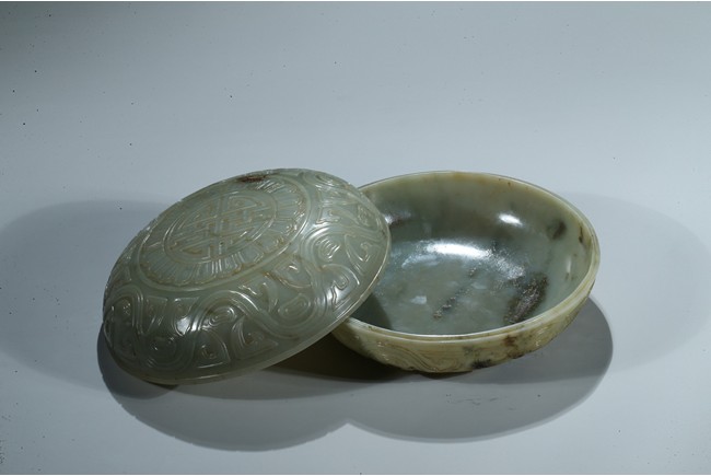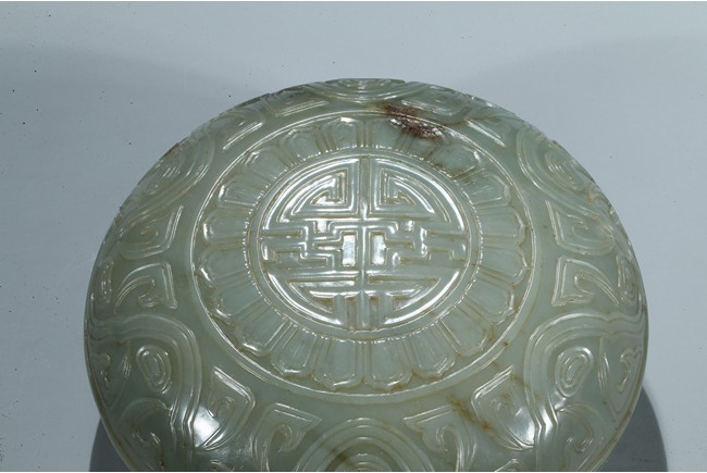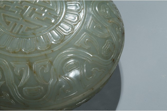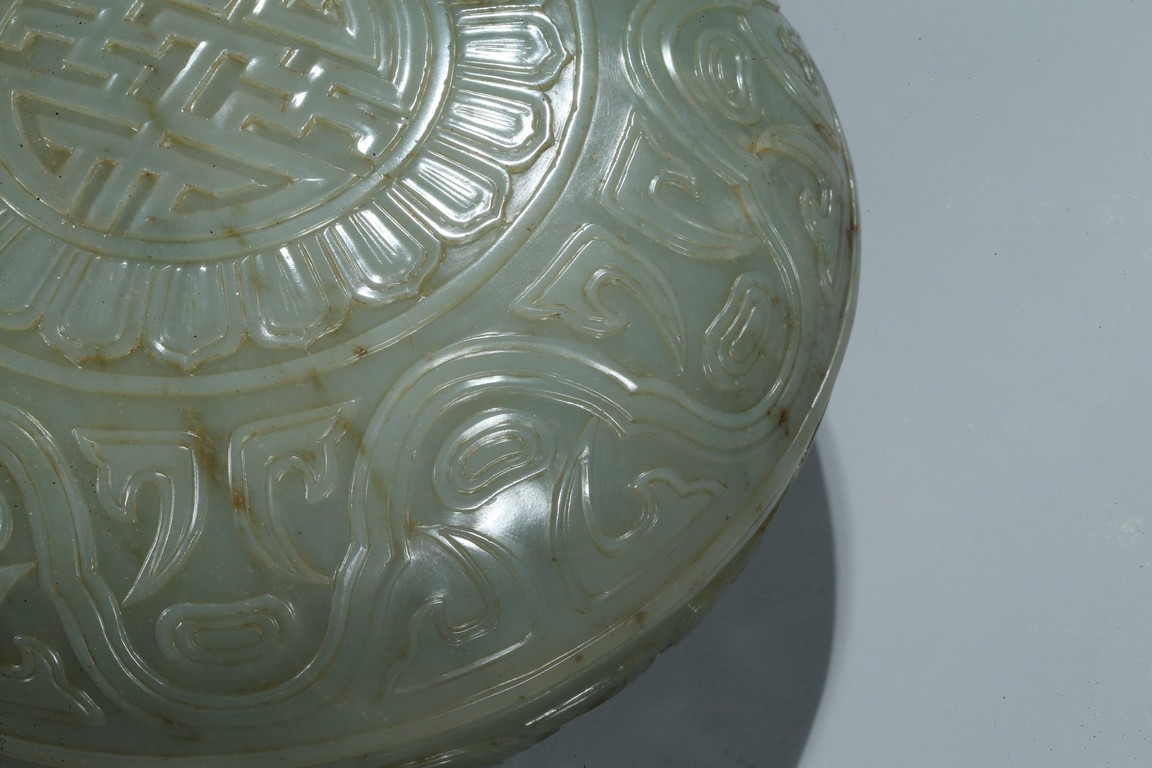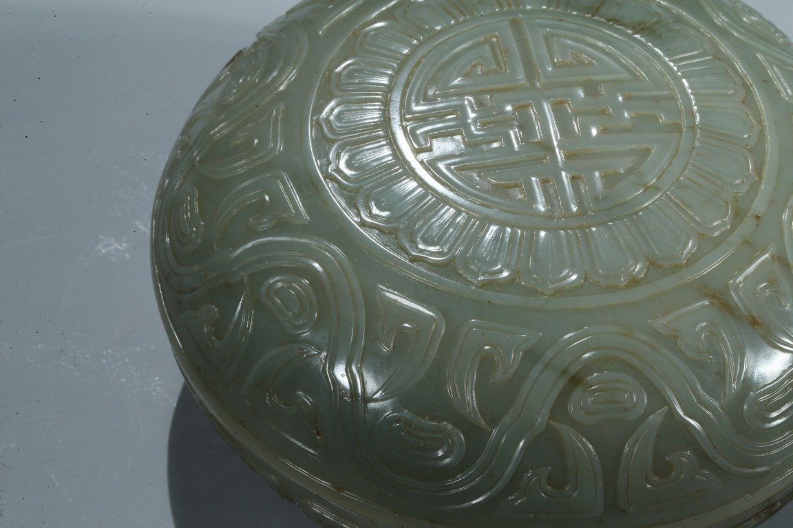 The domed cover carved in low relief with a shou medallion encircled by stylized lotus petals, all enclosed surrounded by archaistic spiral and geometric design, the fitted box raised on a low foot, the translucent stone of a pale greenish white color with russet inclusions. Qing Dynasty period.