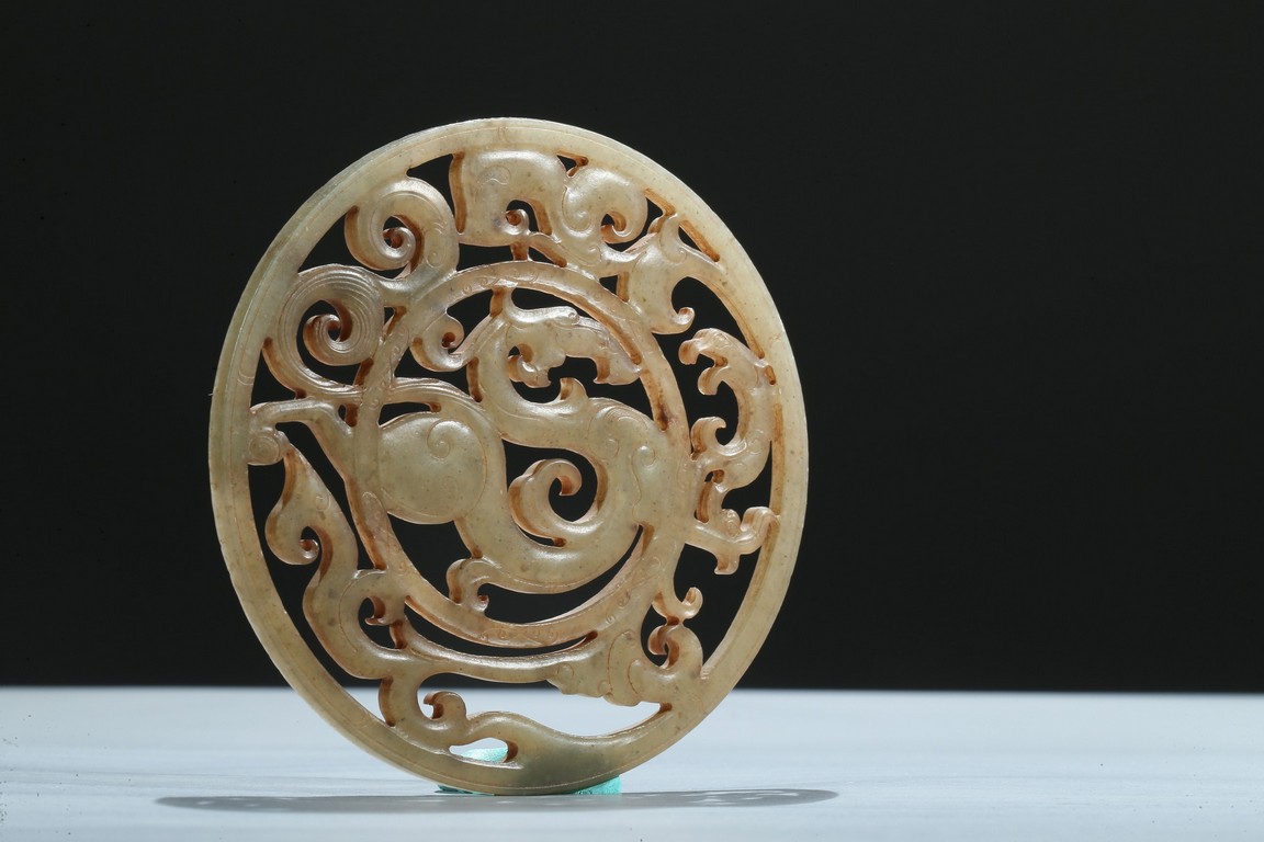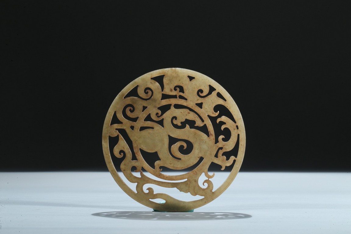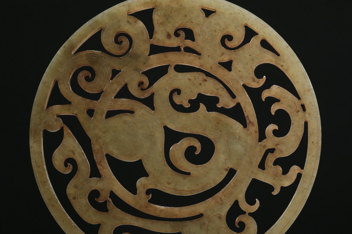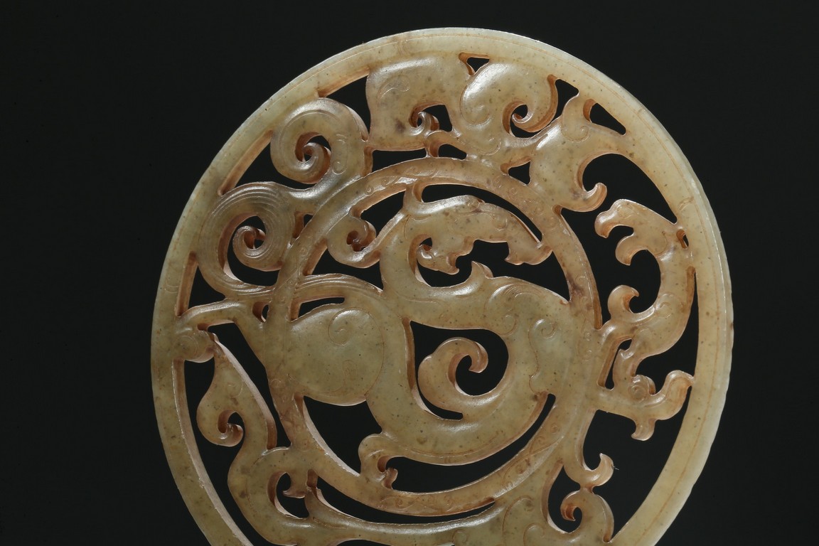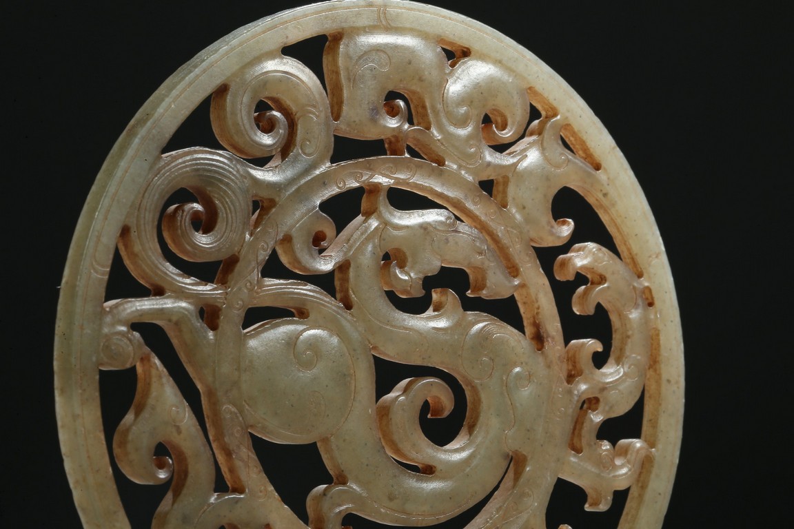 Finely carved and pierced as a stylized dragon to the center enclosed in a round medallion, the outer ring pierced with stylized scroll pattern. Han Dynasty period.
