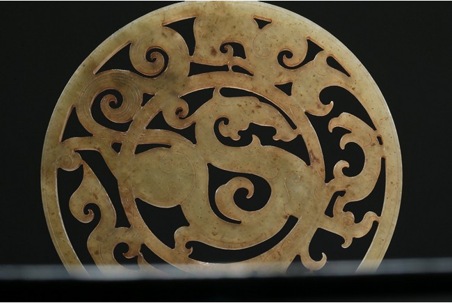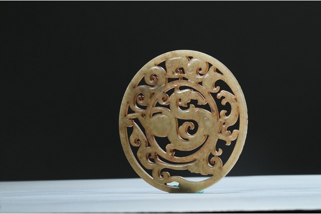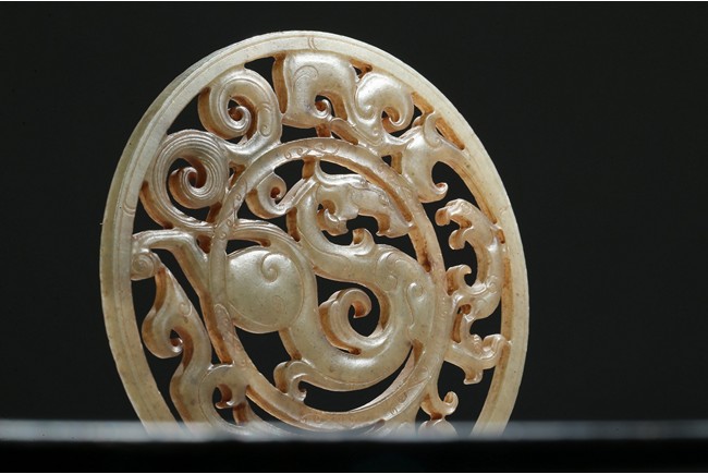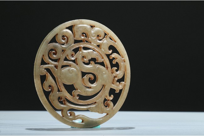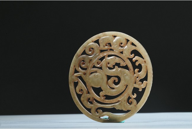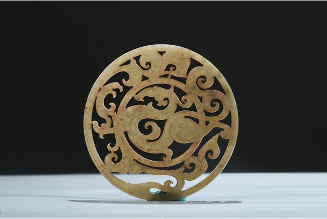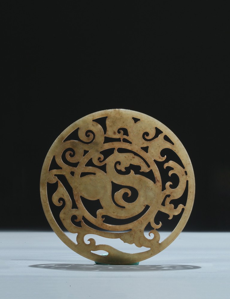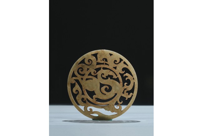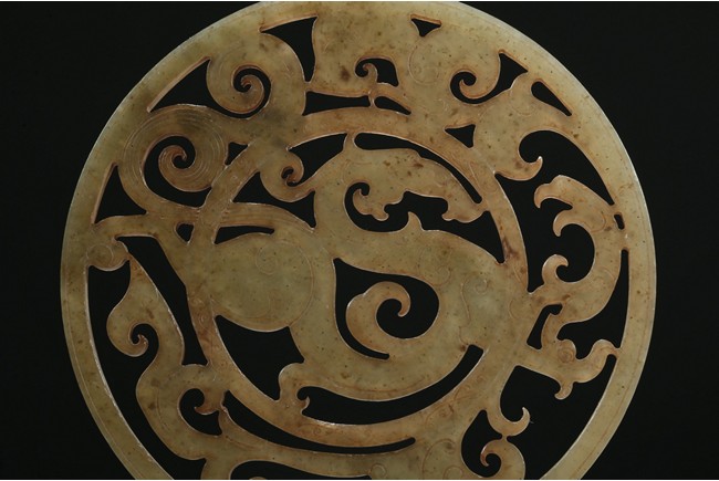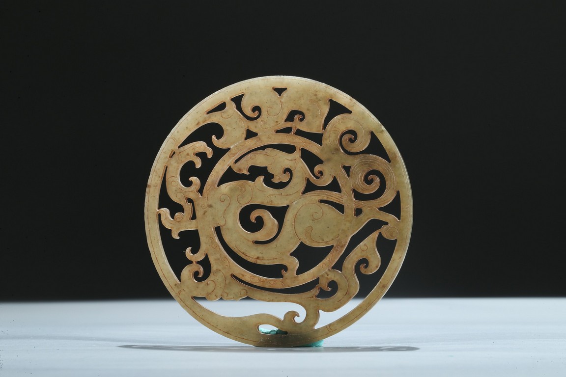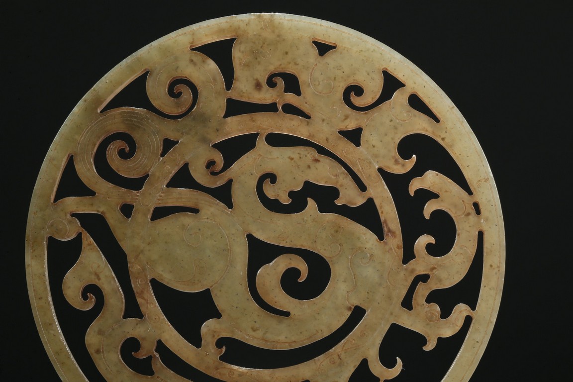 Finely carved and pierced as a stylized dragon to the center enclosed in a round medallion, the outer ring pierced with stylized scroll pattern. Han Dynasty period.