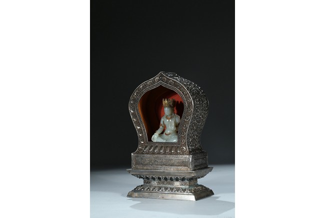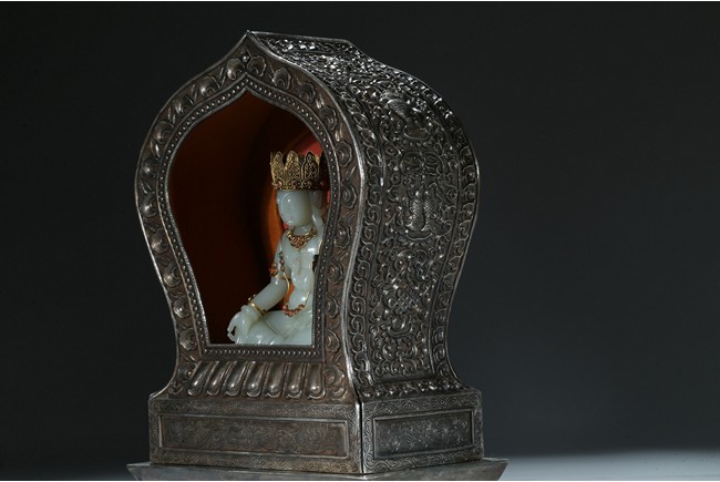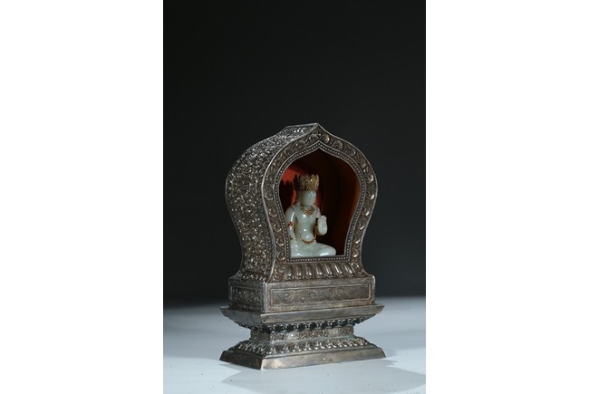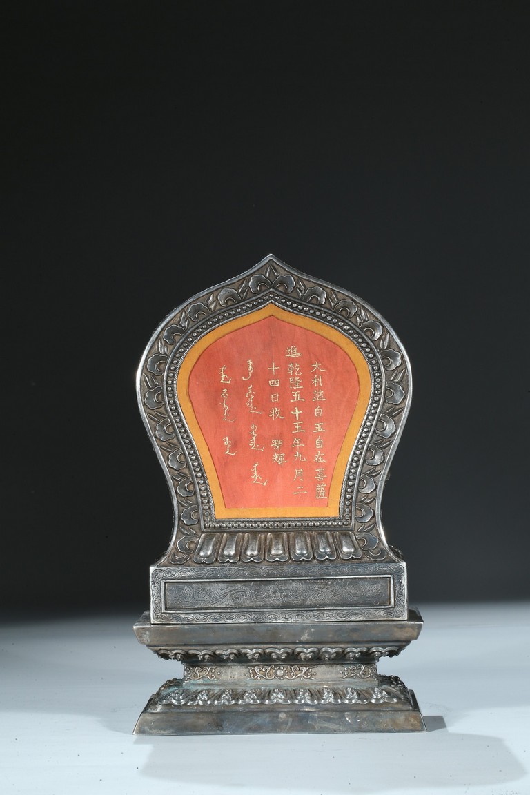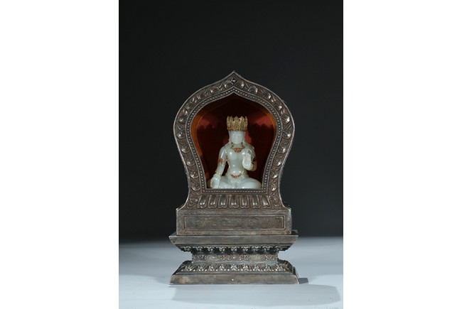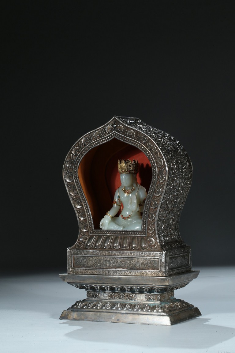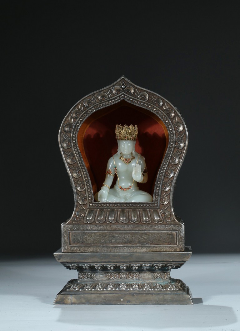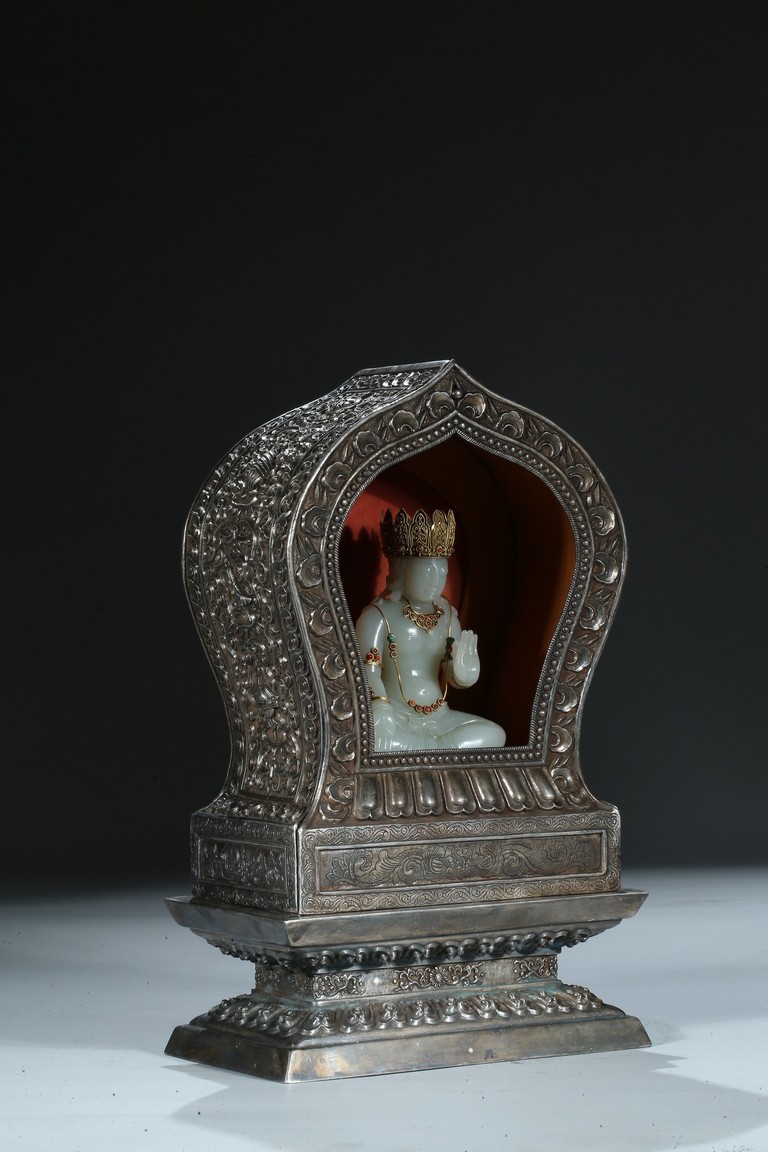 Contained within an elaborately worked silver shrine, the sides finely cast with buddhist's treasures in relief, the bottom of the shrine with floral motifs, enclosed within scrolling foliage pattern. The base with double lotus petals. The reverse embroidered with a kesi panel inscribed in Chinese and Manchurian inscription dated to fifteen year of Qianlong reign.The white jade bodhisattva statue is shown seated with right hand in abhaya mudra and the left hand in varada mudra , adorned with elaborate crown and necklace inlaid with coral beads, all cast in gold foil.