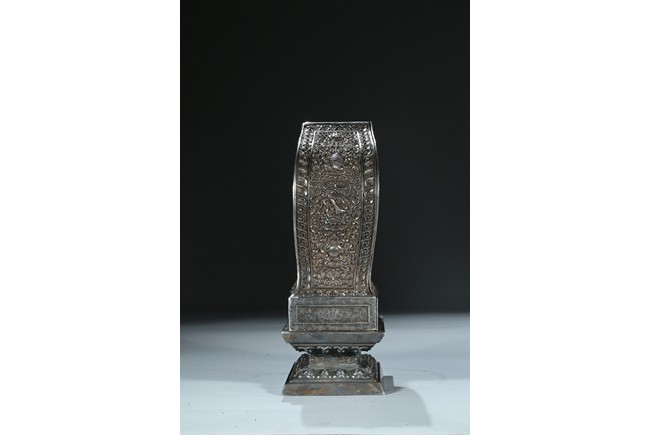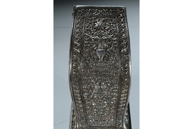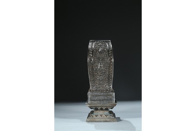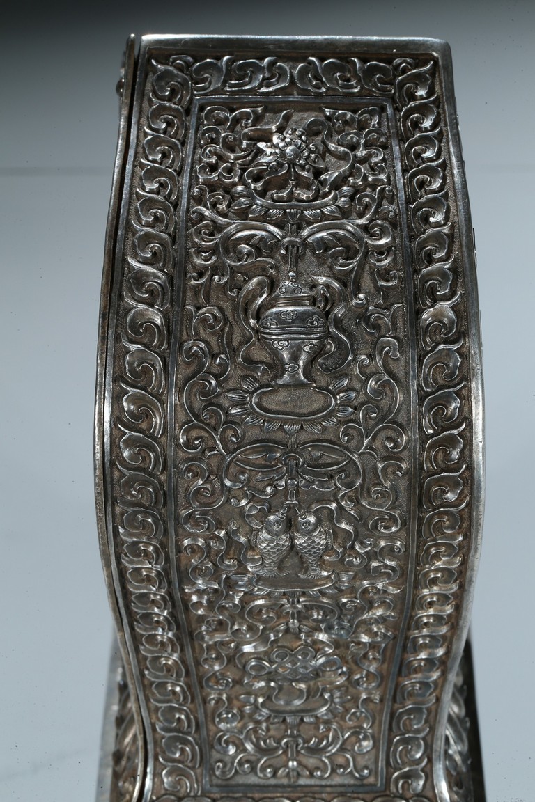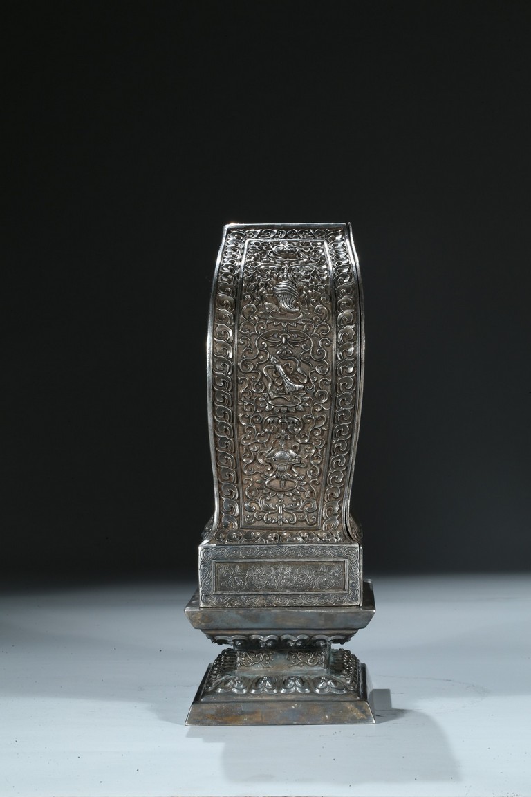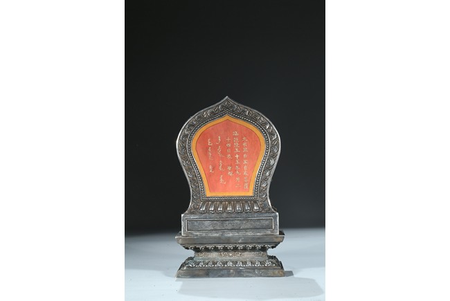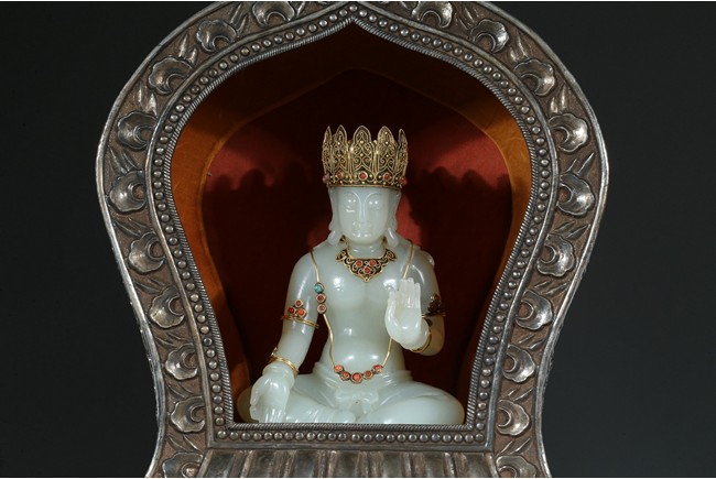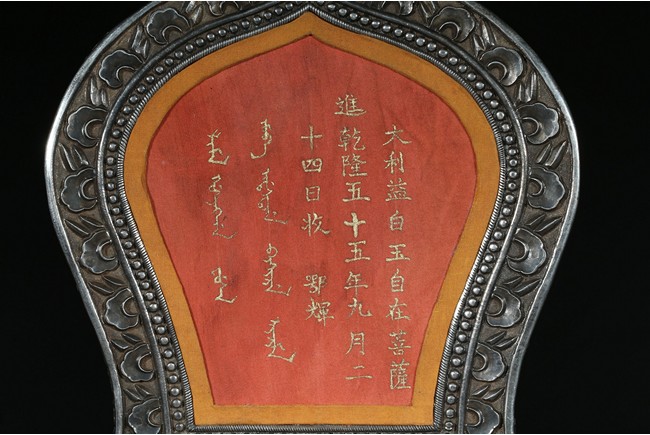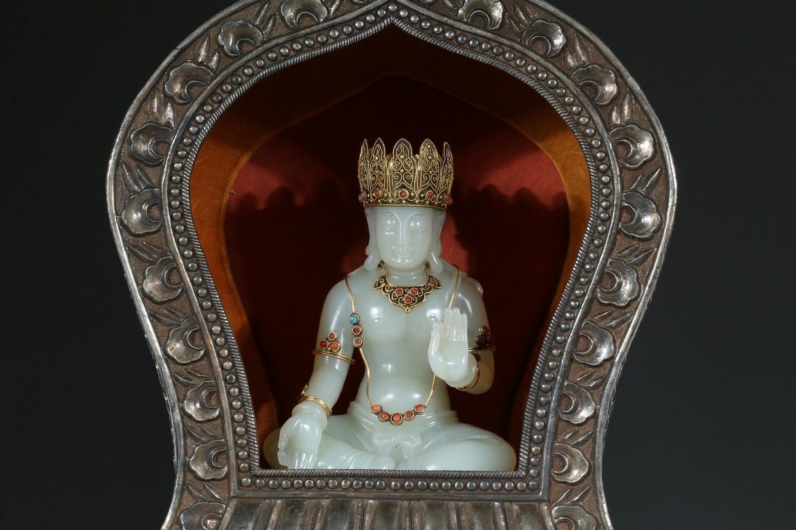 Contained within an elaborately worked silver shrine, the sides finely cast with buddhist's treasures in relief, the bottom of the shrine with floral motifs, enclosed within scrolling foliage pattern. The base with double lotus petals. The reverse embroidered with a kesi panel inscribed in Chinese and Manchurian inscription dated to fifteen year of Qianlong reign.The white jade bodhisattva statue is shown seated with right hand in abhaya mudra and the left hand in varada mudra , adorned with elaborate crown and necklace inlaid with coral beads, all cast in gold foil.