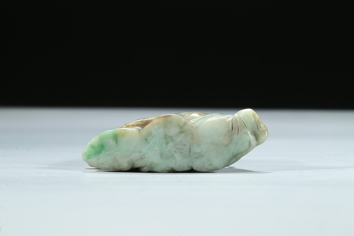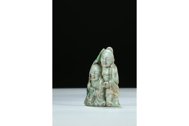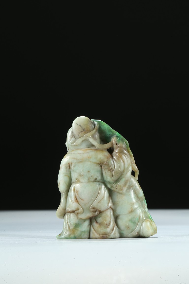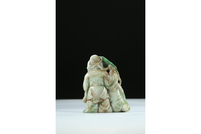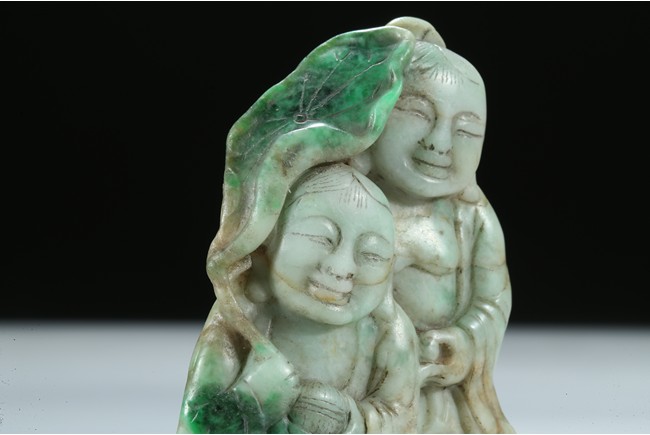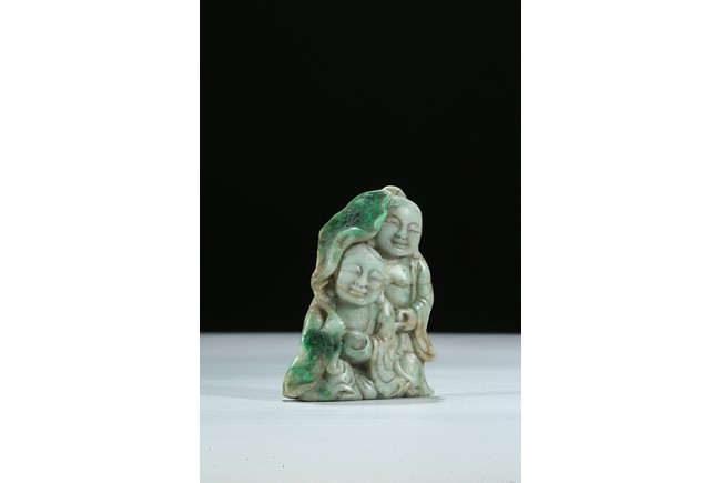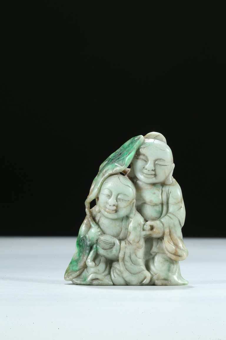 Carved in the form of a heh erxian, the two immortals from Chinese legend, one seated and holding a large lotus leaf and a box, the other standing behind him, the stone is of opaque green tone. Qing Dynasty period.