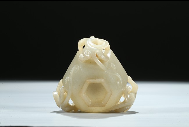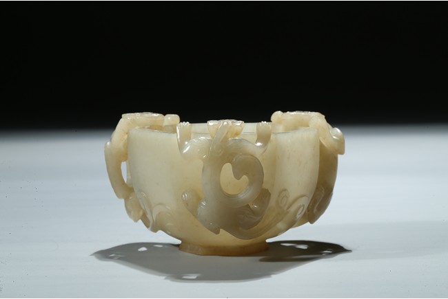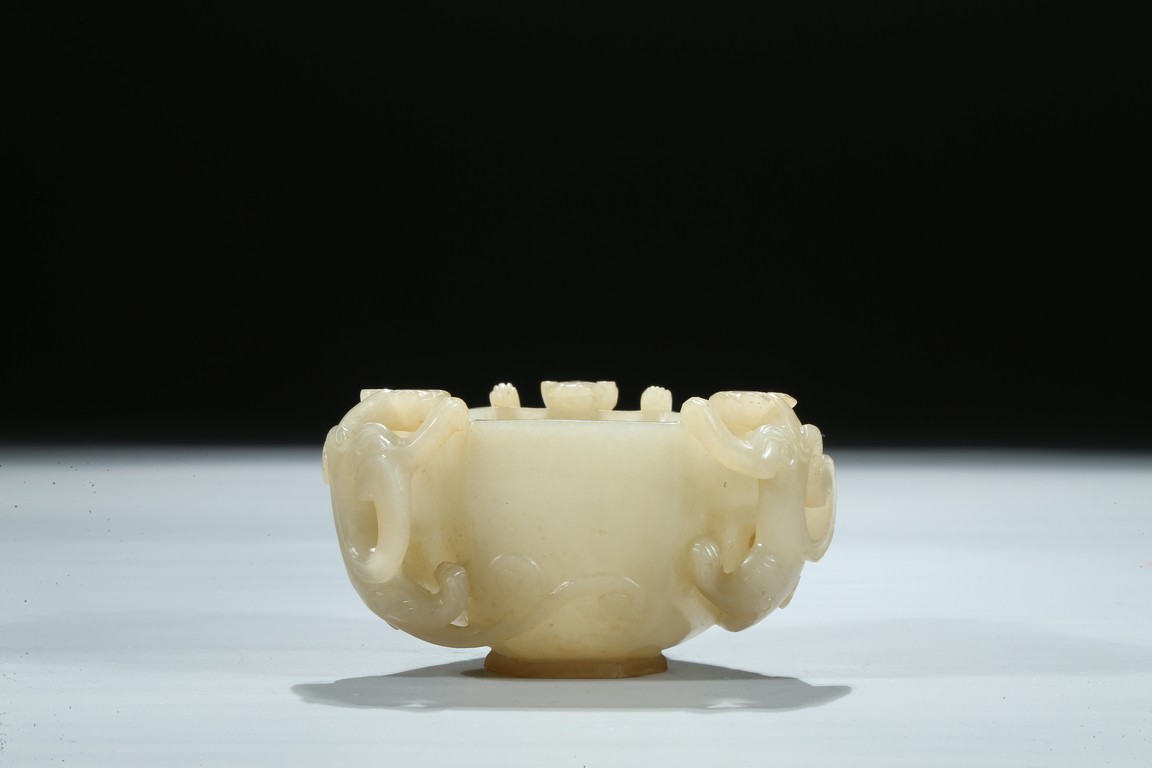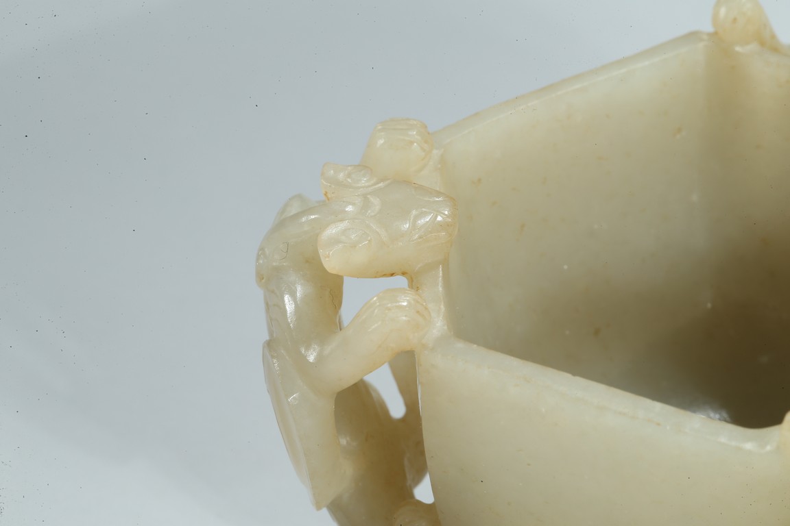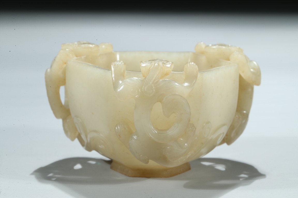Of hexagonal form, the cup is finely carved in high relief to each side with three crouching chilong with bifurcated tails, the stone is of an even russet and white tone with a few minor streaked inclusions. Qing Dynasty period.