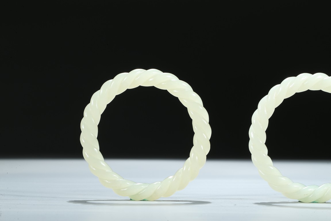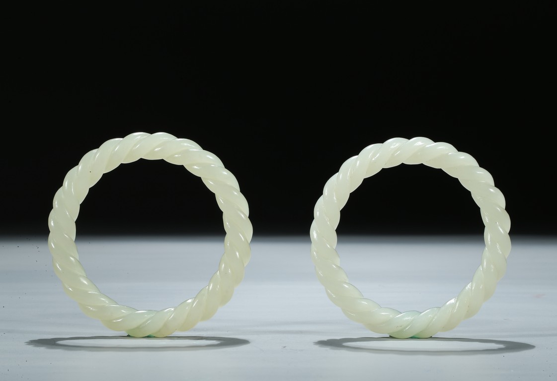Each bangle is finely carved as two strands of rope twisted together, the stone is of a white even tone. Qing Dynasty period.