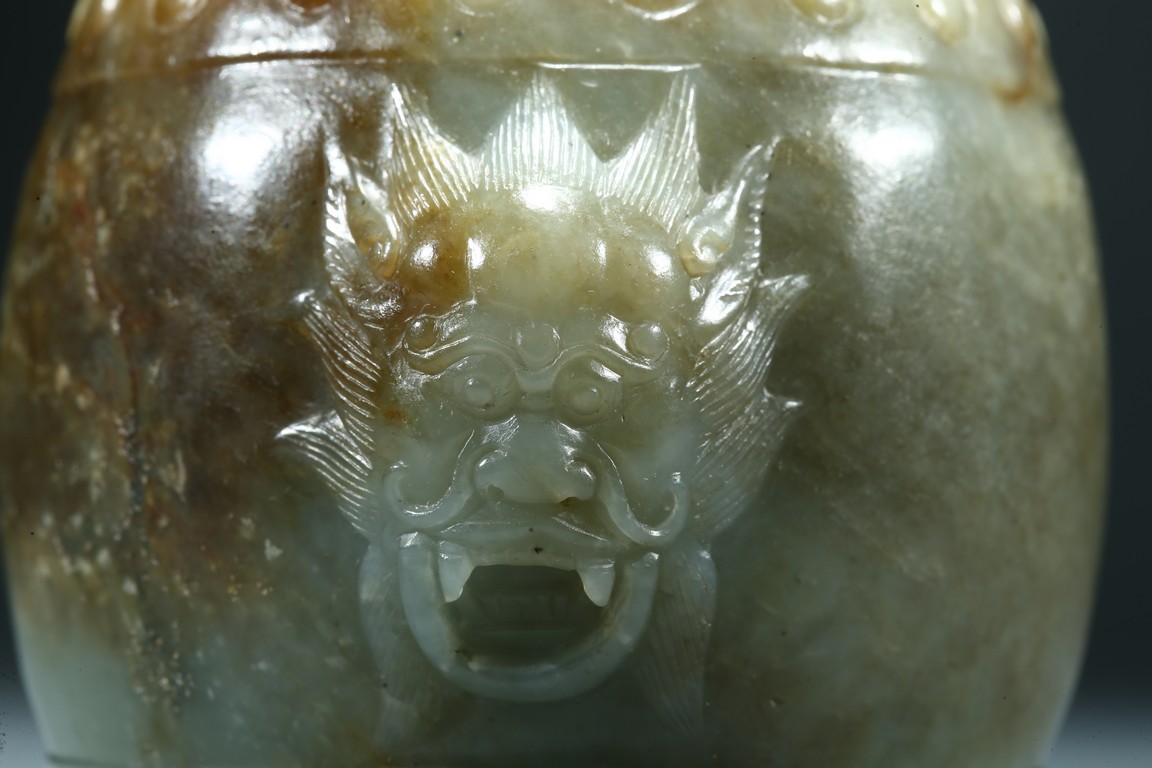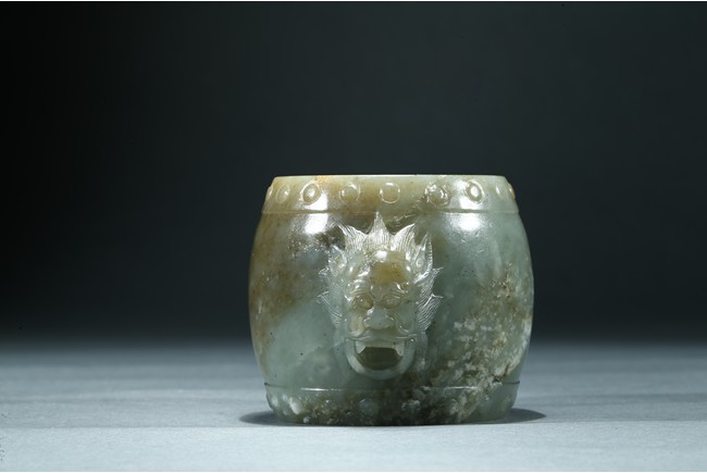Of drum form with swelling sides rising to a flat top,both sides carved with mythical beast mask with mouth agape,all between two double-bands of studded bosses. Qing Dynasty period.