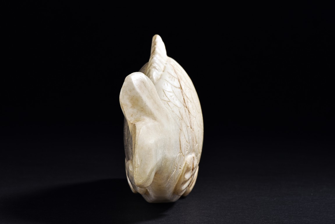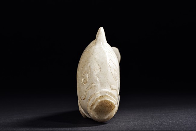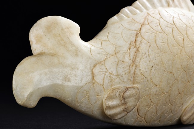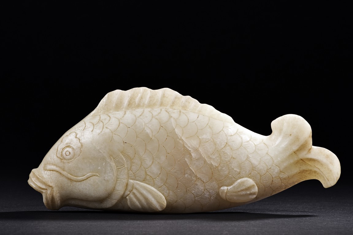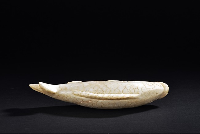 The jade is modelled as a fish flicking its tail slightly upwards,the body finely incised to represent scales. Qing Dynasty period.