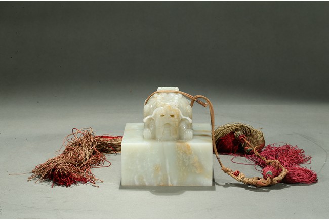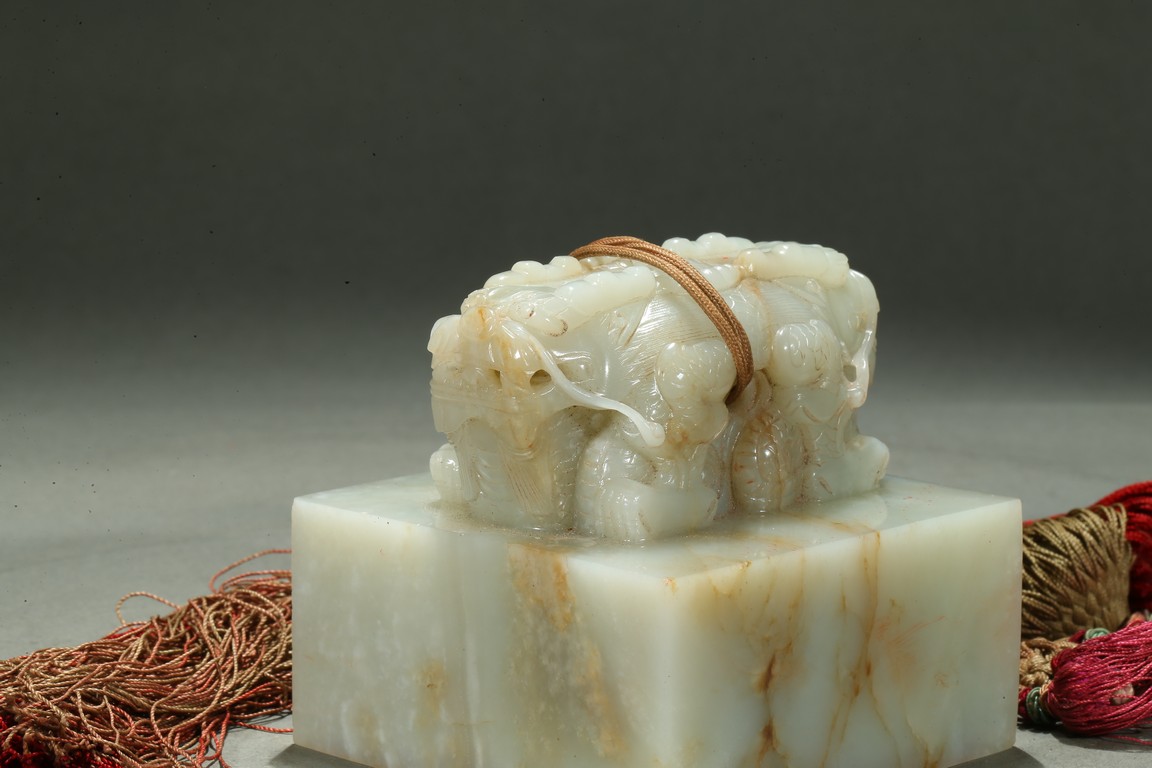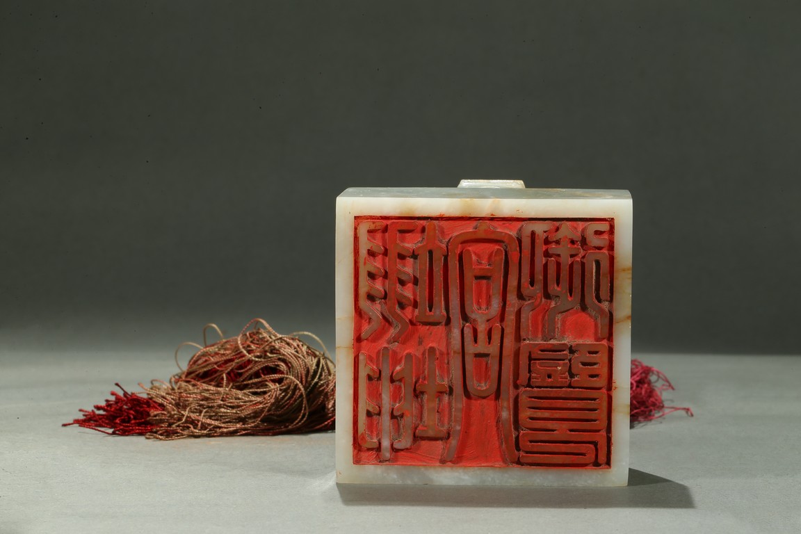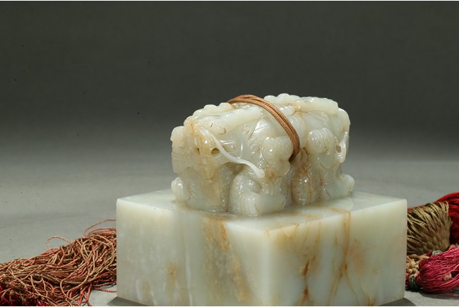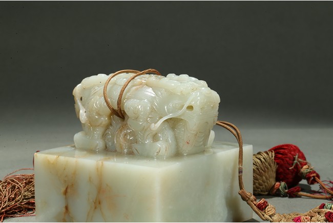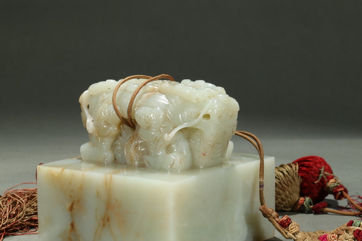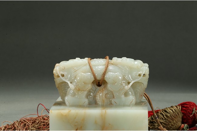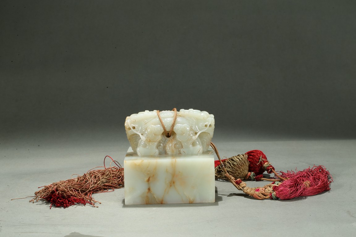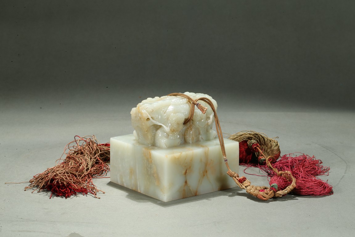 Of square form,the top carved with pair of recumbent dragons crouching on haunches,with scaly bodies,large bulging eyes,and sharp fangs. The seal face carved with five characters. The stone is of even white tone with some russet markings and veins. Qing Dynasty period.
