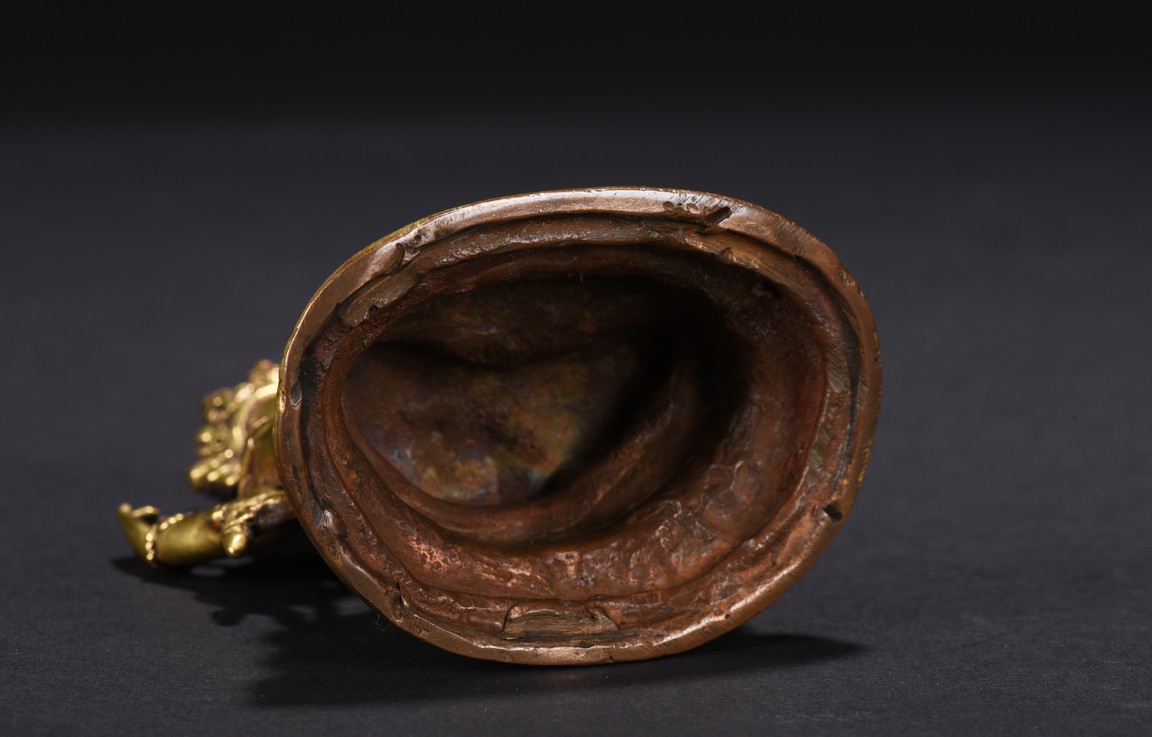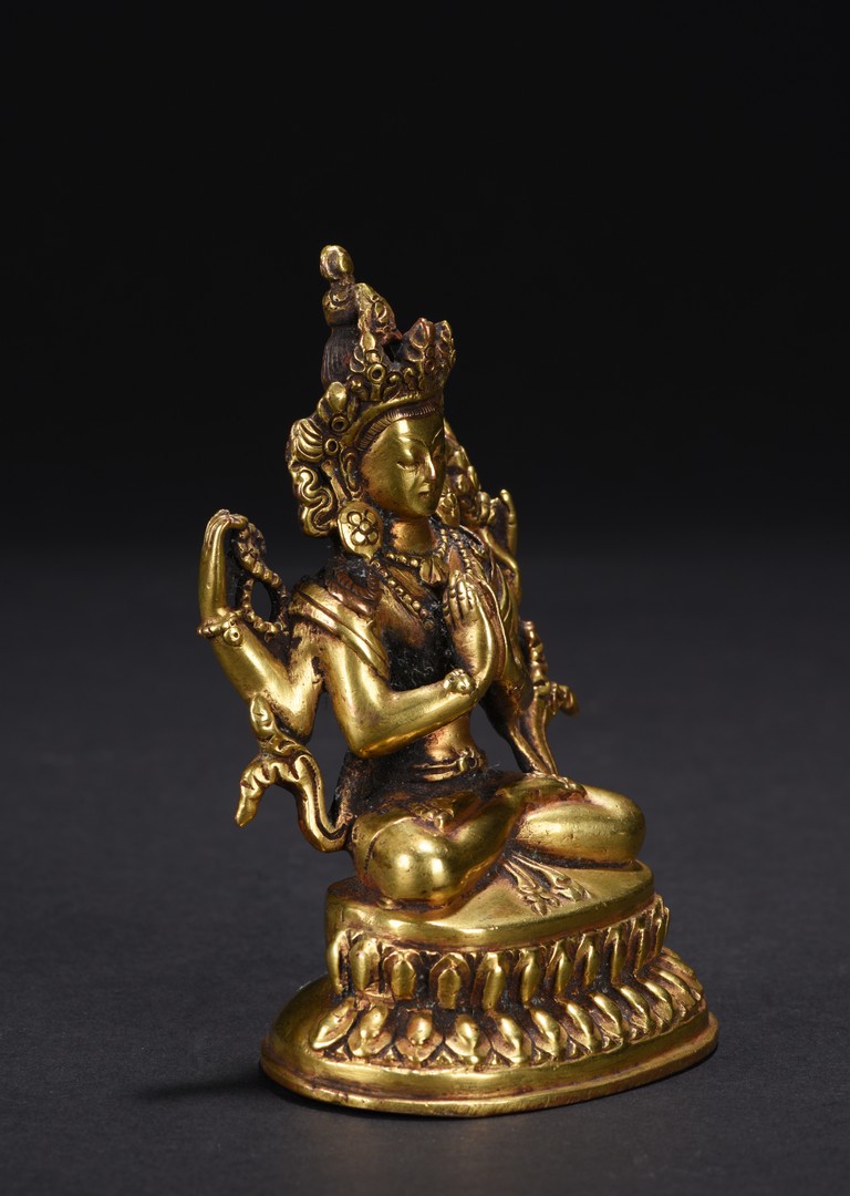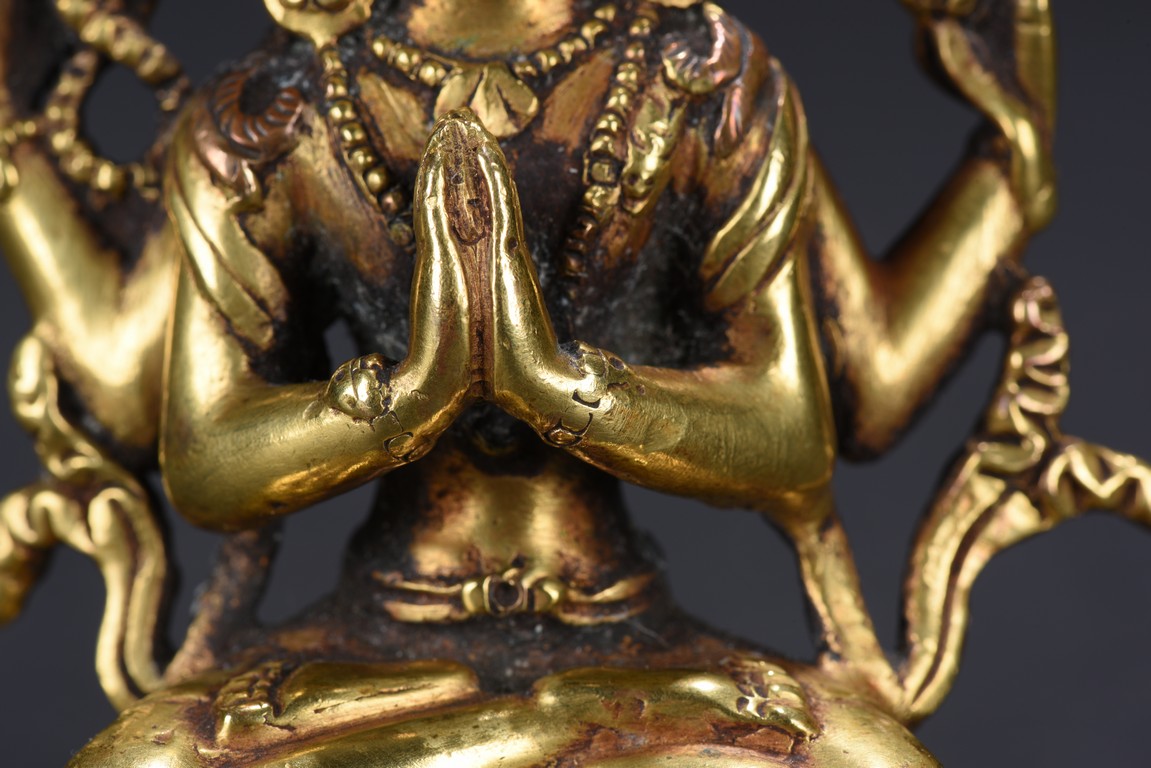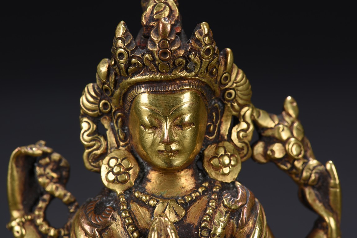 The figure is seated upon a double lotus throne,with primary hands in namaskar mudra and the secondary hands holding a lotus stem,chest adorned with beaded jewelry,the face with benign expression flanked by pendulous ears with circular earrings,topped with pointed crown. Qing Dynasty period.