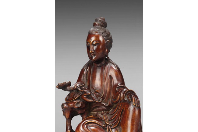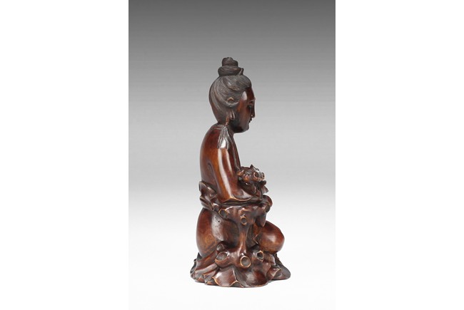 The Guanyin figure is shown seated at ease in peaceful manner. Her left hand rests on left bent knee and right hand holds an Lingzhi ruyi scepter with elbow resting on rock. Wearing an loose and voluminous robe,her face is depicted with an benevolent downcast eyes and her hair is tied in an tall chignon. Qing Dynasty Period.