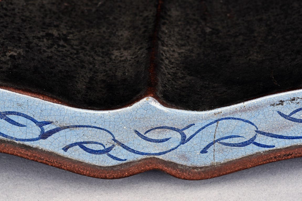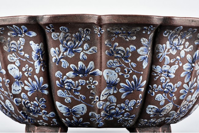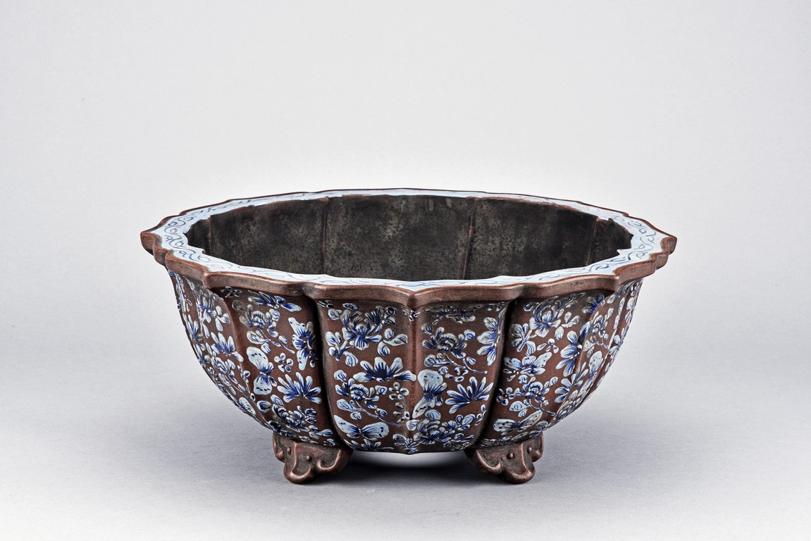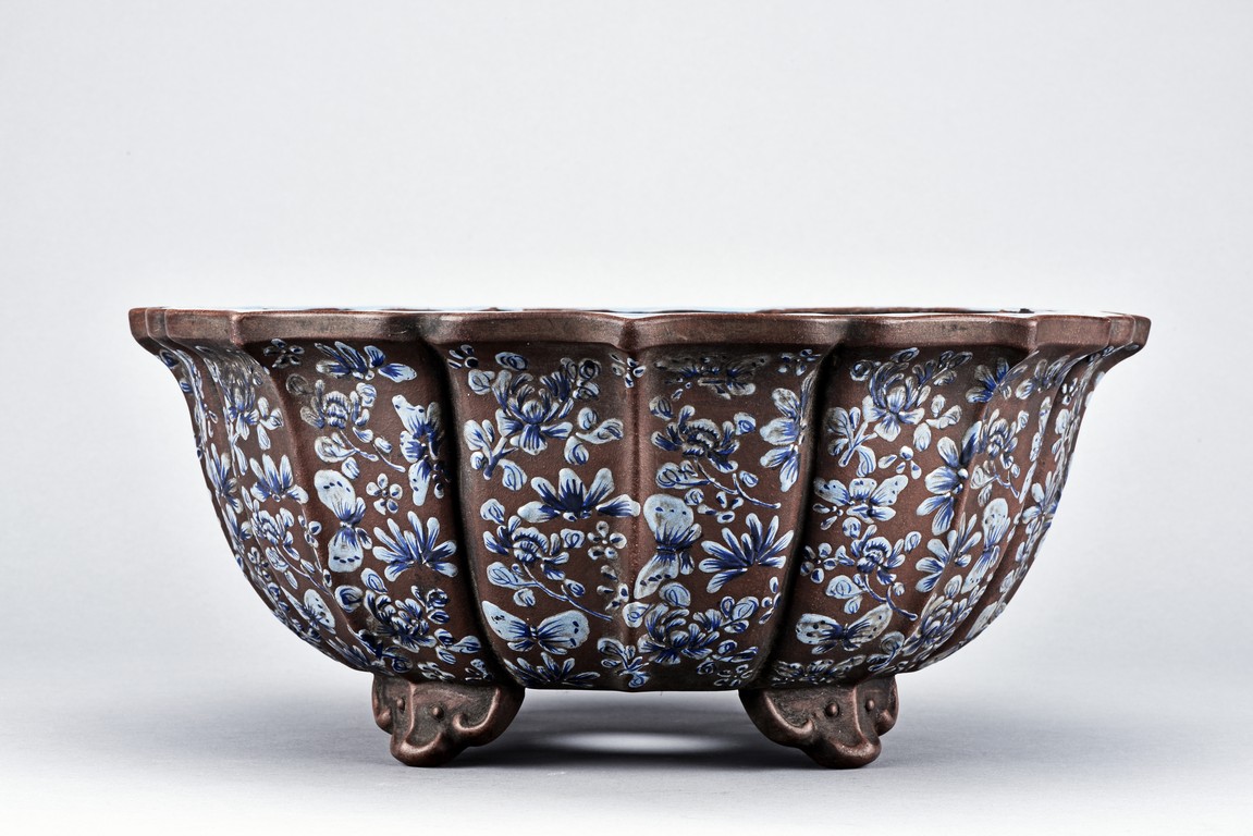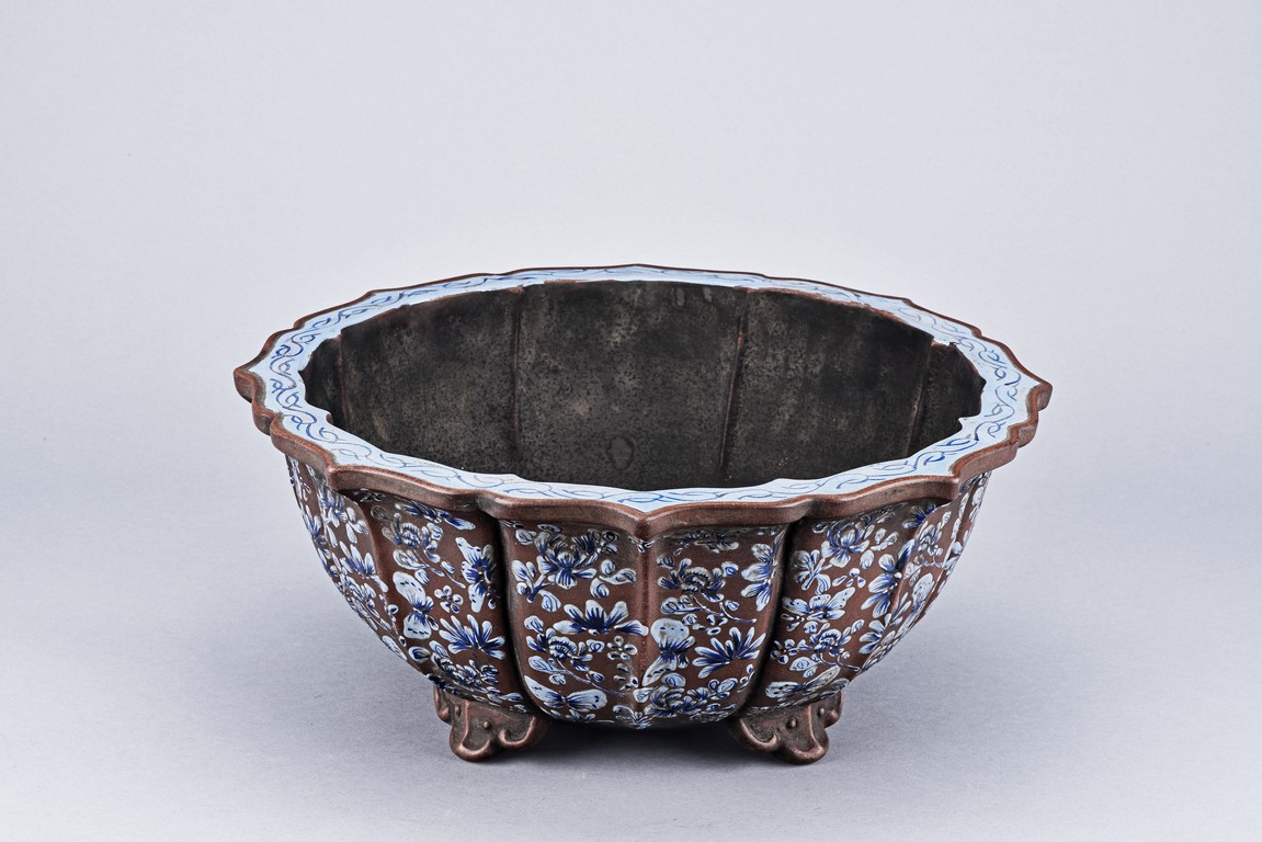 Raised on four short ruyi shaped stubs and rising to barbed and flared rim,the body painted in blue with leafy flowers branches and butterflies. Qing Dynasty period.