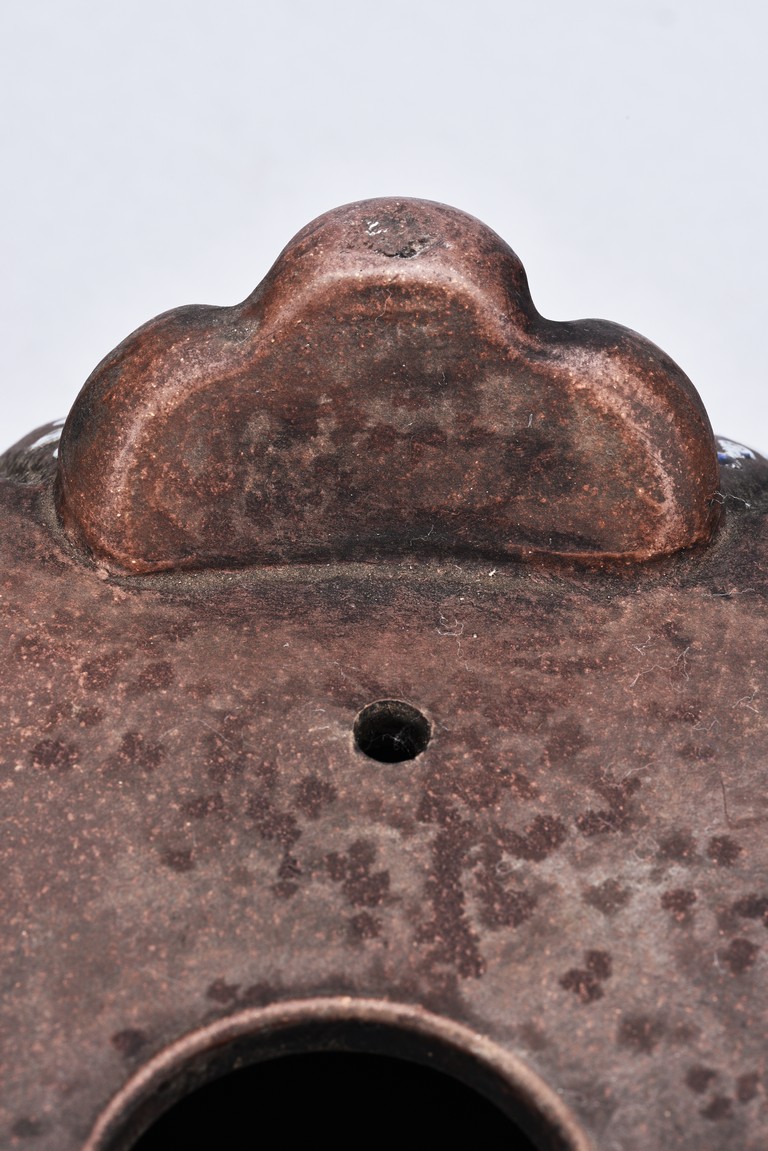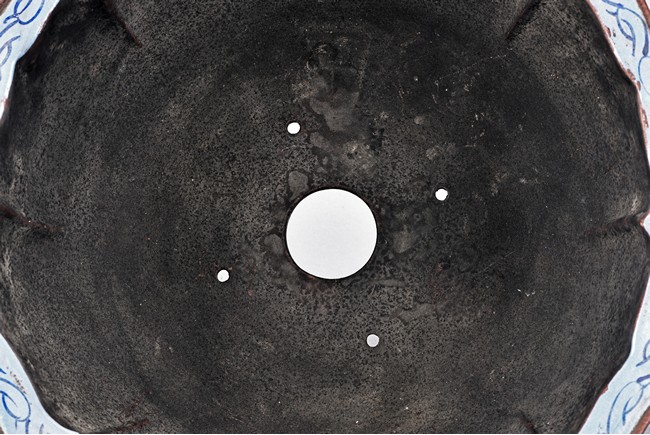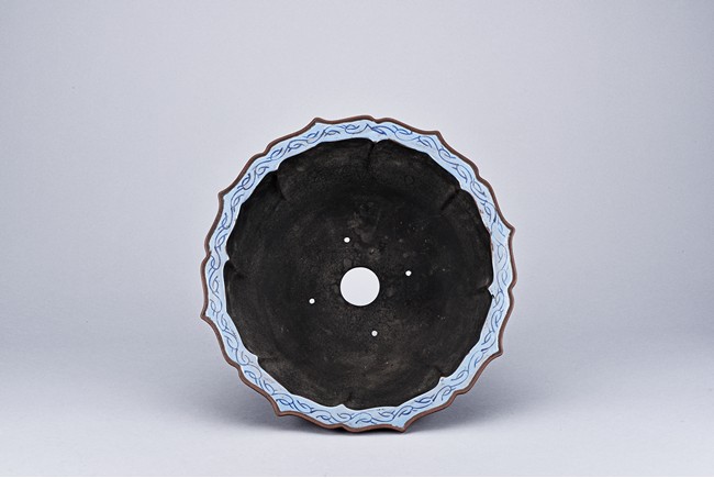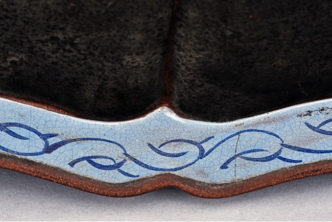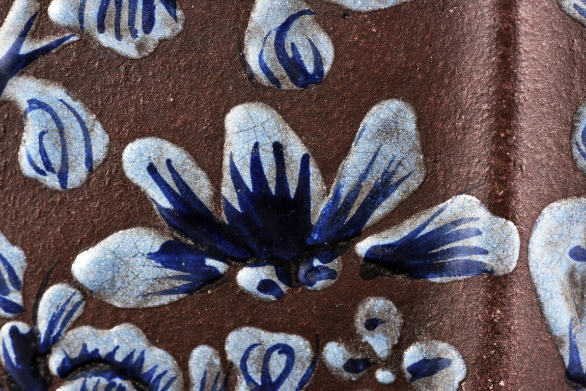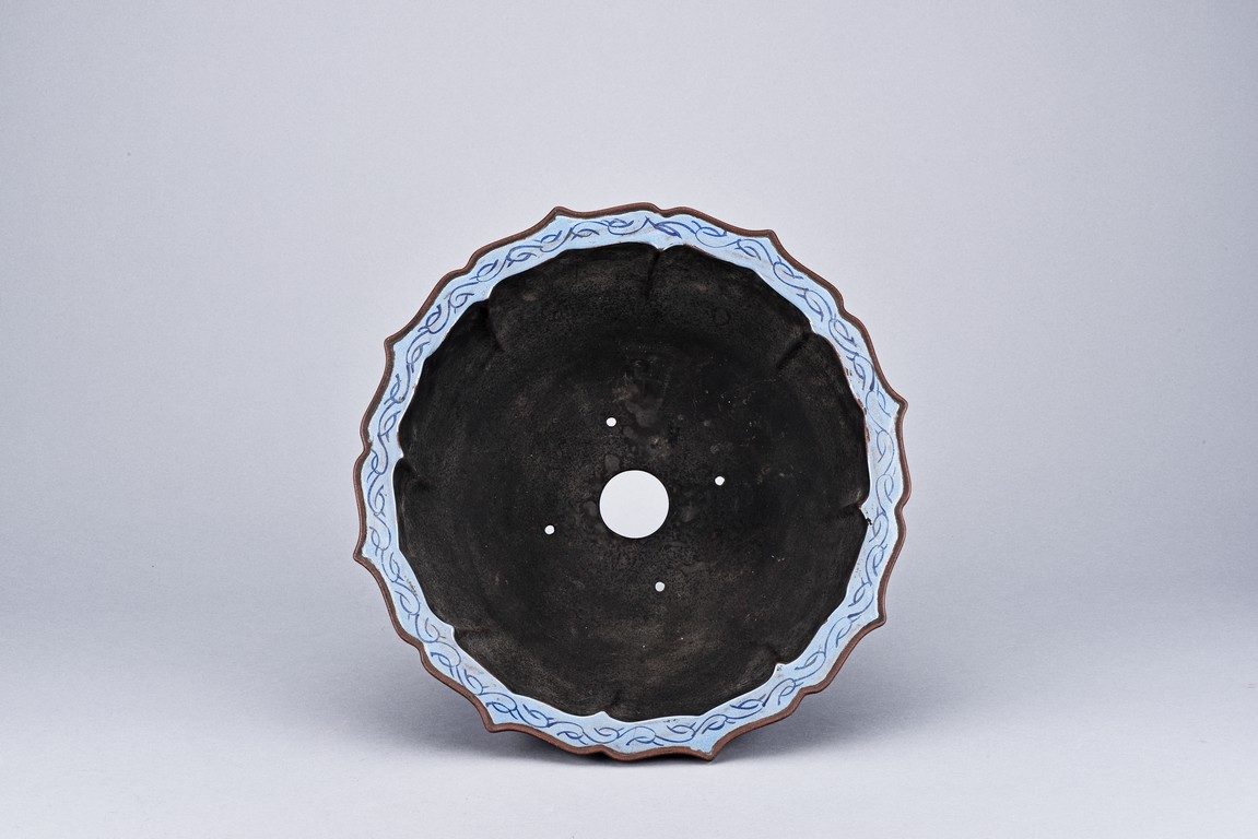 Raised on four short ruyi shaped stubs and rising to barbed and flared rim,the body painted in blue with leafy flowers branches and butterflies. Qing Dynasty period.