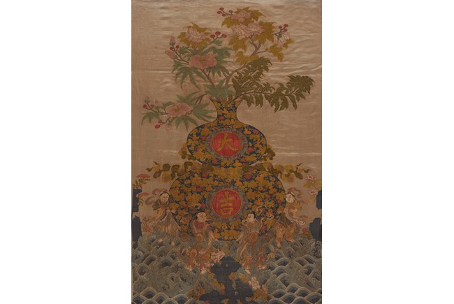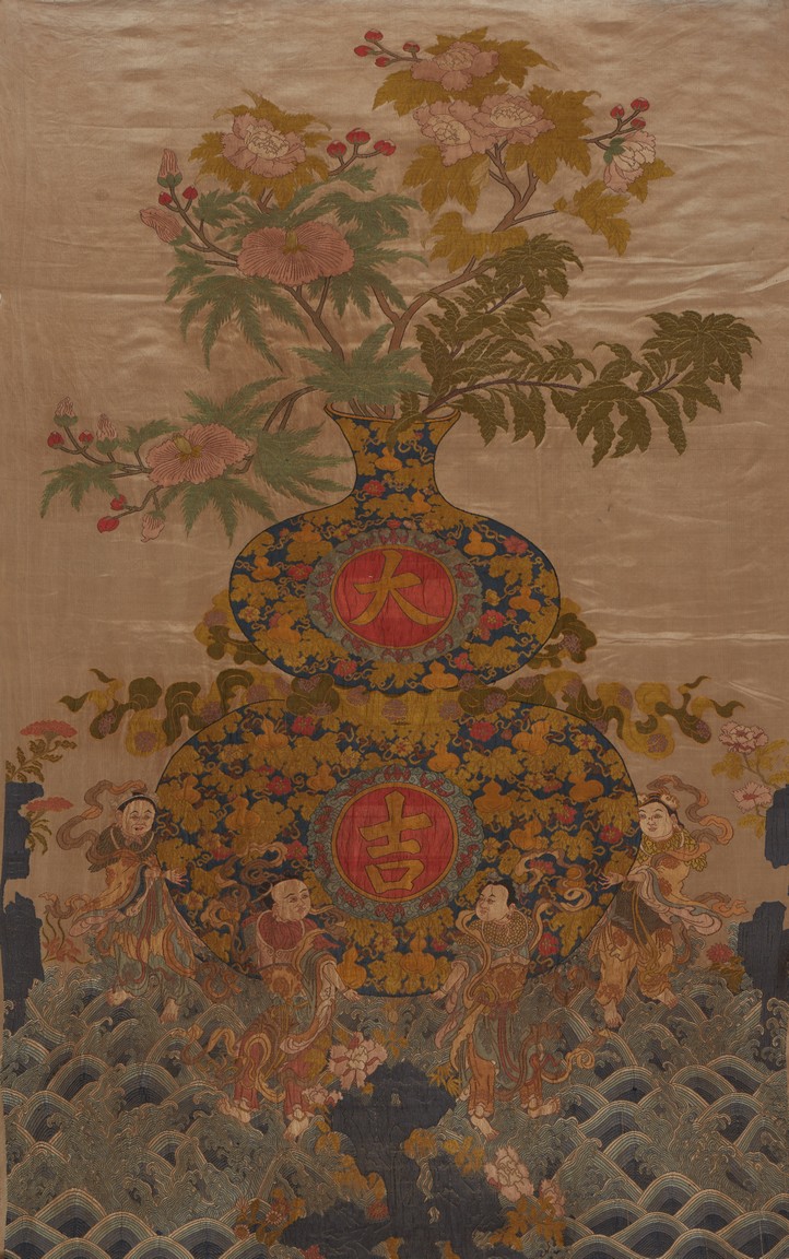 Of vertical rectangular form, the beige ground elaborately embroidered in yellow and blue color of a double gourd vase with round cartouches enclosing bats and clouds around two characters reading DAJI. The vase base surrounded by four immortals in stylized postures amidst crashing waves. Republic period.