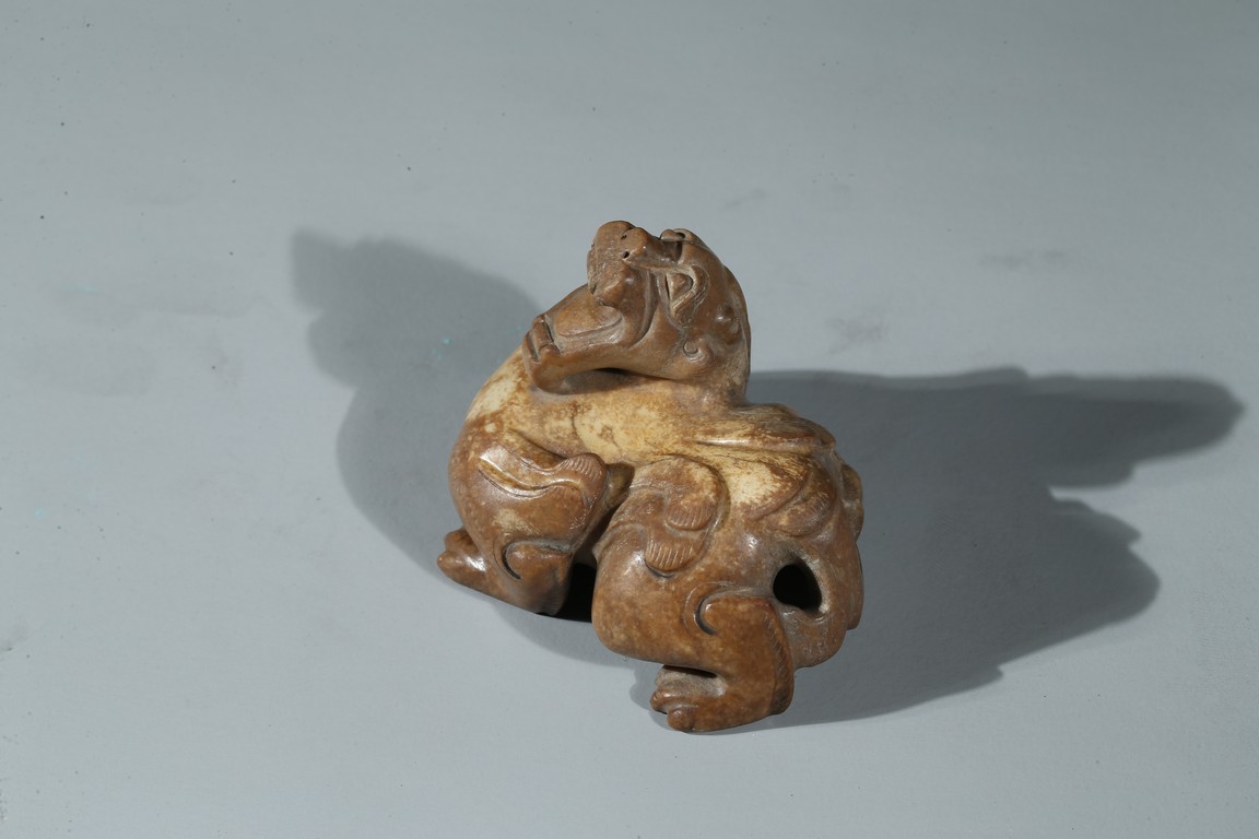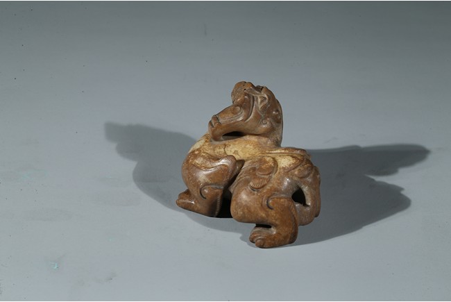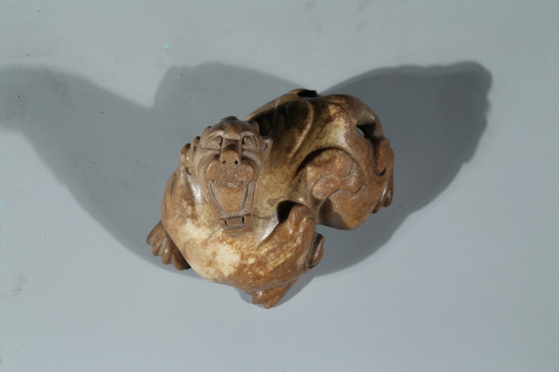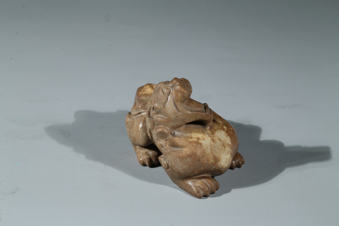 Carved with wings issuing from the muscular front legs with a bifurcated tail, the beast's head with opened jaws depicting a ferocious facial expression framed by beard, the yellowish white stone with calcified opaque brown areas. Han Dynasty period.