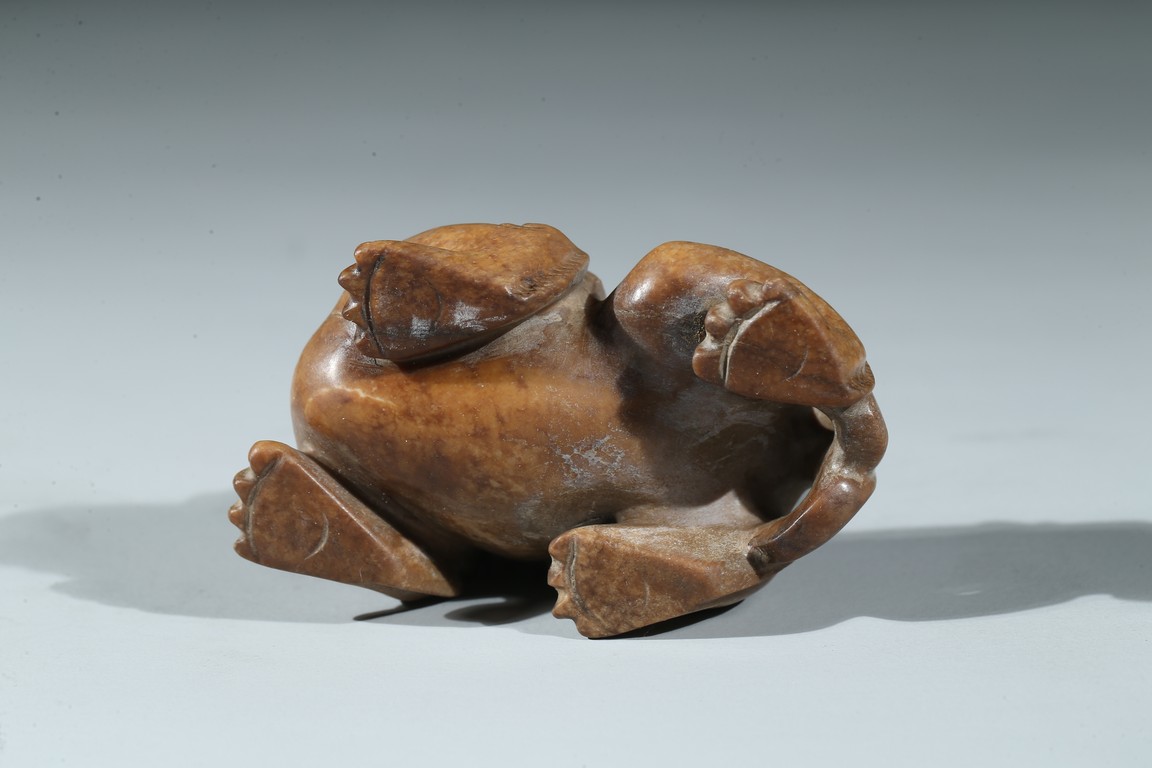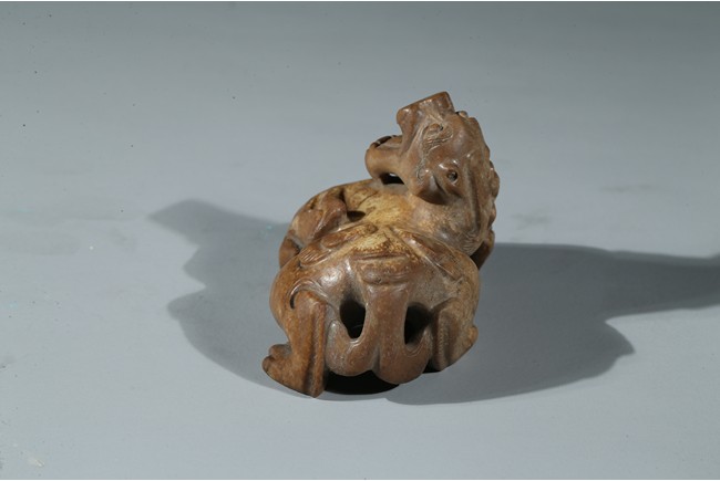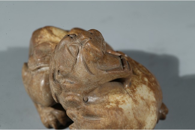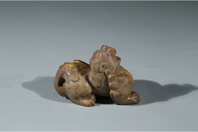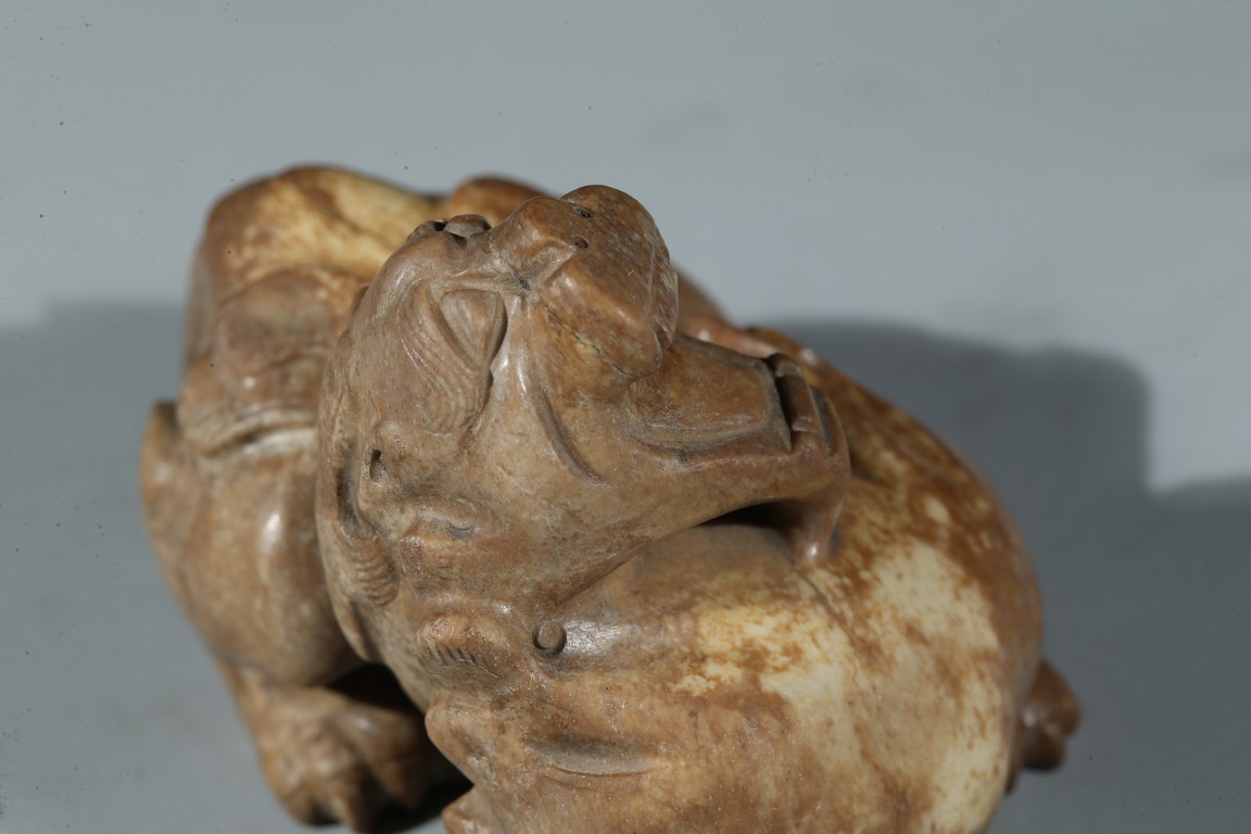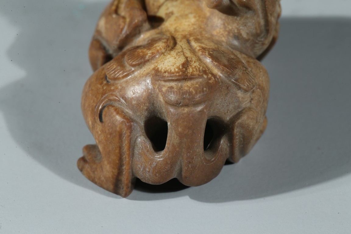 Carved with wings issuing from the muscular front legs with a bifurcated tail, the beast's head with opened jaws depicting a ferocious facial expression framed by beard, the yellowish white stone with calcified opaque brown areas. Han Dynasty period.