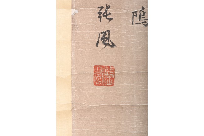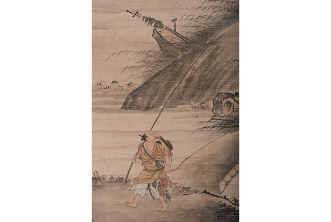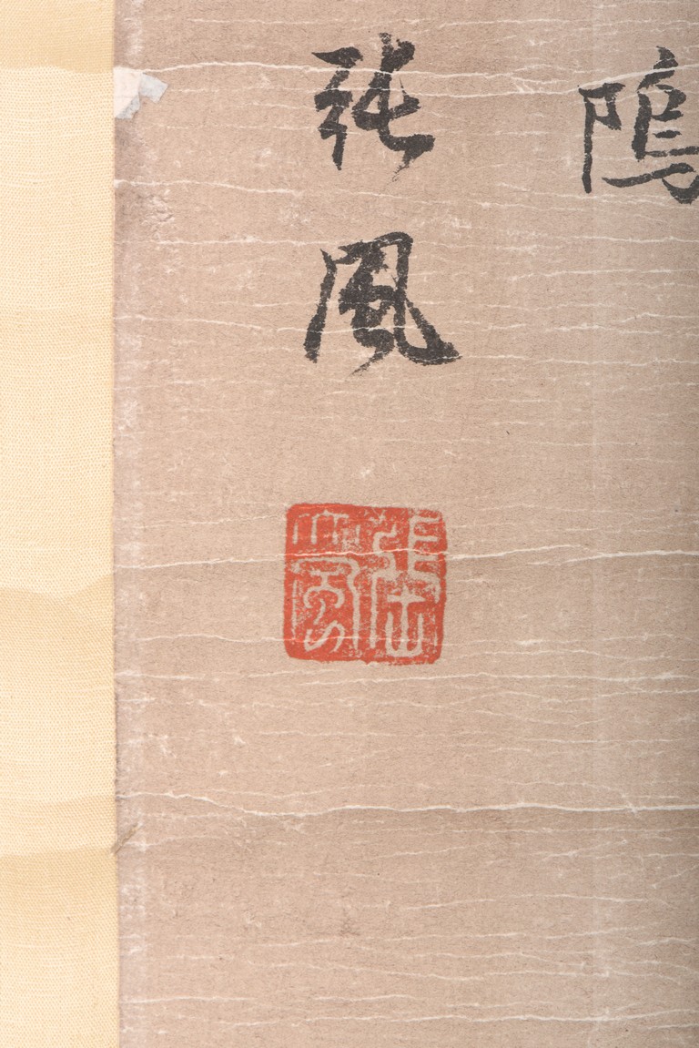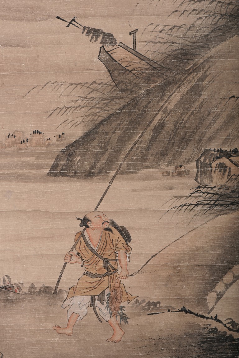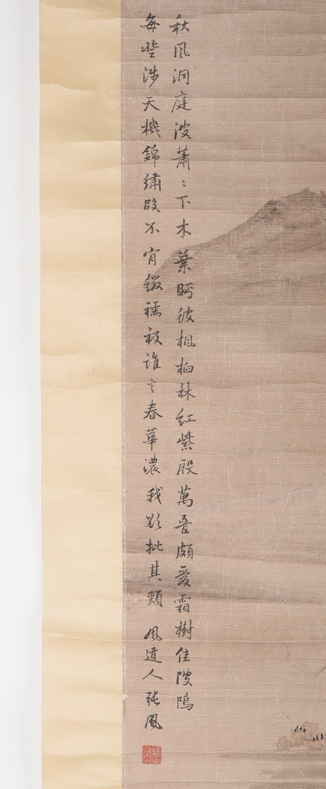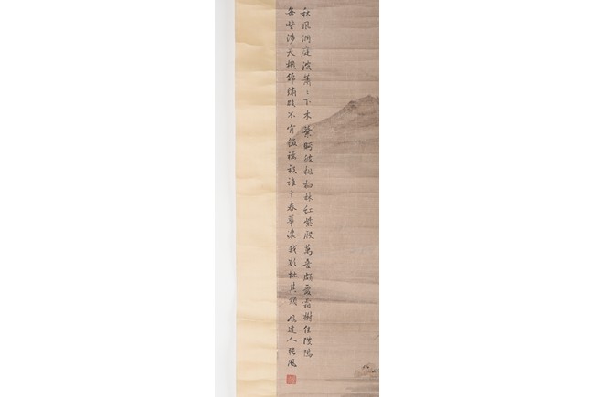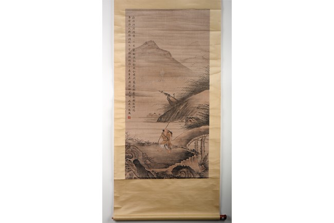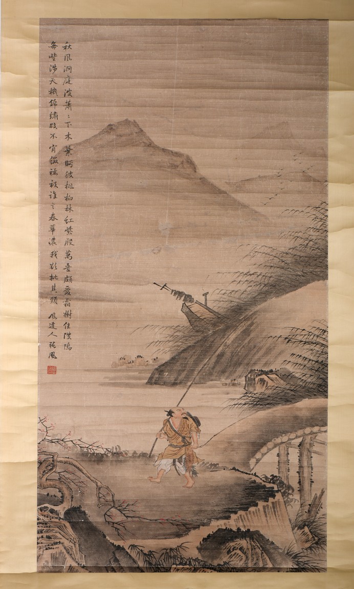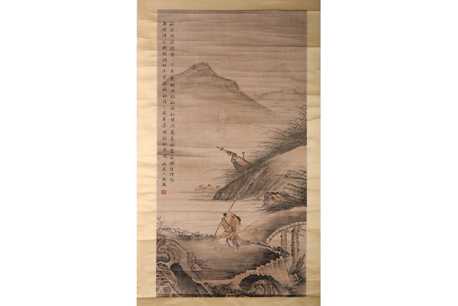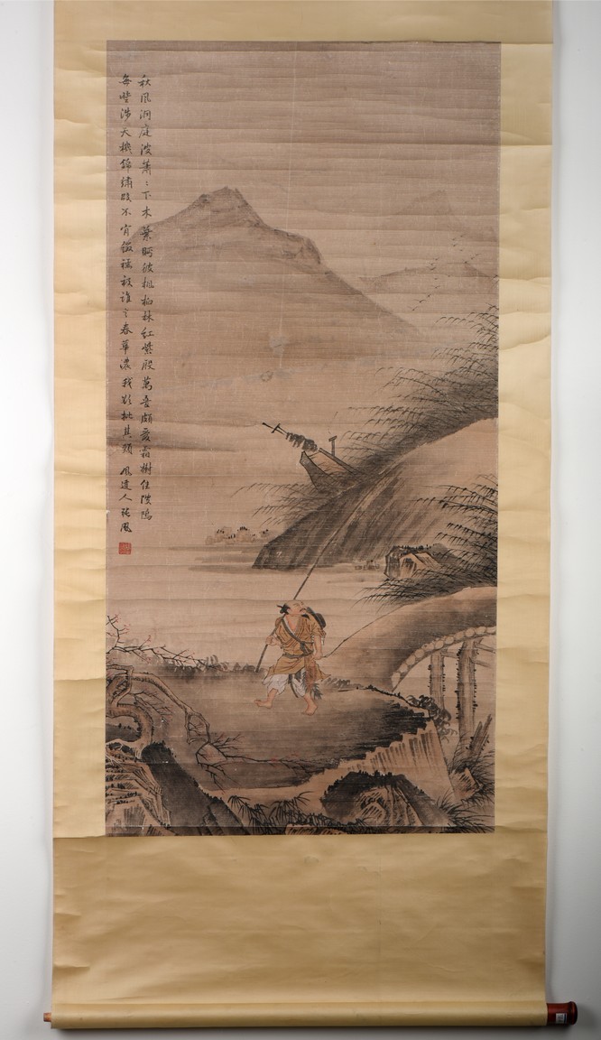 Color and ink on paper. Figure and landscape. Hanging scroll. Inscribed and signed,with one seal of the artist.