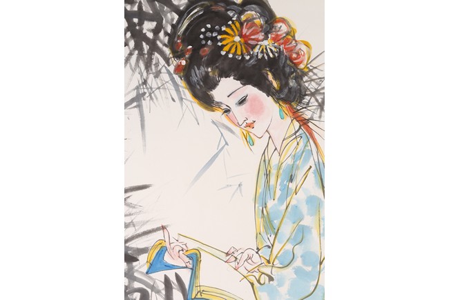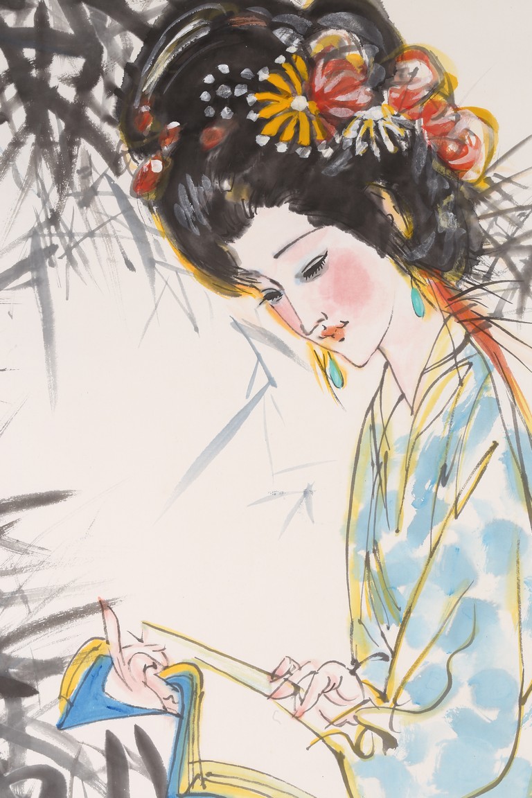 color and ink on paper. lady. Mounted for framing. Named and signed Lin Yong,with one seal of the artist.