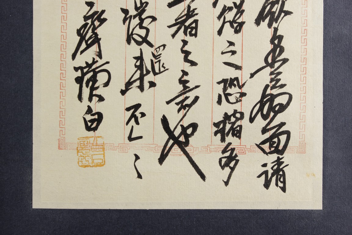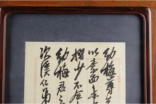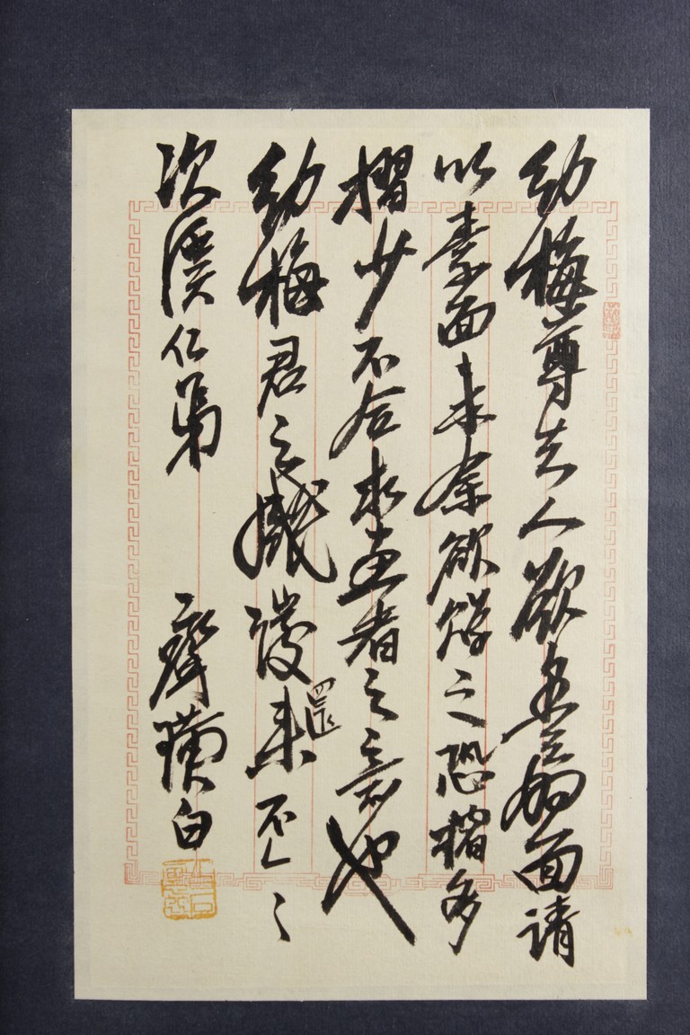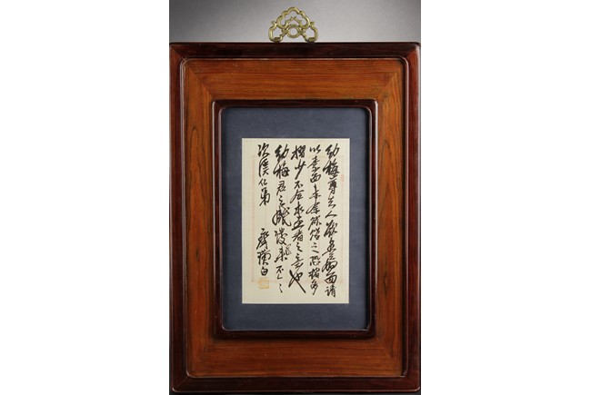 Ink on paper. Rosewood Framed. A letter with five lines of calligraphy written by Qi Baishi to 'Youmei',with artist signature Qi Baishi and mark on bottom left.