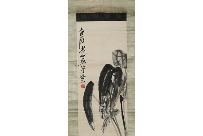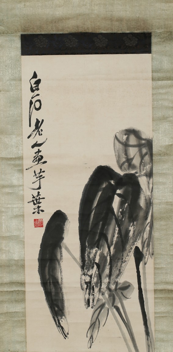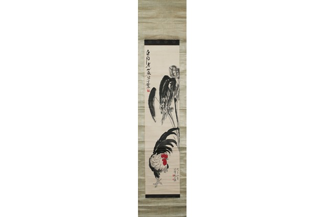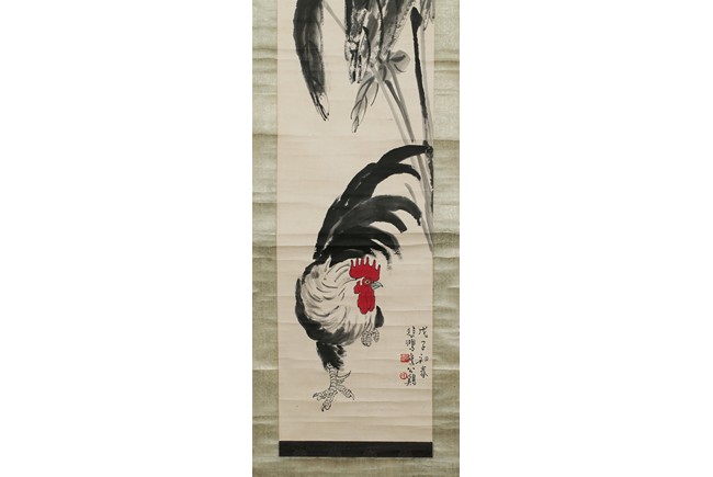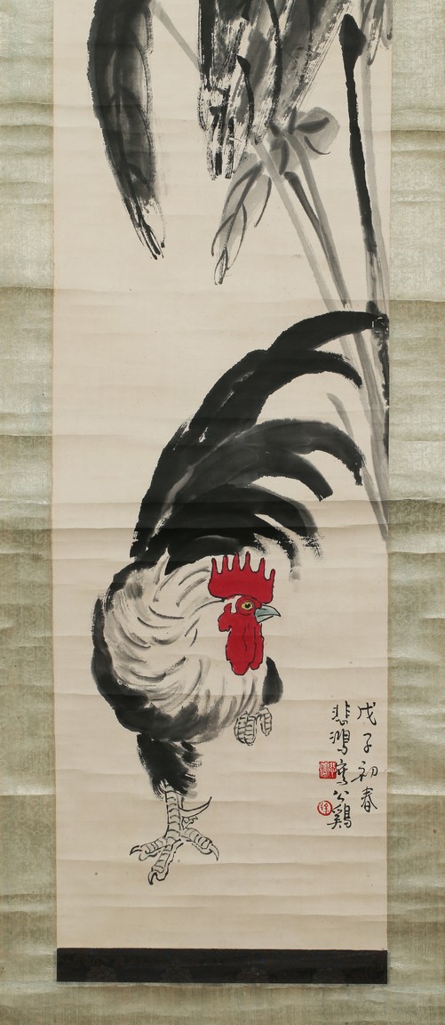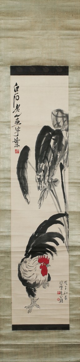 Color and ink on paper. Rooster and Taro leaves. Inscribed and signed,with two seals of Xu Beihong and one seal of Qi Baishi,dated to Spring of 1948.