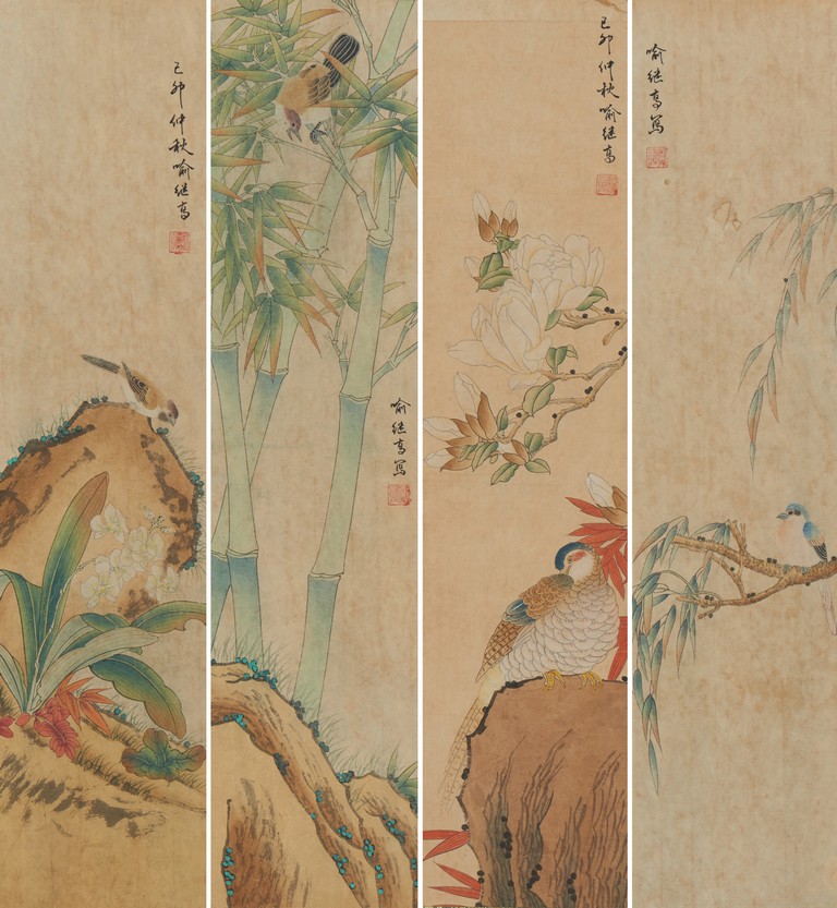 Color and ink on paper. A set of four birds painting. Inscribed and signed Yu JiGao, with four seals of the artist.