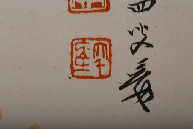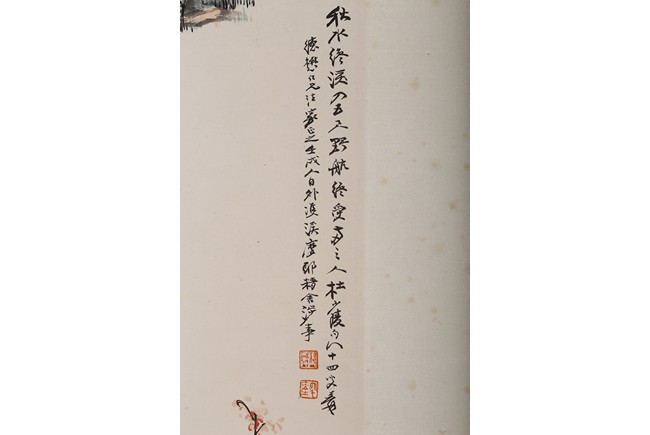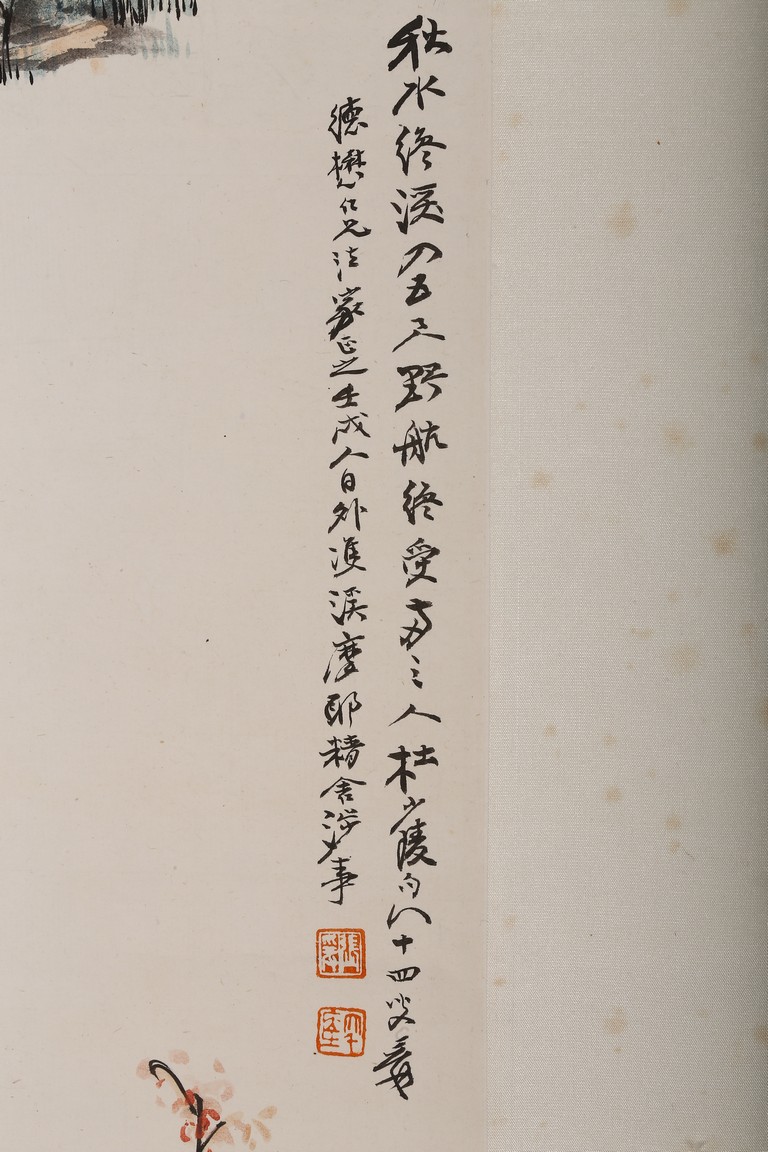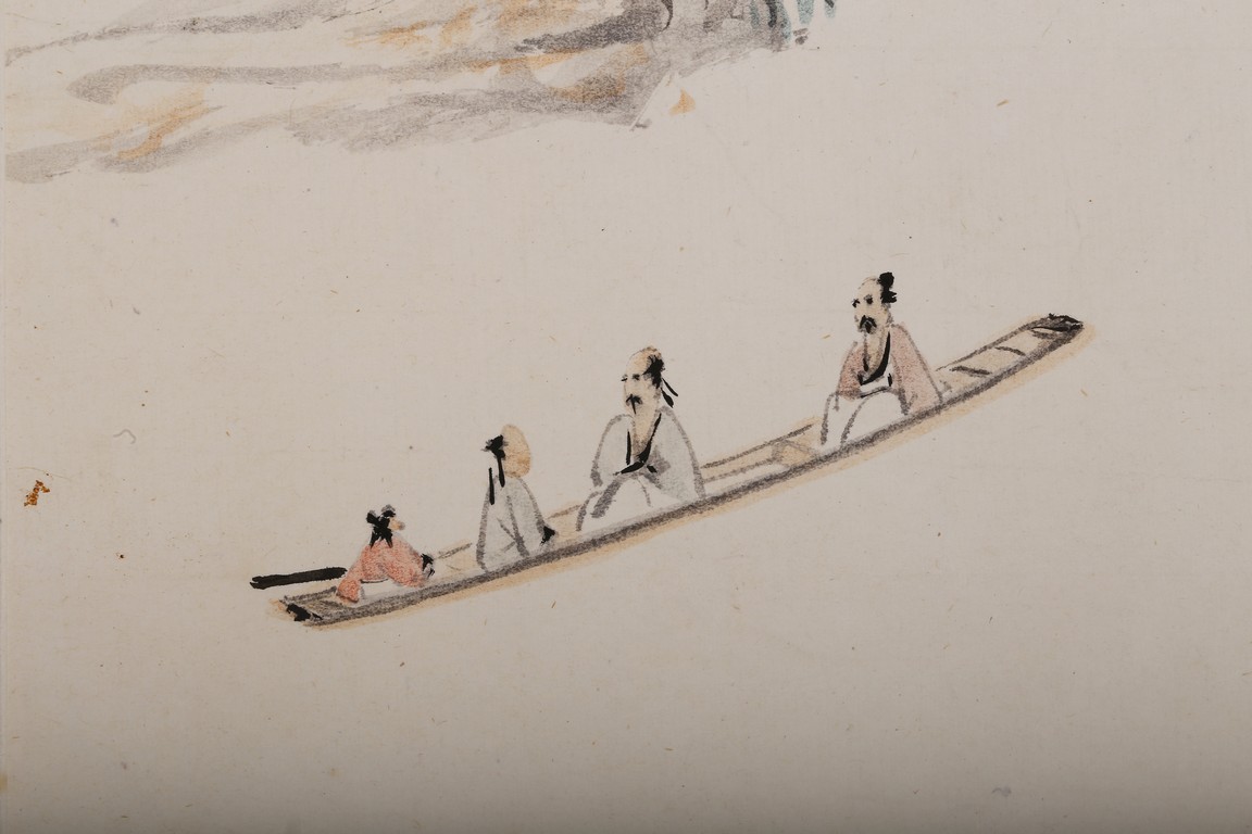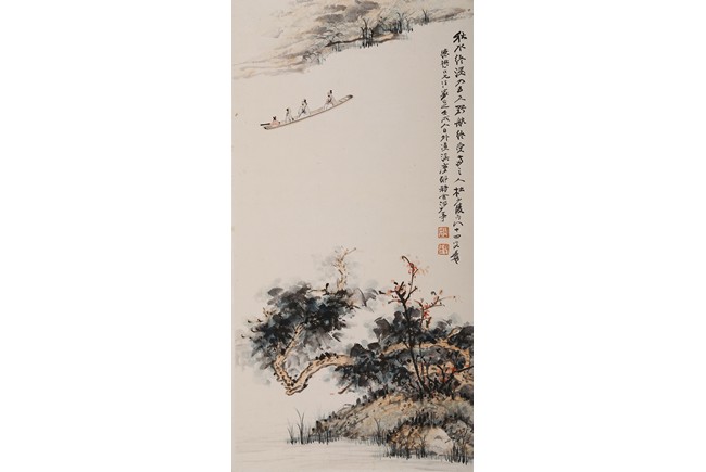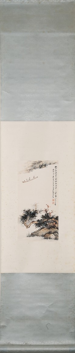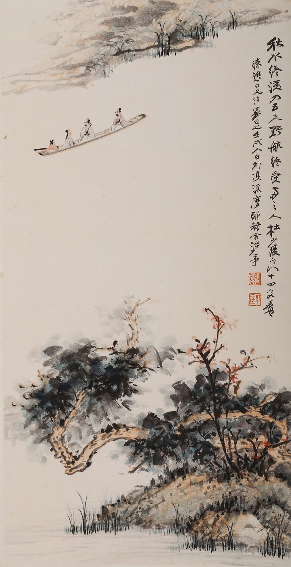 Color and ink on paper. Hanging scroll. figures on boat. Inscribed,with two seals of the artist.