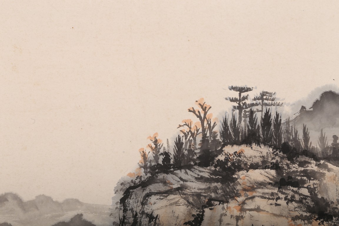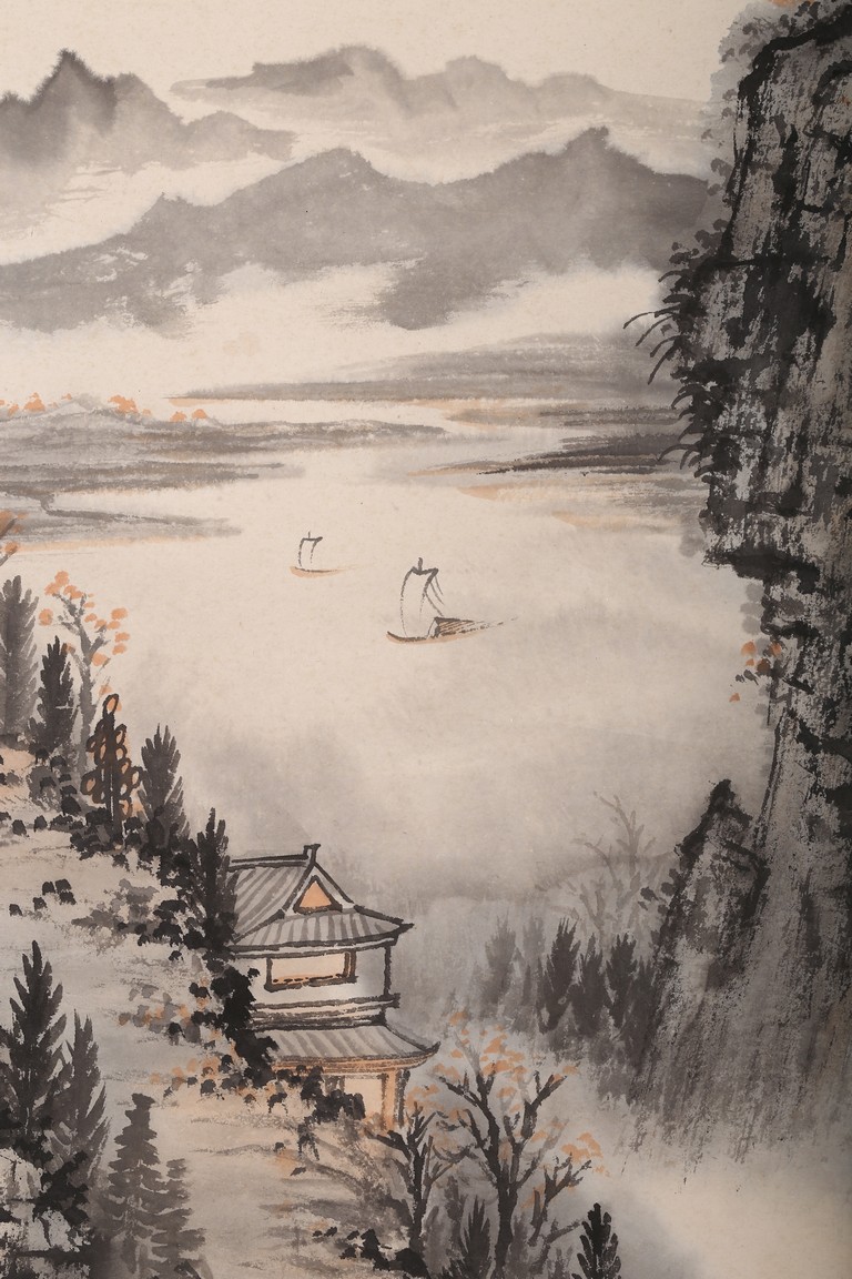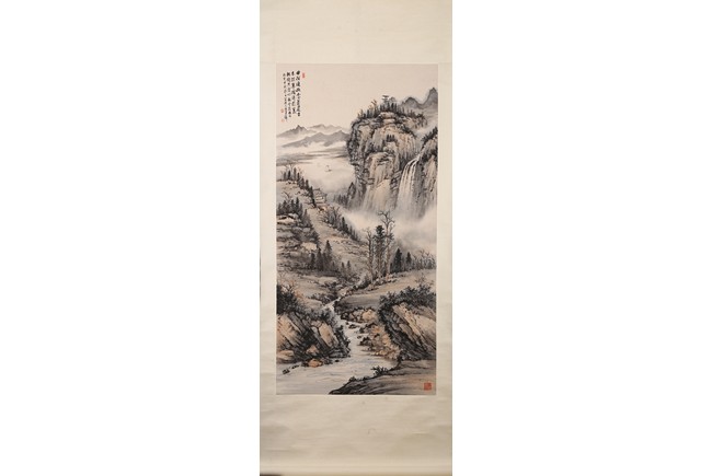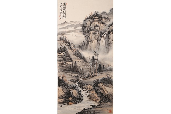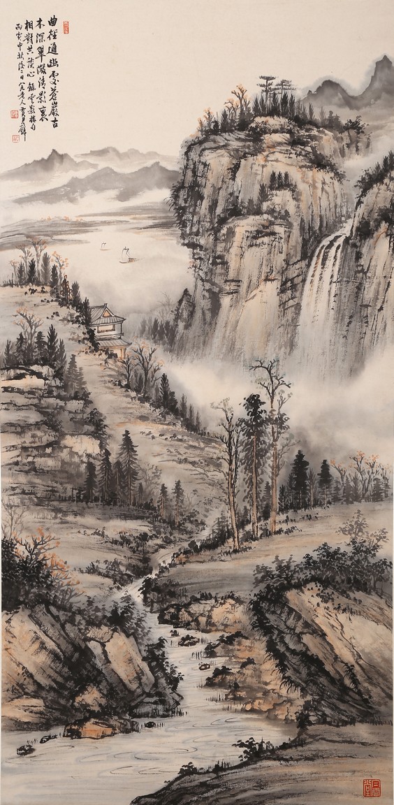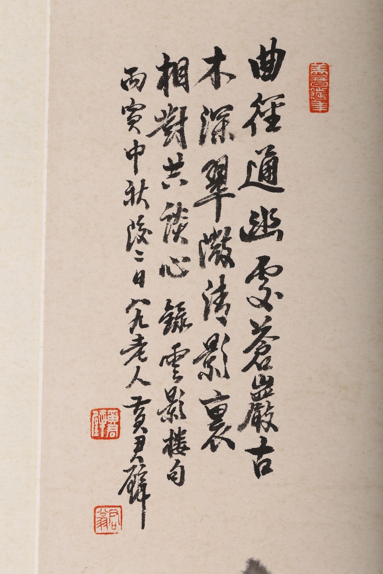 Color and ink on paper. Hanging scroll. landscape. Inscribed and signed,with four seals of the artist.