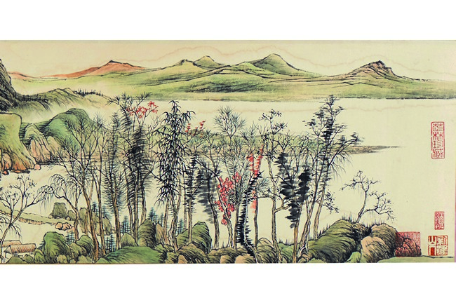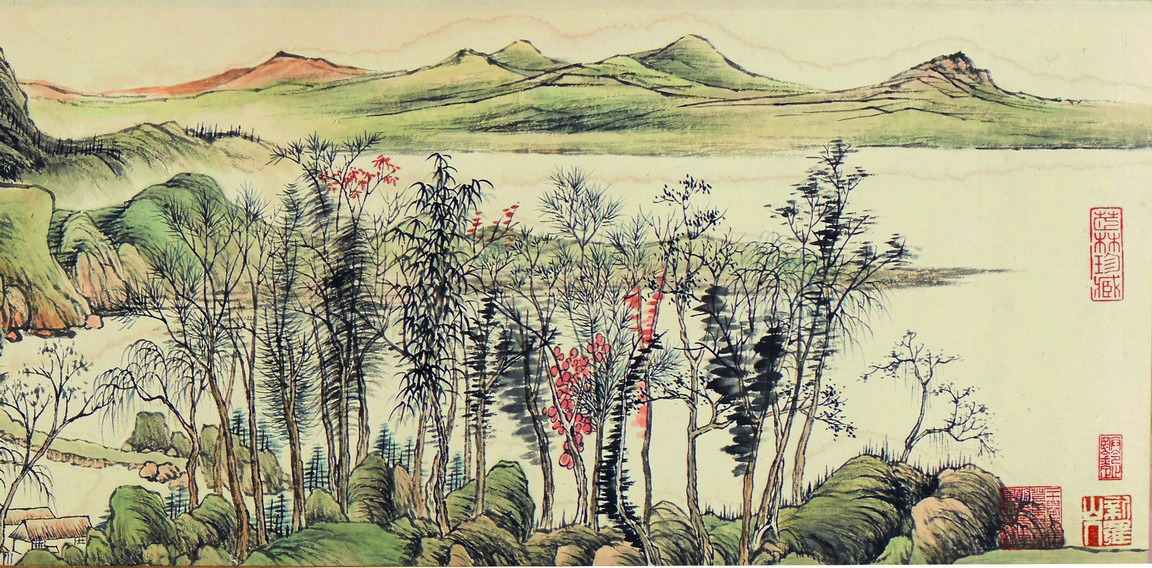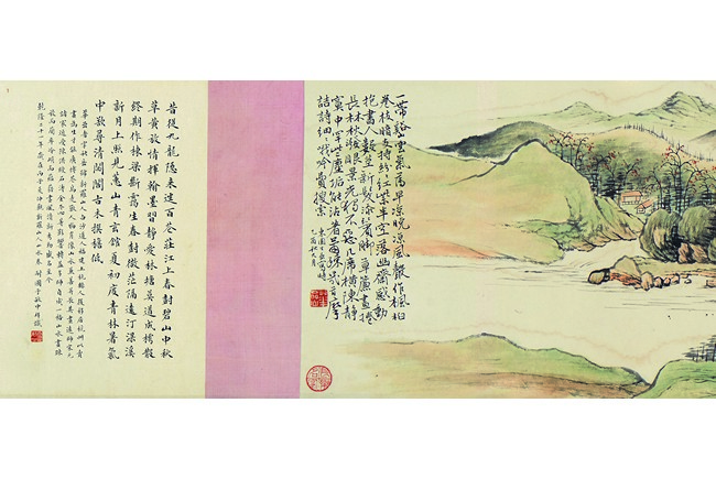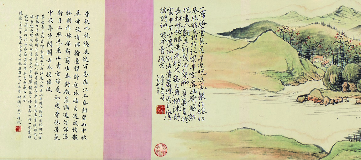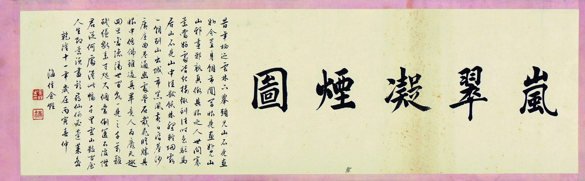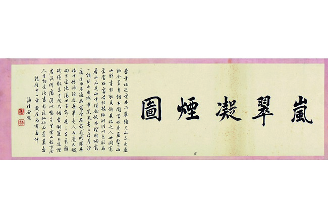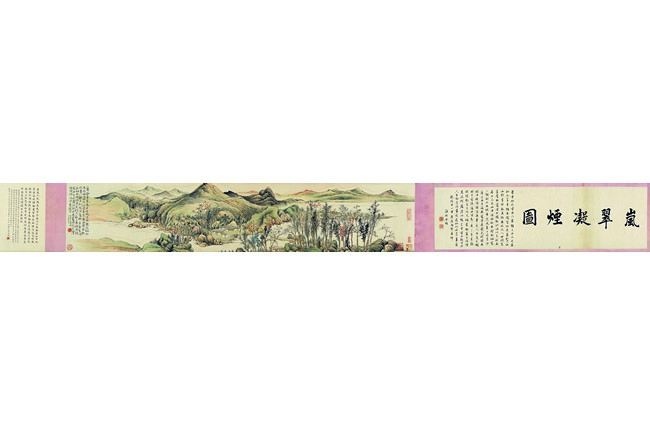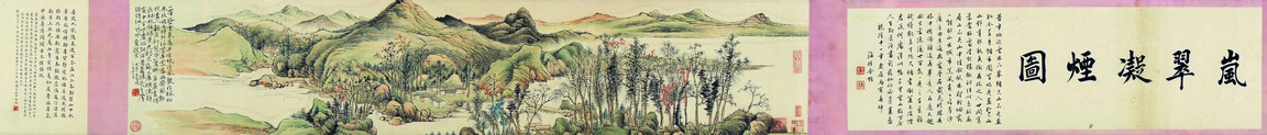 HUA YAN: INK AND COLOR ON PAPER LANDSCAPE HANDSCROLL 華喦 嵐翠凝煙圖 設色紙本 手卷