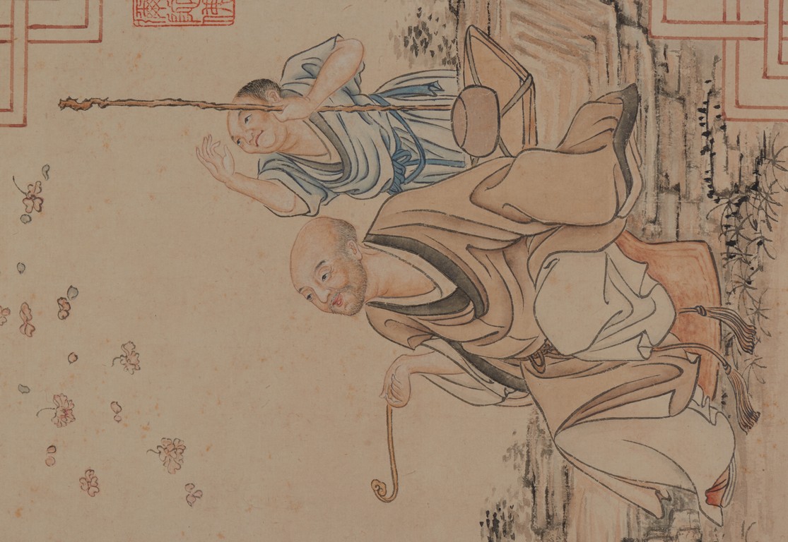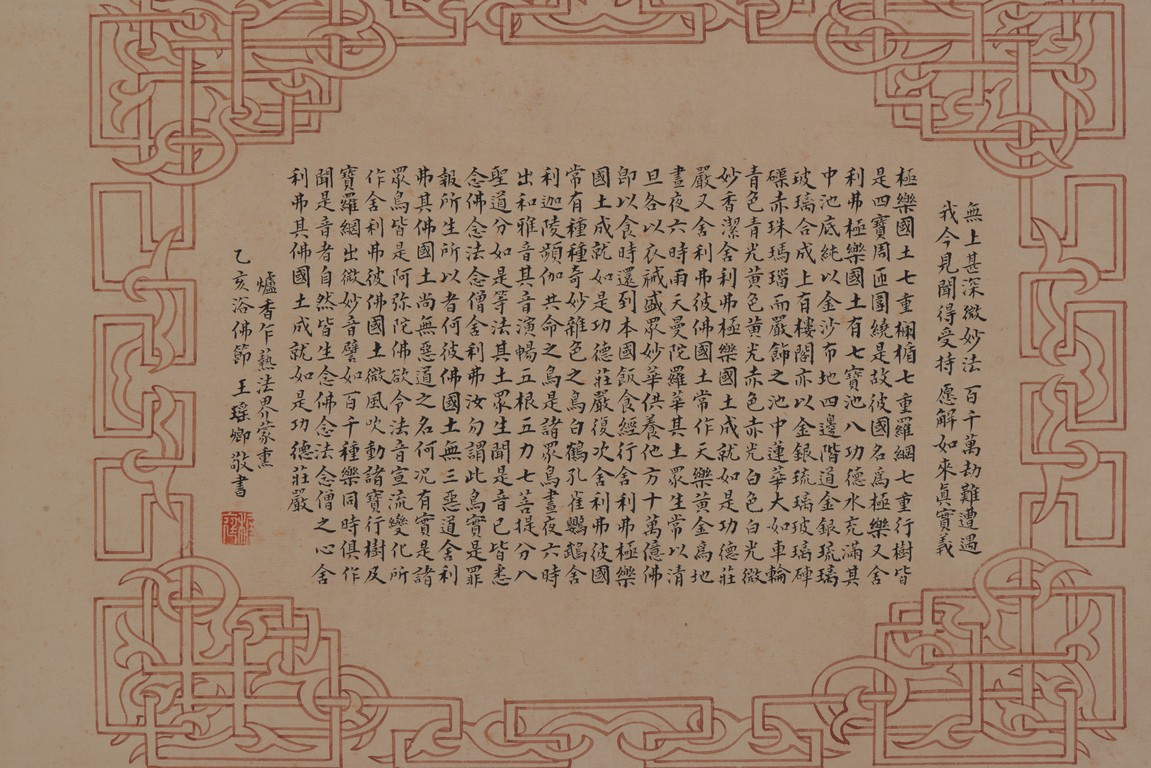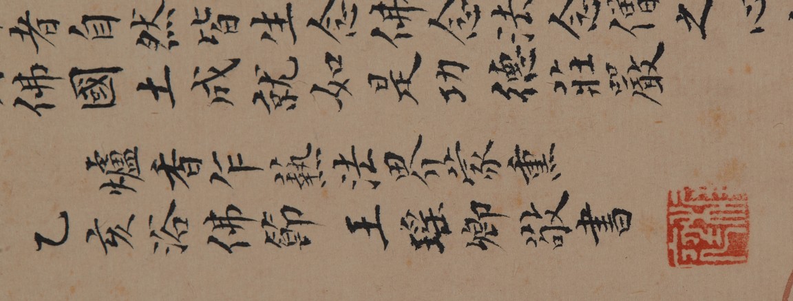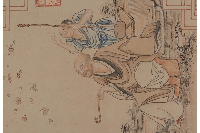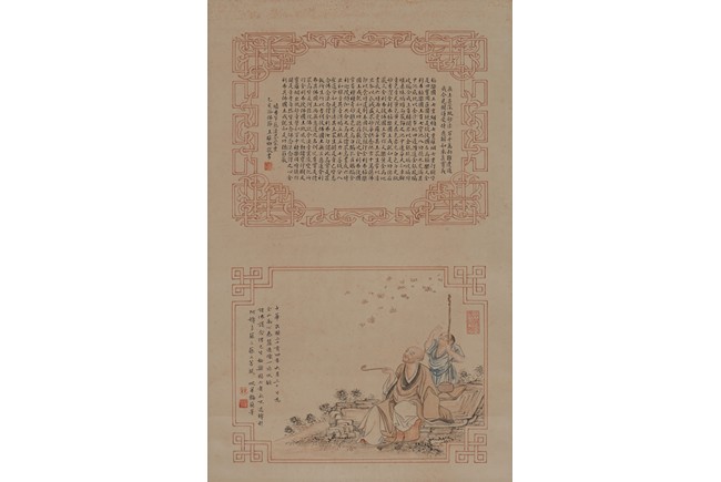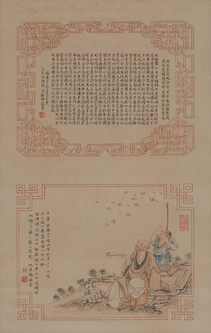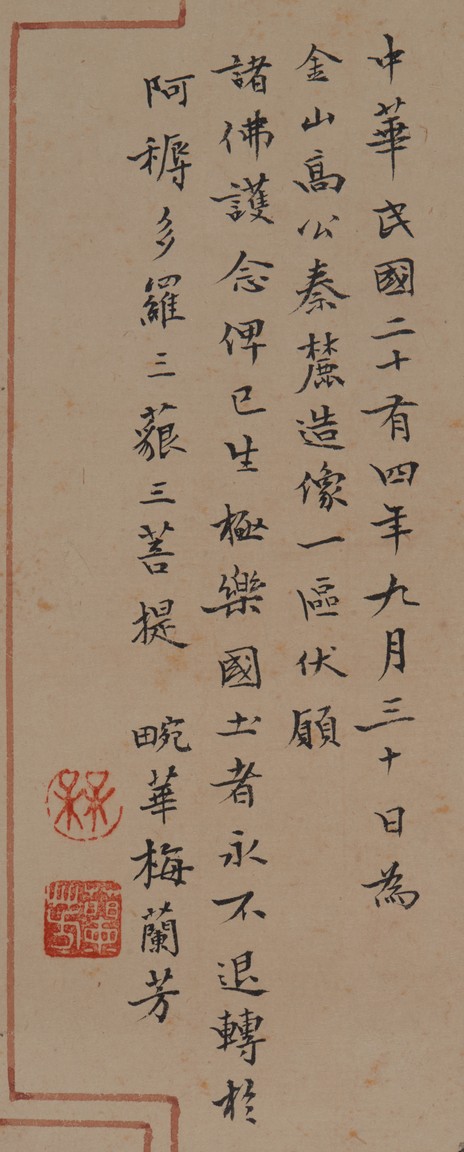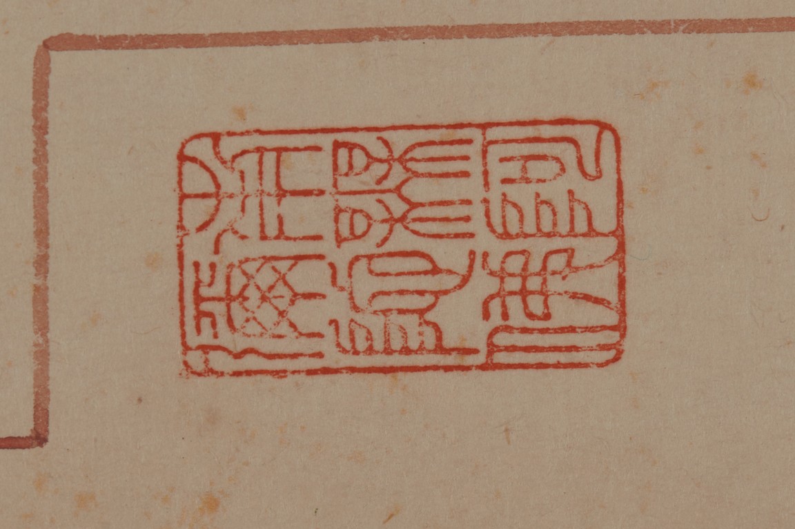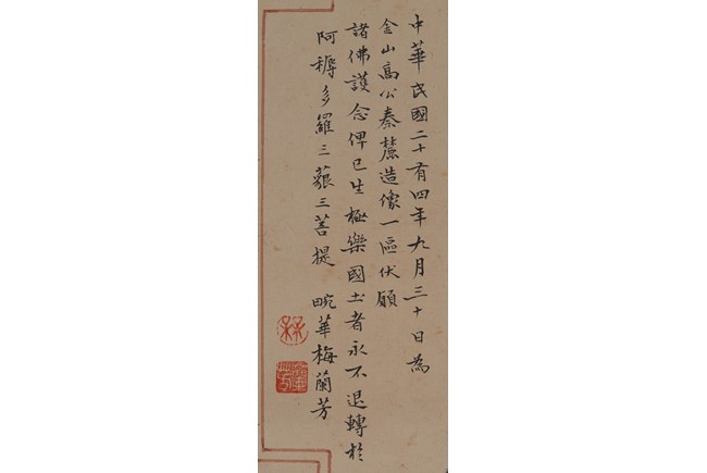 Color and ink on paper. Figures. Mounted for framing. Inscribed and signed Mei lanfang, with three seals of the artist. Colophon inscribed and signed Wang yaoqing, with one seal of the artist.
